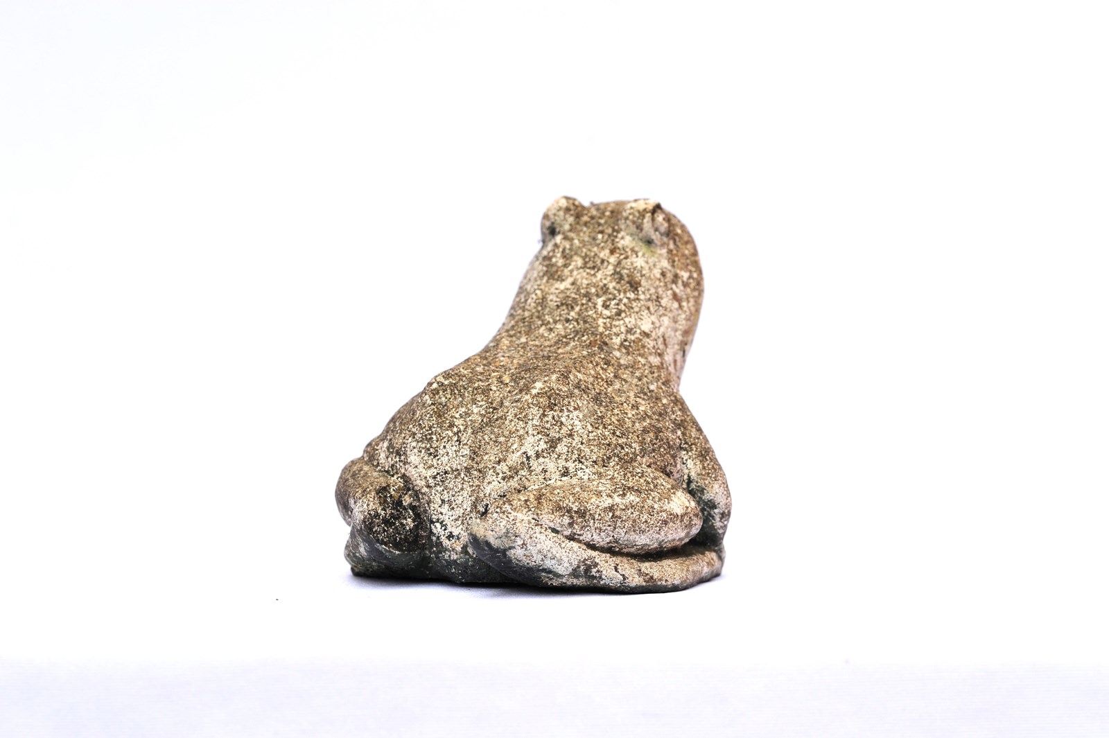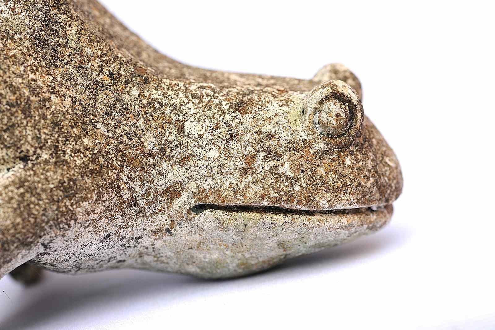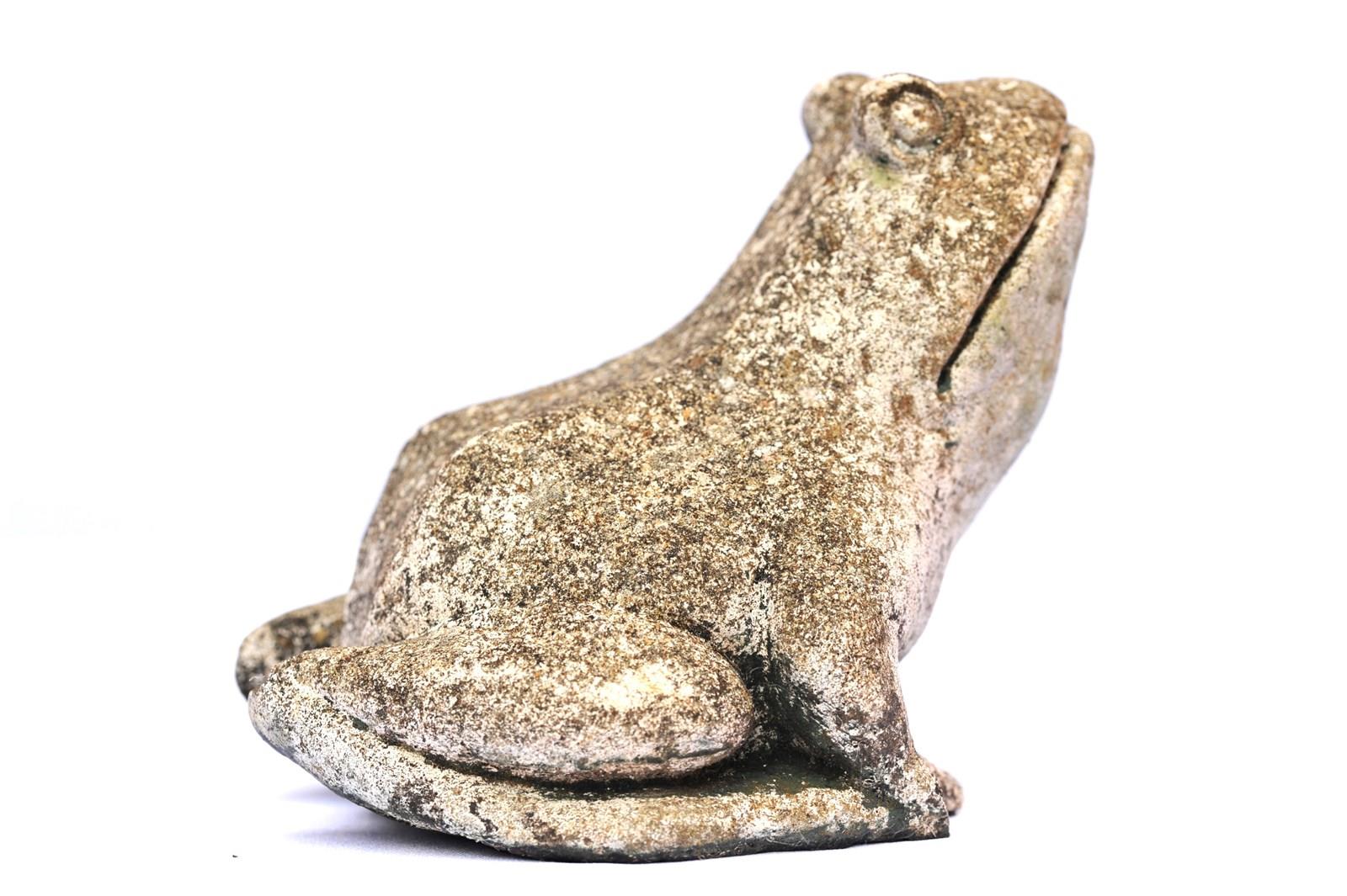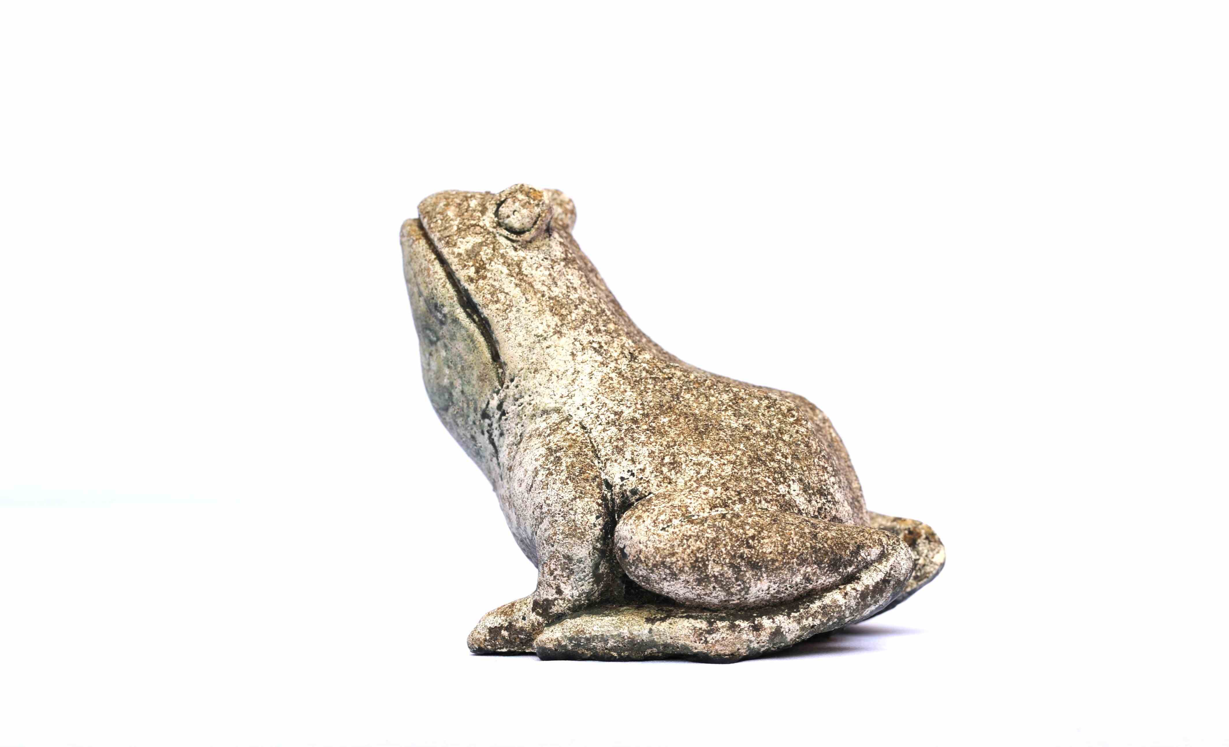 Vintage cast stone frog garden ornament. Weathered with historic knocks & wear. Height 5 inches. Weight: 1.5 kg. Free UK inland delivery.