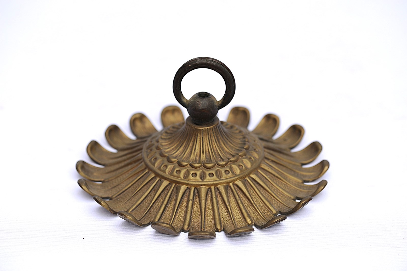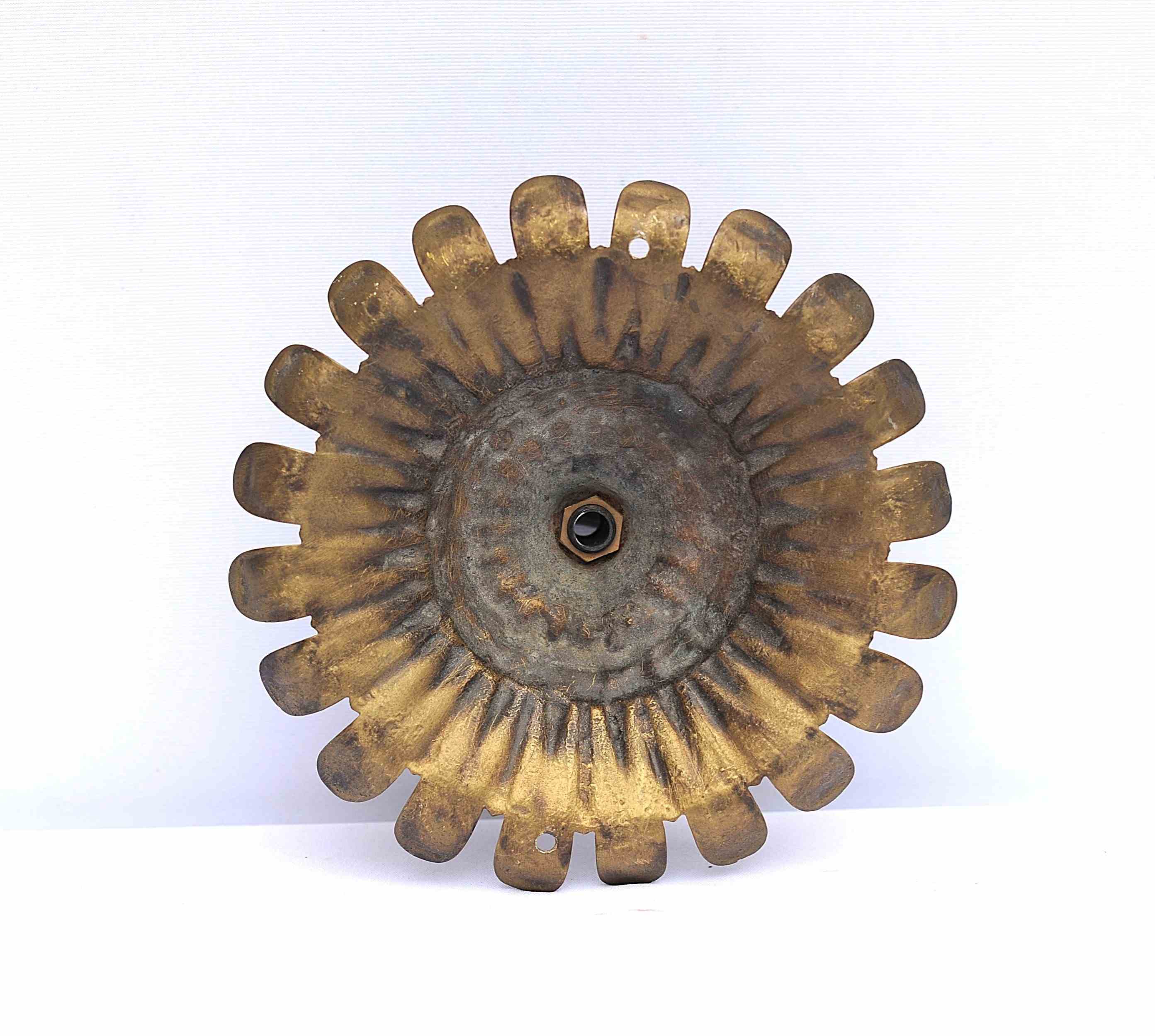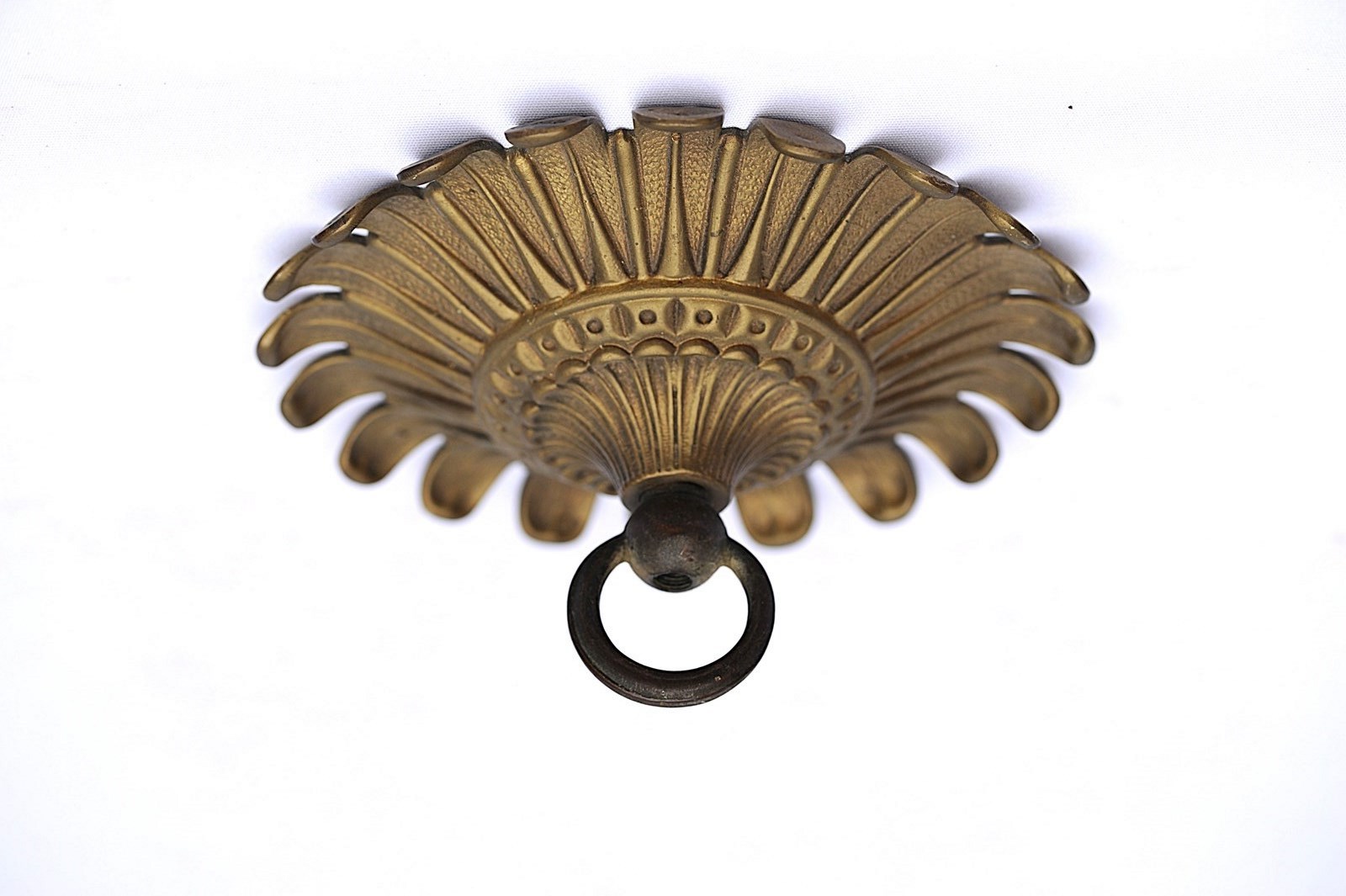 A wonderfully ornate large antique brass ceiling rose hook. Reclaimed. Early 1900s in date. Approximately 8 inches in diameter. Three quarters of a kilo in weight. Old untouched good condition with a nice colour. Sale includes delivery within the United Kingdom.