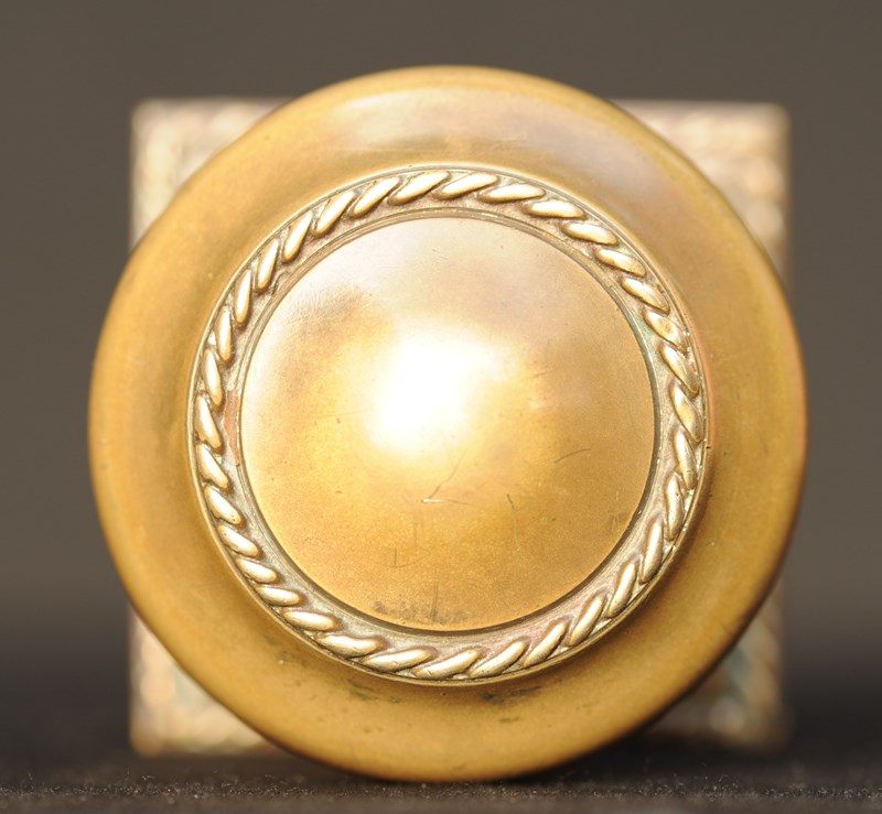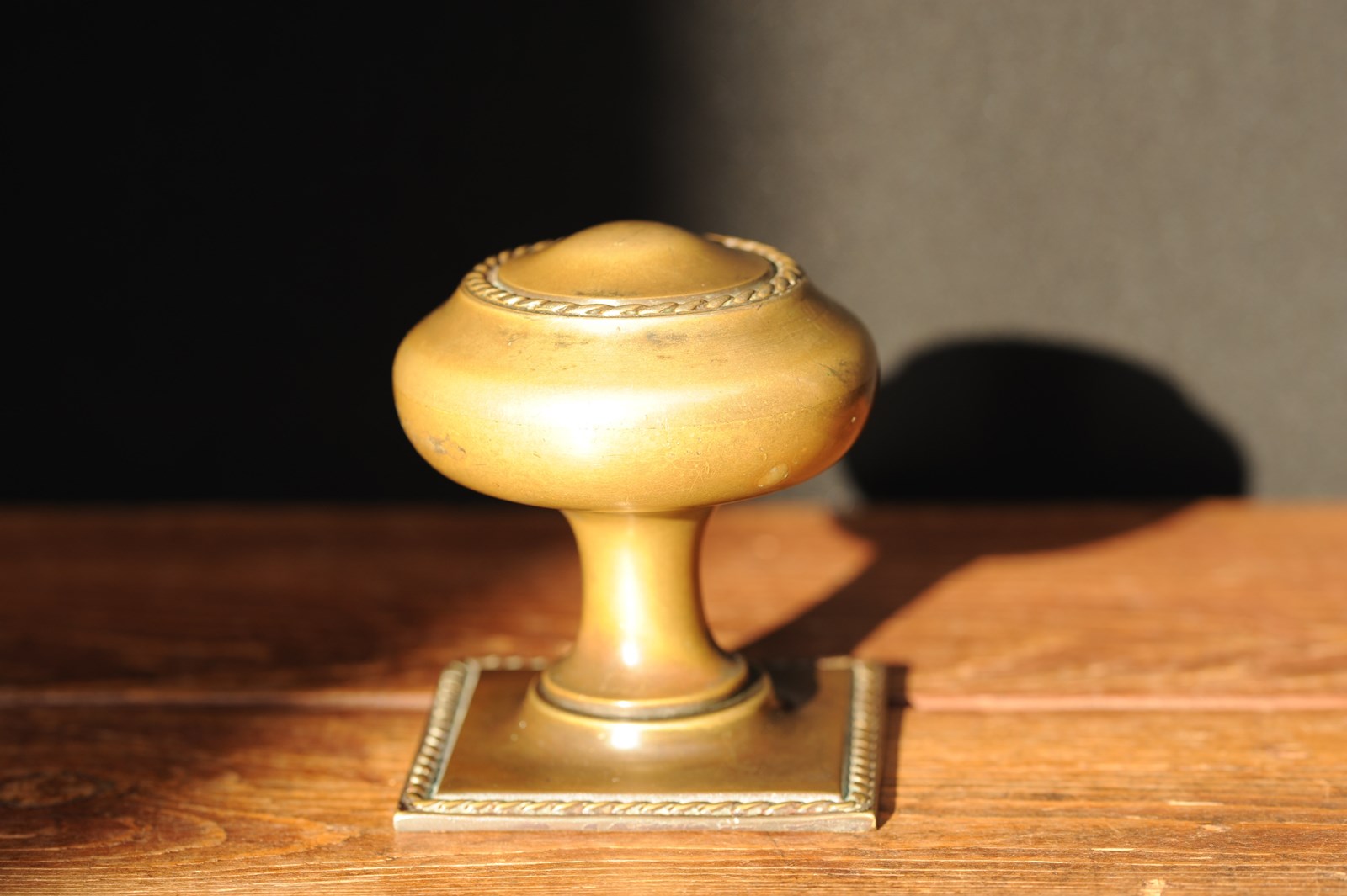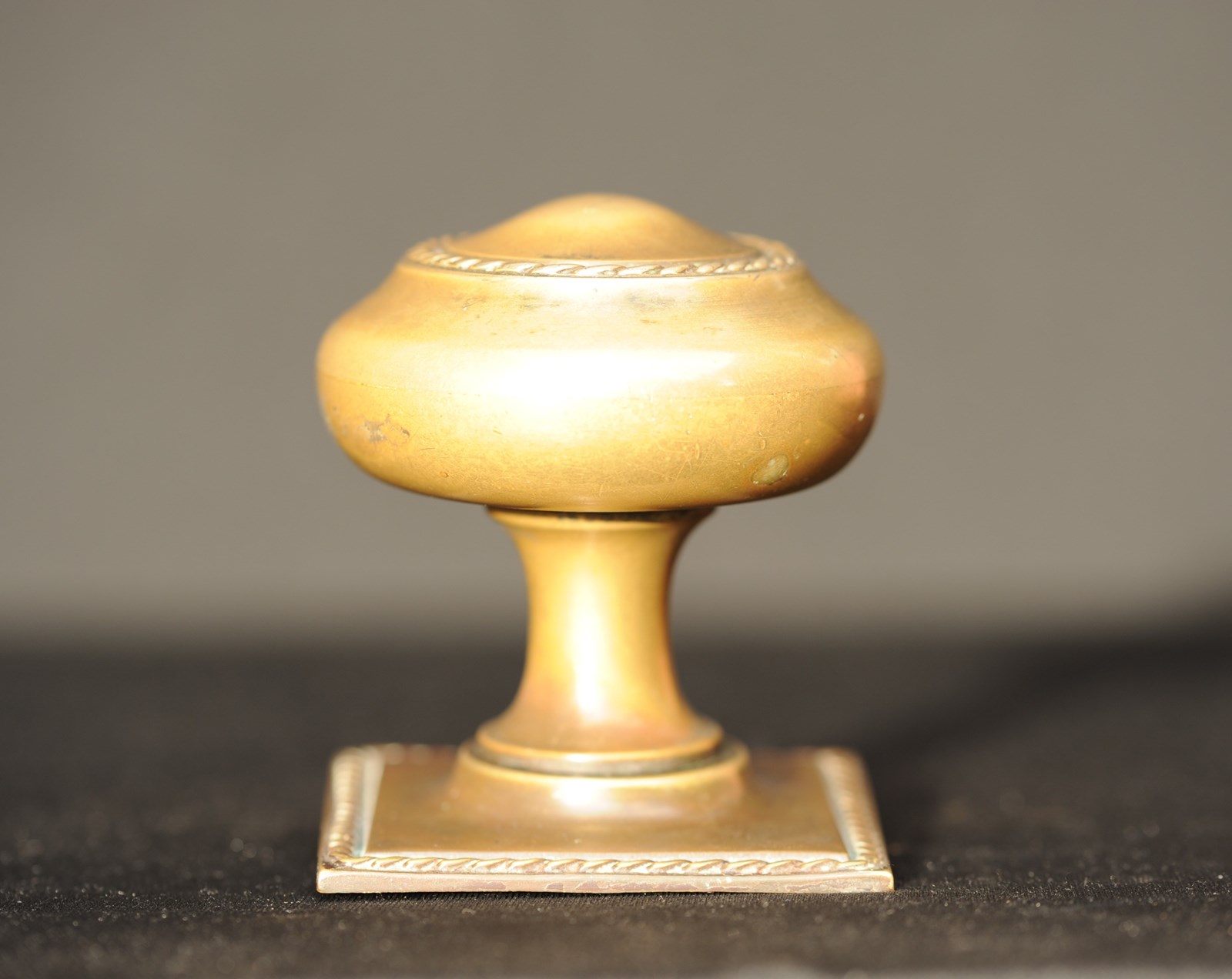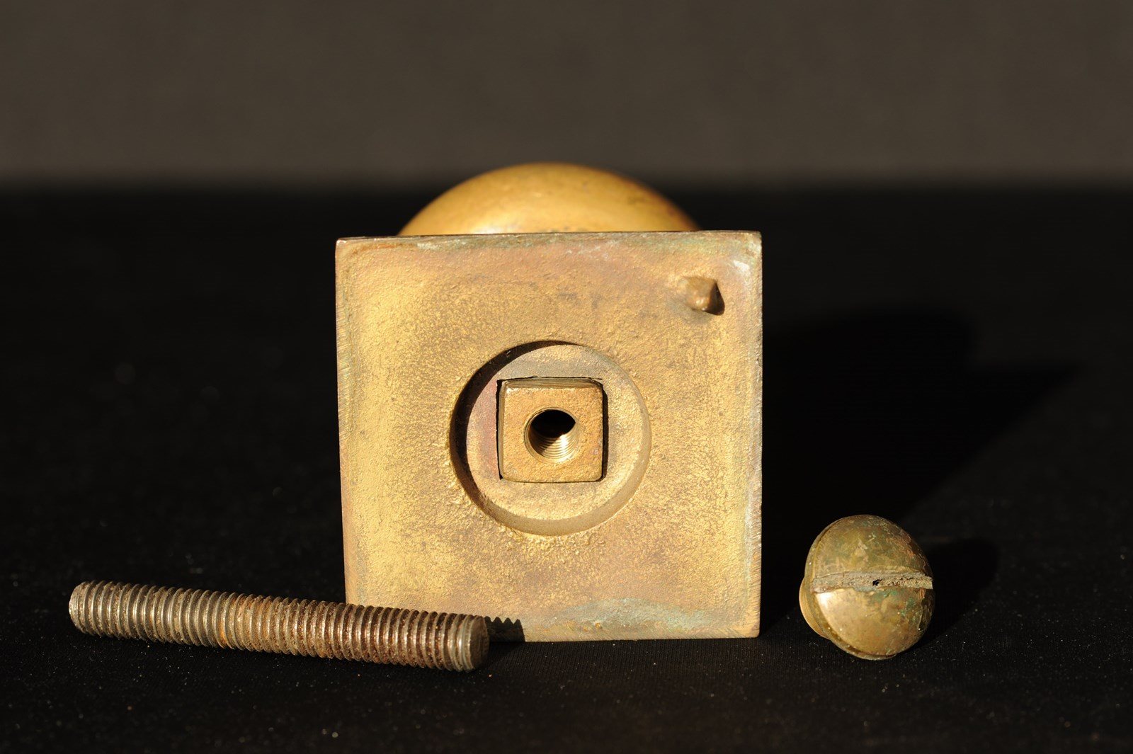 A good reclaimed mid 20th-century solid brass centre door knob pull. All complete. Fitted projection 3.25 inches. Back plate 2.75 inches square. Just under half a kilogram in weight. Lovely patination. Ready to fit. Sale includes UK delivery.