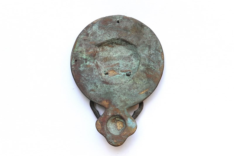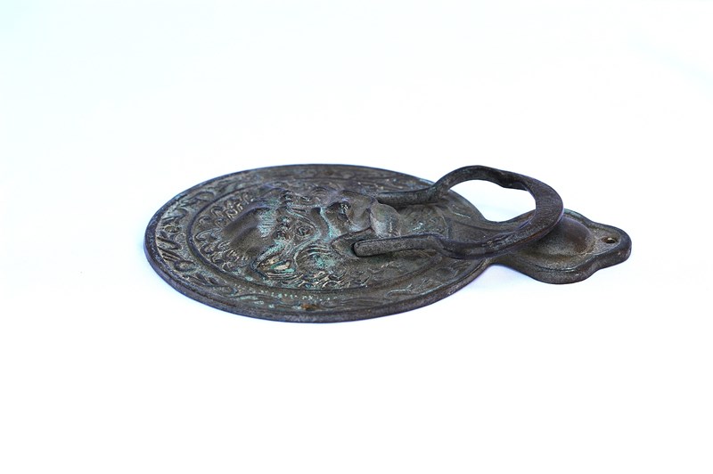 A large antique Chinese cast bronze door knocker. Height 9.5 inches. Width 6.75 inches. Weight: 1kg. Beautiful untouched colour. Good detailing. Sale includes delivery within the United Kingdom. Returns are happily accepted within 5 days, less all postage & packaging costs.