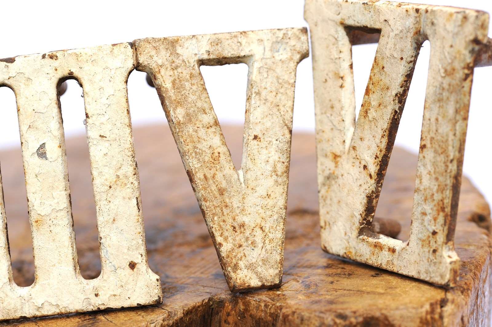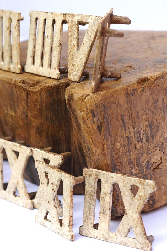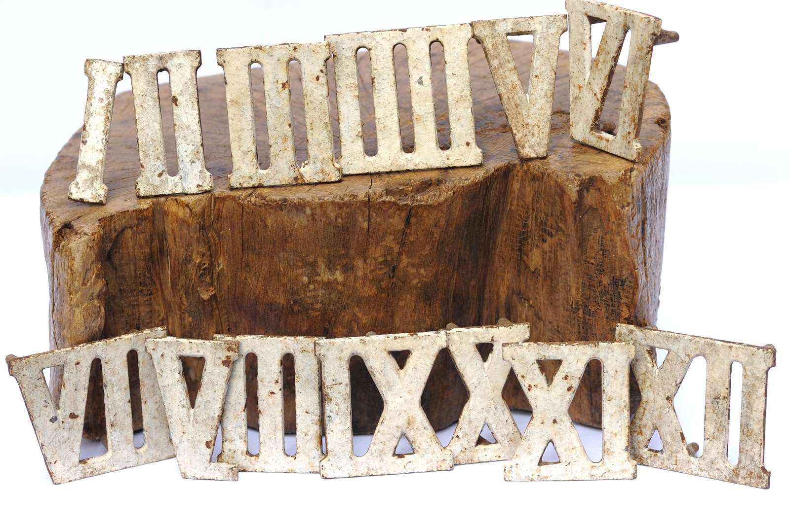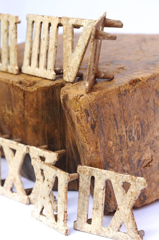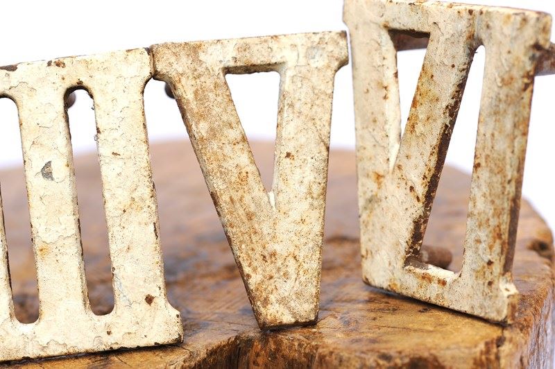 A full set of Antique Edwardian period cast iron clock golf roman numerals / numbers. Each 3.5 inches in height. Original old condition. The numeral 8 is in two parts, historical. Each numeral has lugs on the back for pushing into the lawn. Nice to see a full untouched set altogether still. Any questions please do not hesitate to ask. Sale includes UK inland tracked delivery.