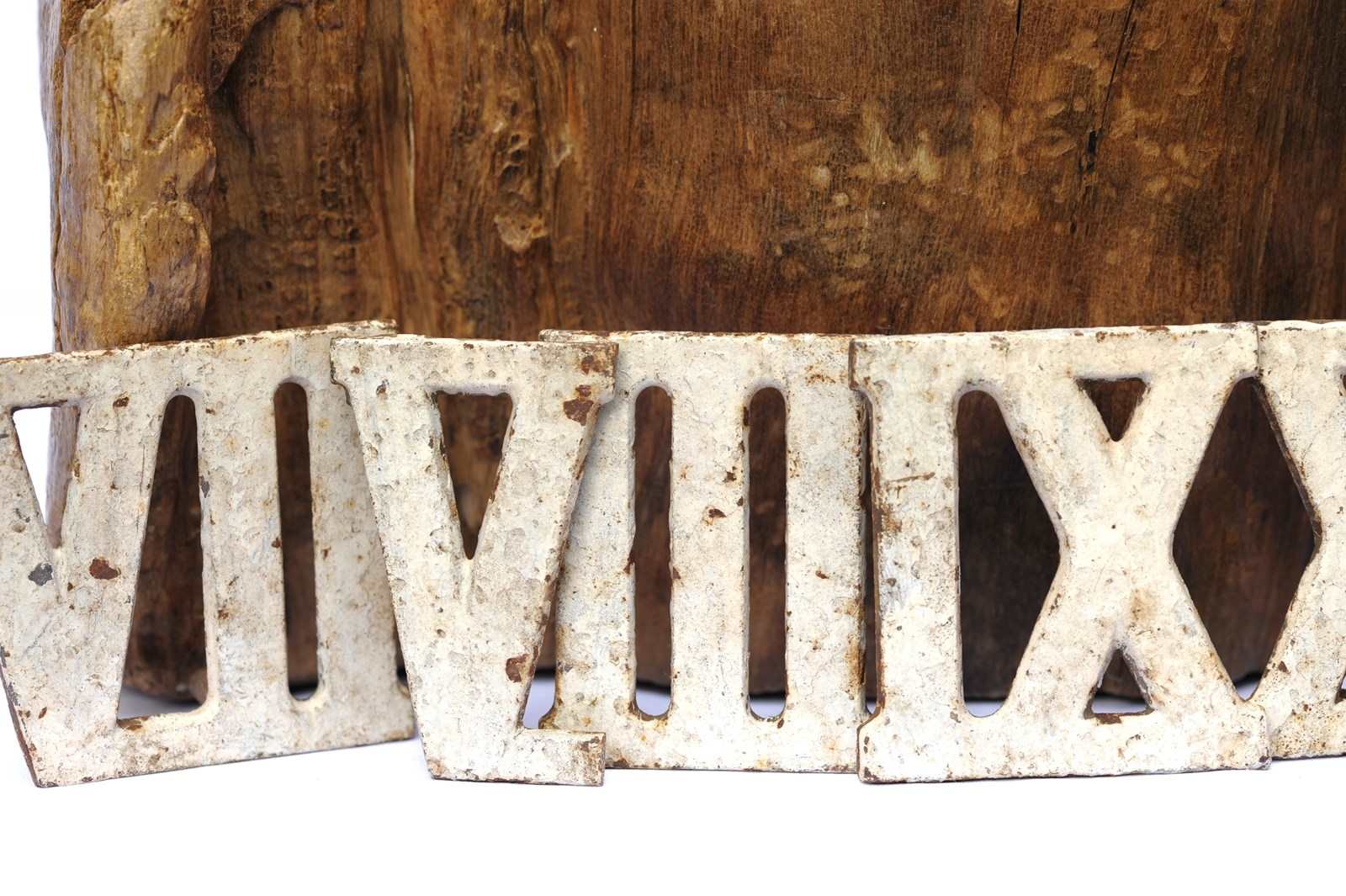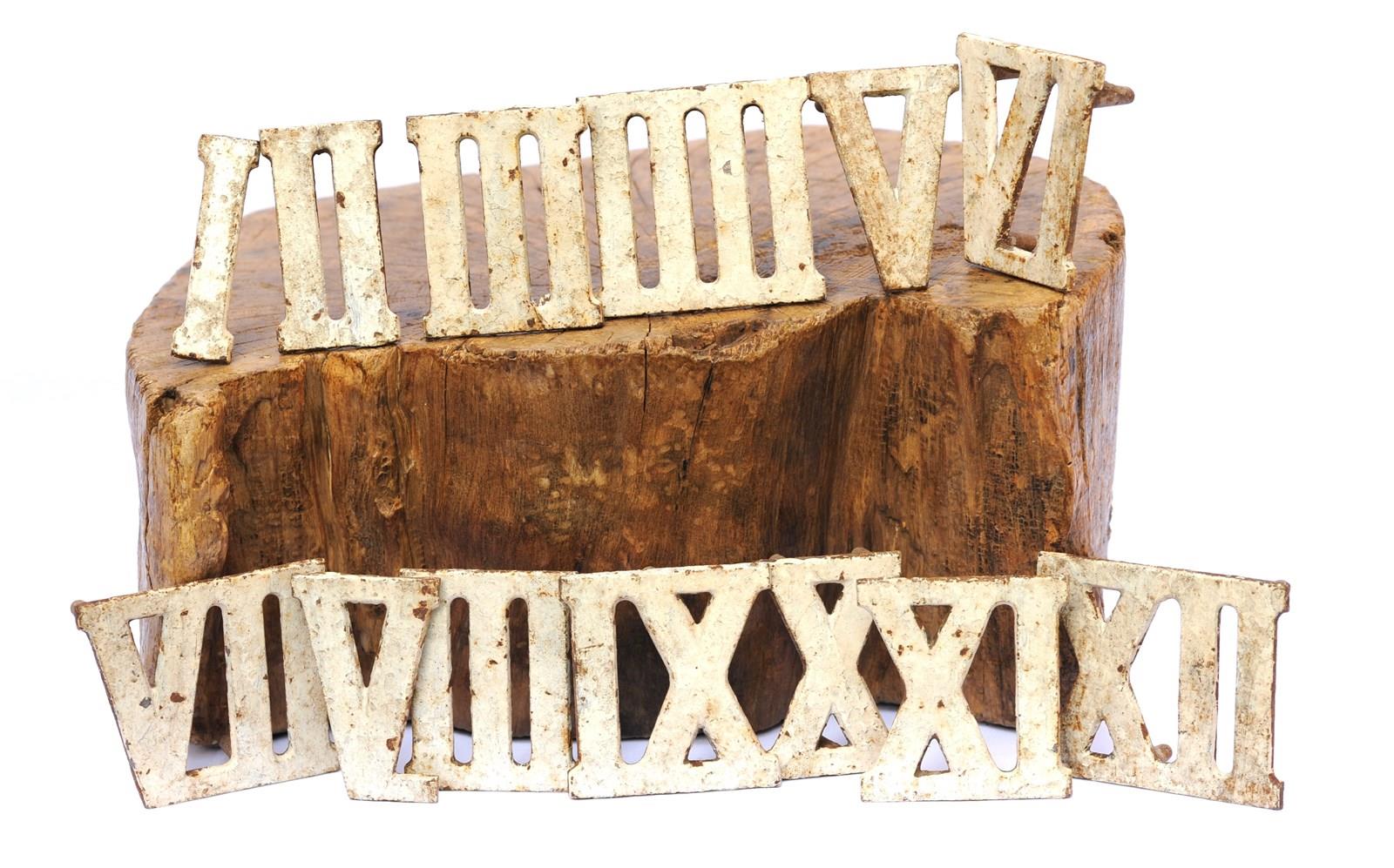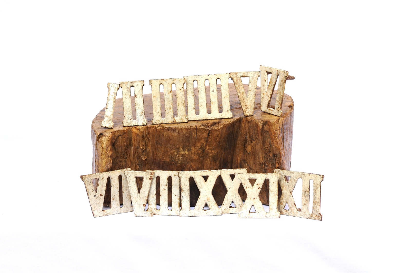 A full set of Antique Edwardian period cast iron clock golf roman numerals / numbers. Each 3.5 inches in height. Original old condition. The numeral 8 is in two parts, historical. Each numeral has lugs on the back for pushing into the lawn. Nice to see a full untouched set altogether still. Any questions please do not hesitate to ask. Sale includes UK inland tracked delivery.