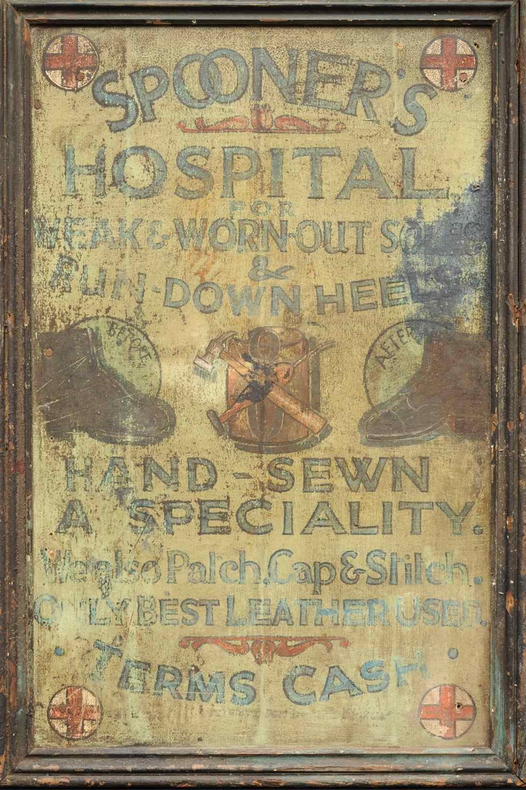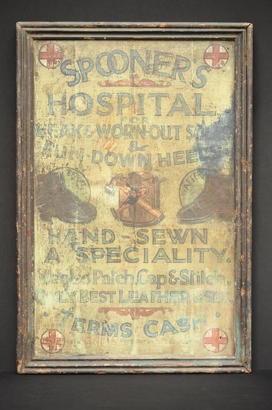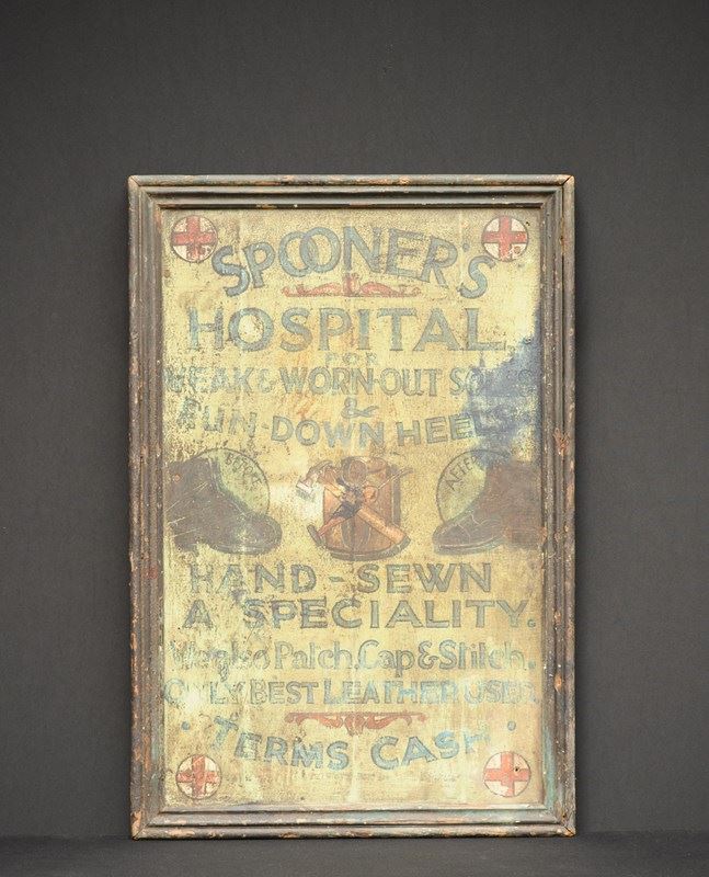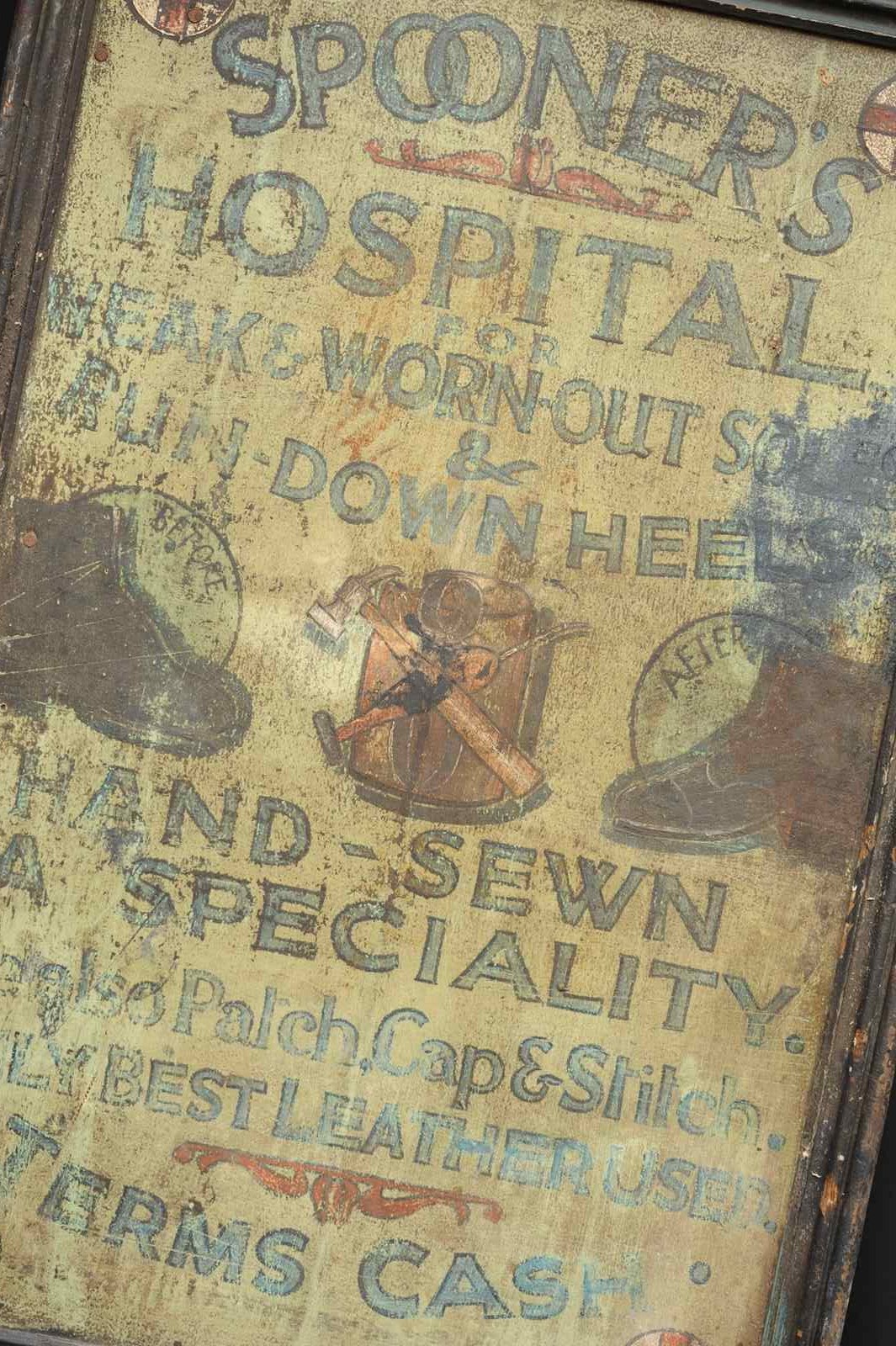 A wonderful vernacular & witty cobblers trade shop sign dating to circa 1910-1920. After a lot of research we believe this sign was made by & originally used in Harry Spooner's Cobblers shop in the market town of Arundel, South Downs in the early part of the 20th-century. Size 33" x 22" (cm measurements are given opposite)- 8 kg in weight. Untouched time worn & aged condition with a good depth of patina. Painted pine moulded frame with a triple braced wide boarded backing & a hessian based oxidized linseed linoleum frontage. Naively free hand drawn with ink painted lettering & trade related item illustrations. There are over 100 years worth of marks, knocks, wear, fading etc, also there are several nails straight through & just bent over at the back. It is such a lovely old interior trade shop display sign directly associated with one mans shoe & leather repair business in the early part of the 20th-century. An extremely rare survivor. Without doubt highly decorative. Any questions please do not hesitate to ask. Additional images are available on request.