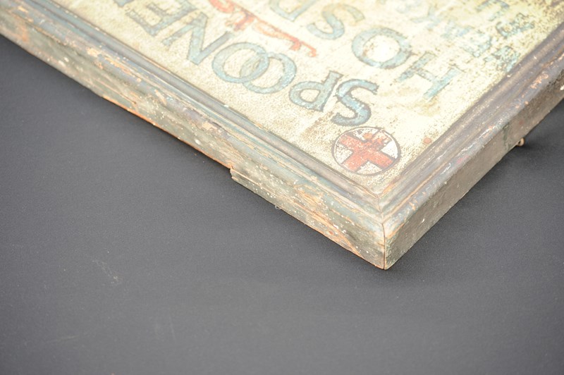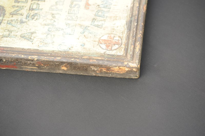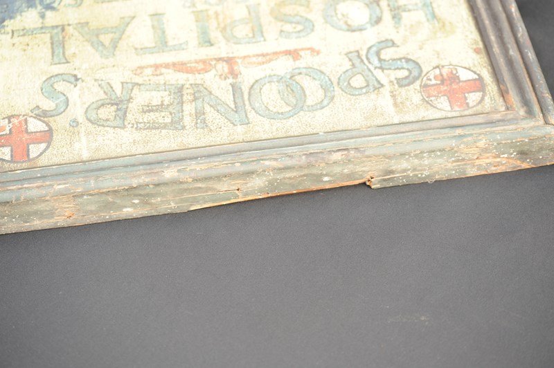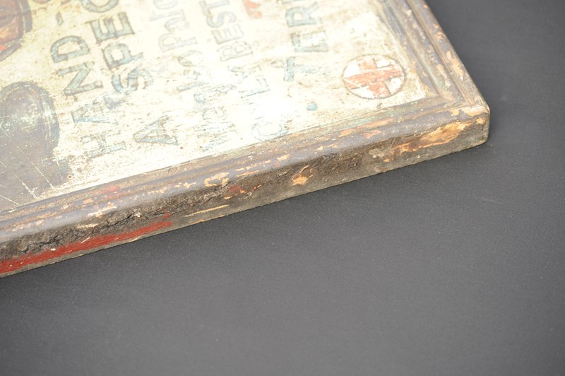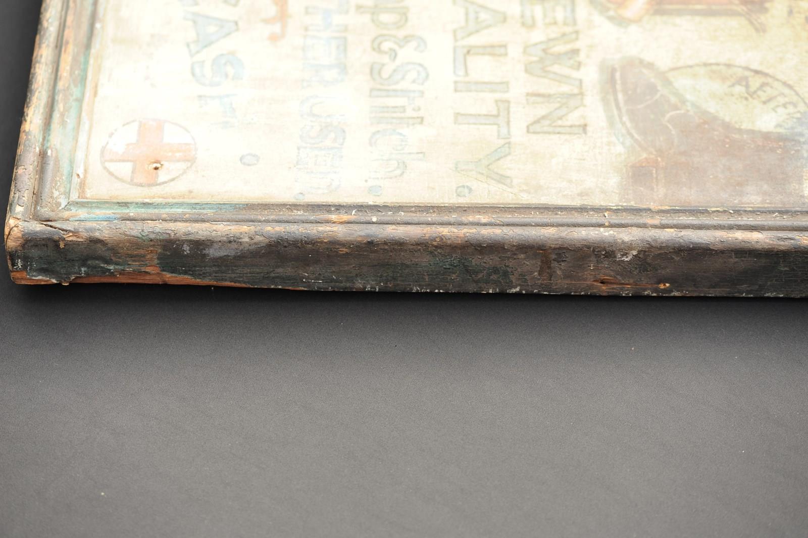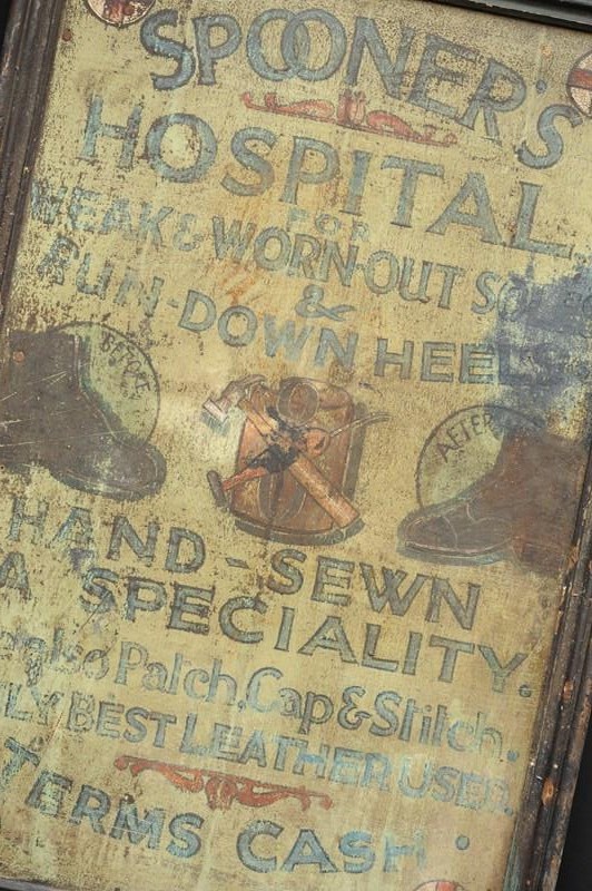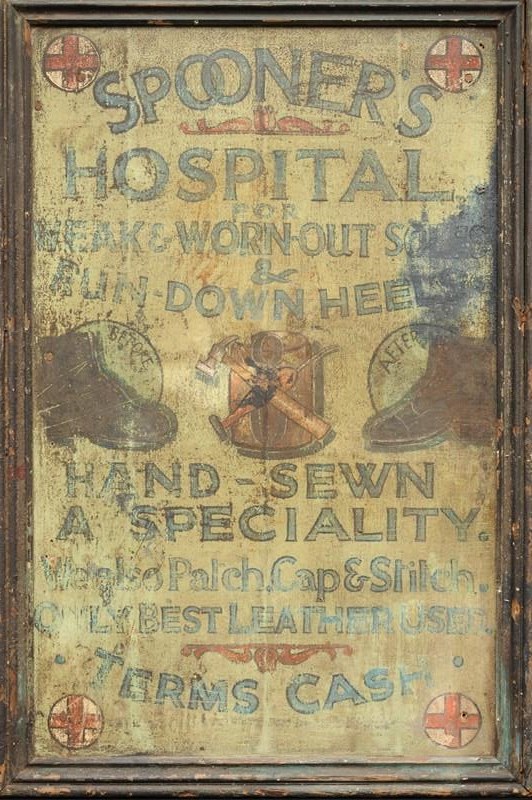 A wonderful vernacular & witty cobblers trade shop sign dating to circa 1910-1920. After a lot of research we believe this sign was made by & originally used in Harry Spooner's Cobblers shop in the market town of Arundel, South Downs in the early part of the 20th-century. Size 33" x 22" (cm measurements are given opposite)- 8 kg in weight. Untouched time worn & aged condition with a good depth of patina. Painted pine moulded frame with a triple braced wide boarded backing & a hessian based oxidized linseed linoleum frontage. Naively free hand drawn with ink painted lettering & trade related item illustrations. There are over 100 years worth of marks, knocks, wear, fading etc, also there are several nails straight through & just bent over at the back. It is such a lovely old interior trade shop display sign directly associated with one mans shoe & leather repair business in the early part of the 20th-century. An extremely rare survivor. Without doubt highly decorative. Any questions please do not hesitate to ask. Additional images are available on request.