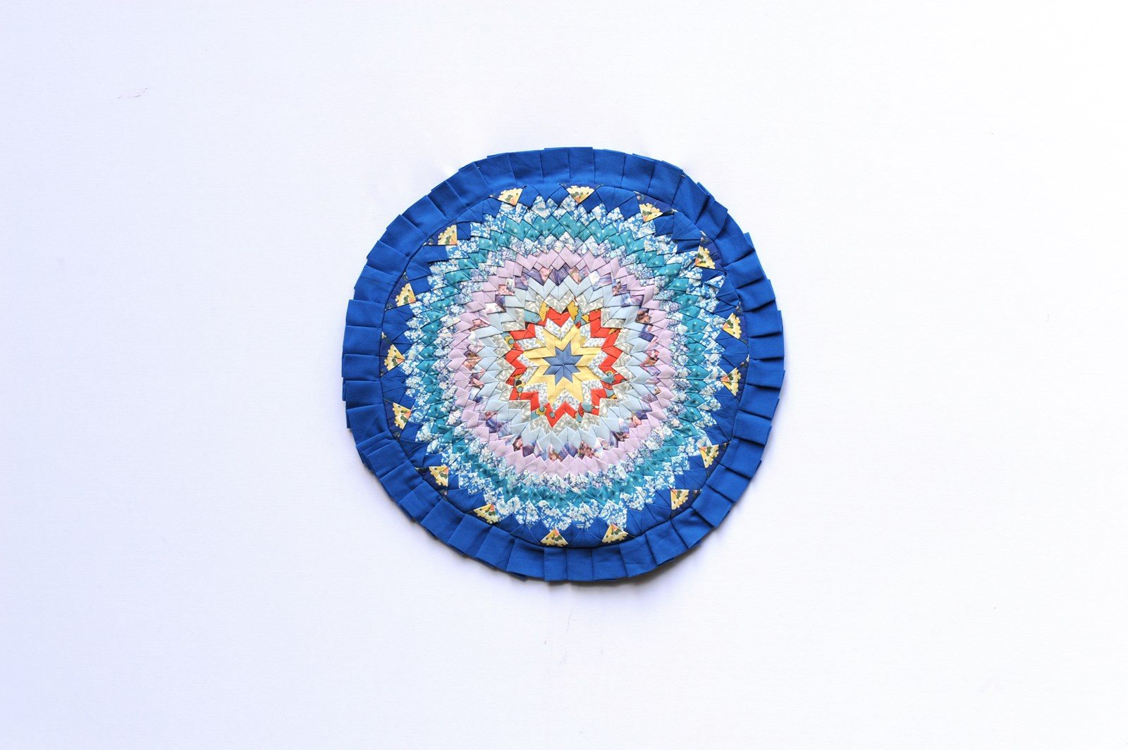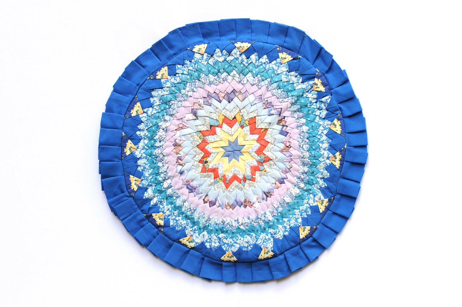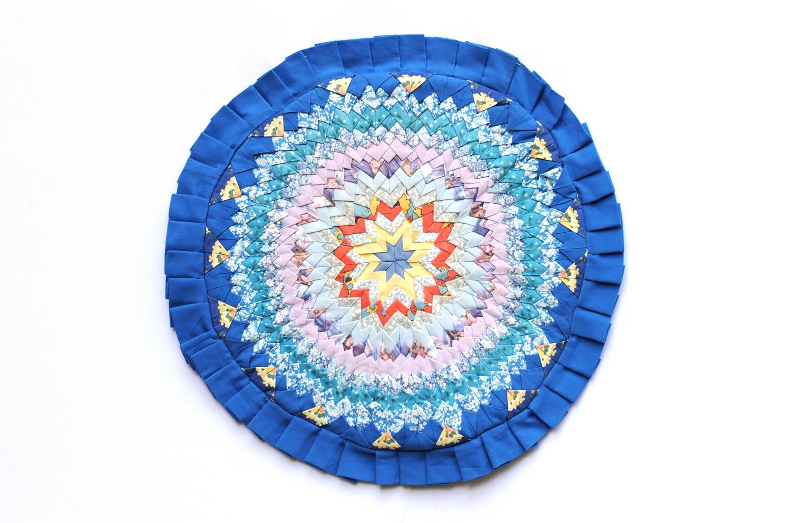 Well this is just the most amazing cushion cover we have ever seen. Mid century in date, excellent condition. English, completely made by hand and eye. Small pieces of cotton fabric carefully cut, folded & sewn into place. It must have taken weeks to make, a little bit every evening no doubt. Approximately 20 inches in diameter. Although designed as a cushion cover, it would sit quite well just as a flat table centre piece. This is the cover only, no cushion is supplied with it. Free UK inland tracked delivery.