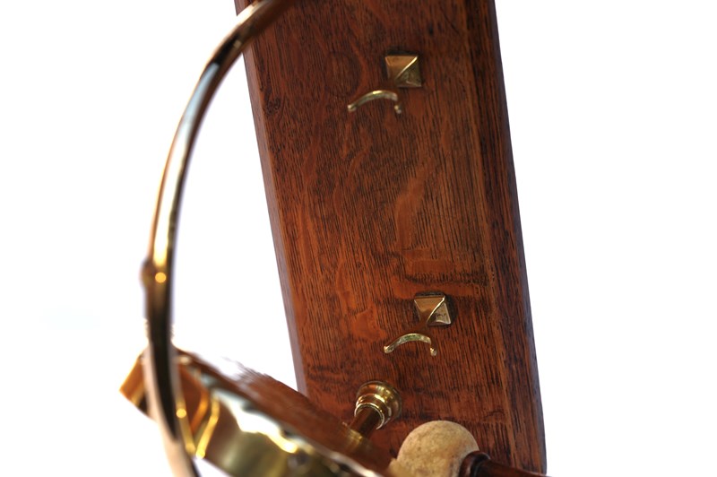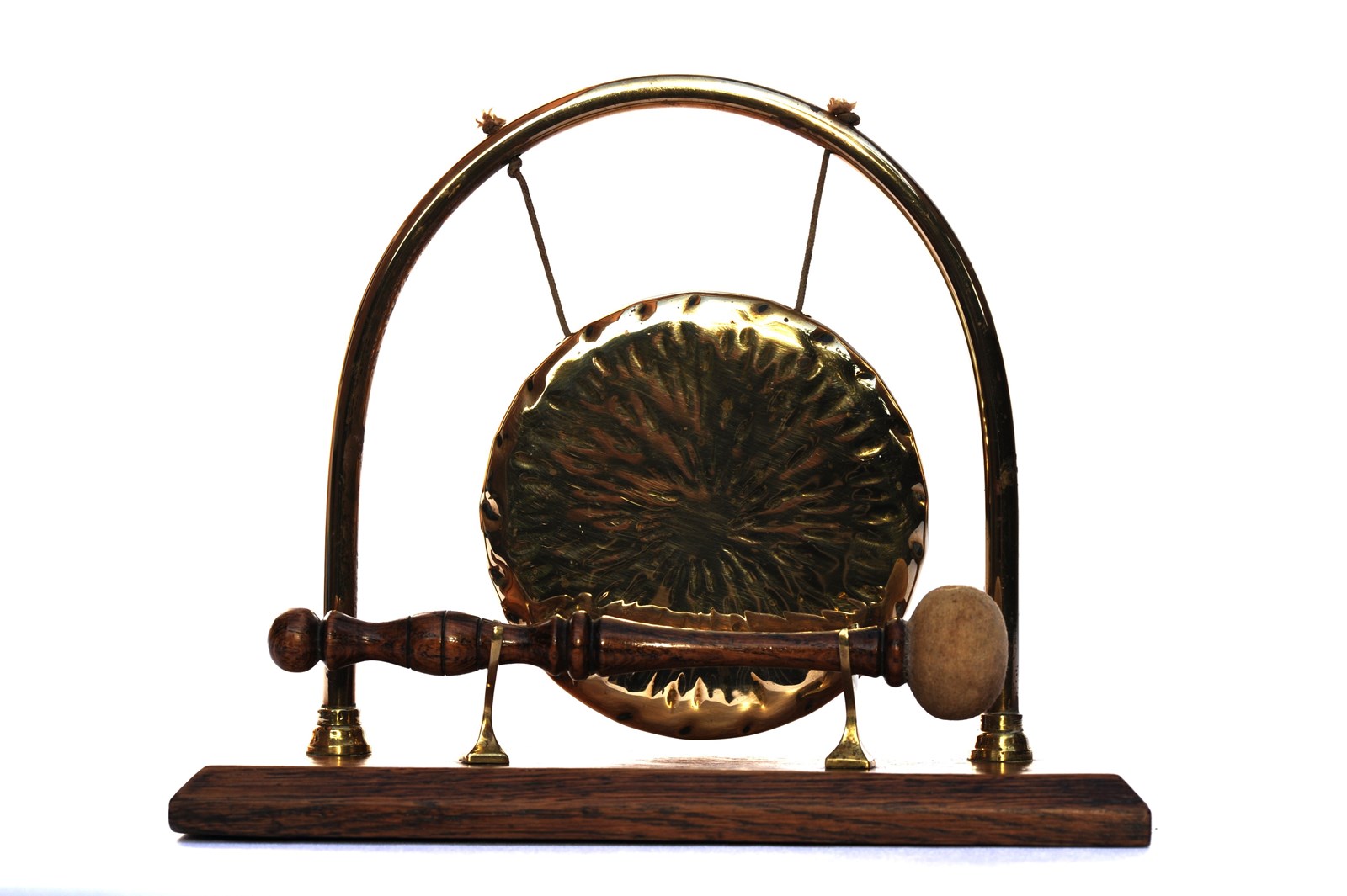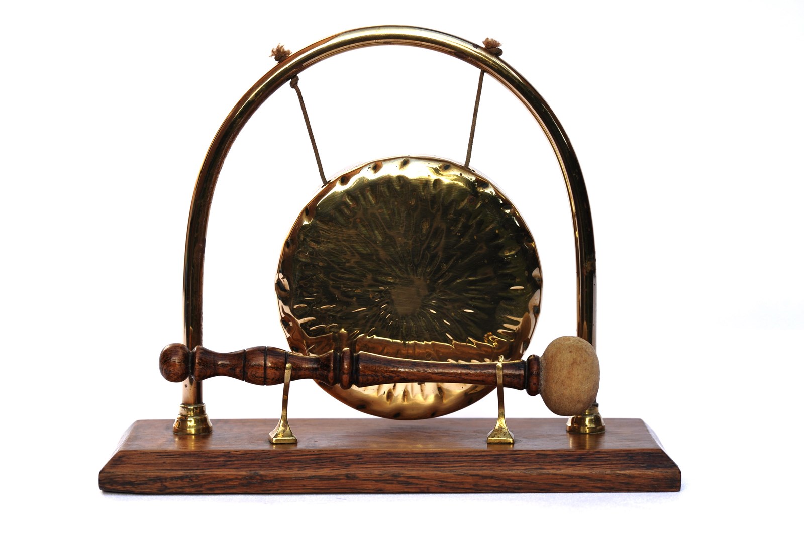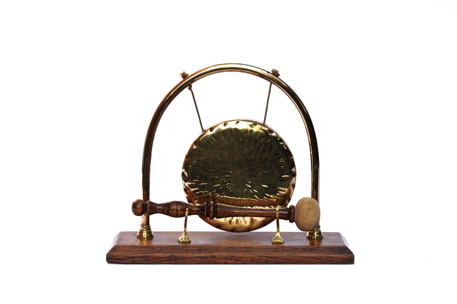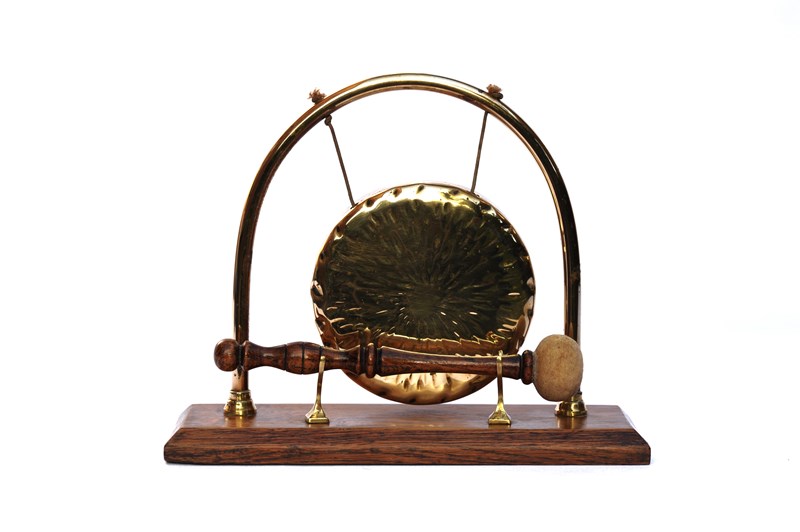 A good clean condition English Edwardian brass & oak dinner gong with its original beater. It has clearly been looked after & is in ready to use condition. Height 8 inches, width 10 inches. Sale includes delivery within the United Kingdom.