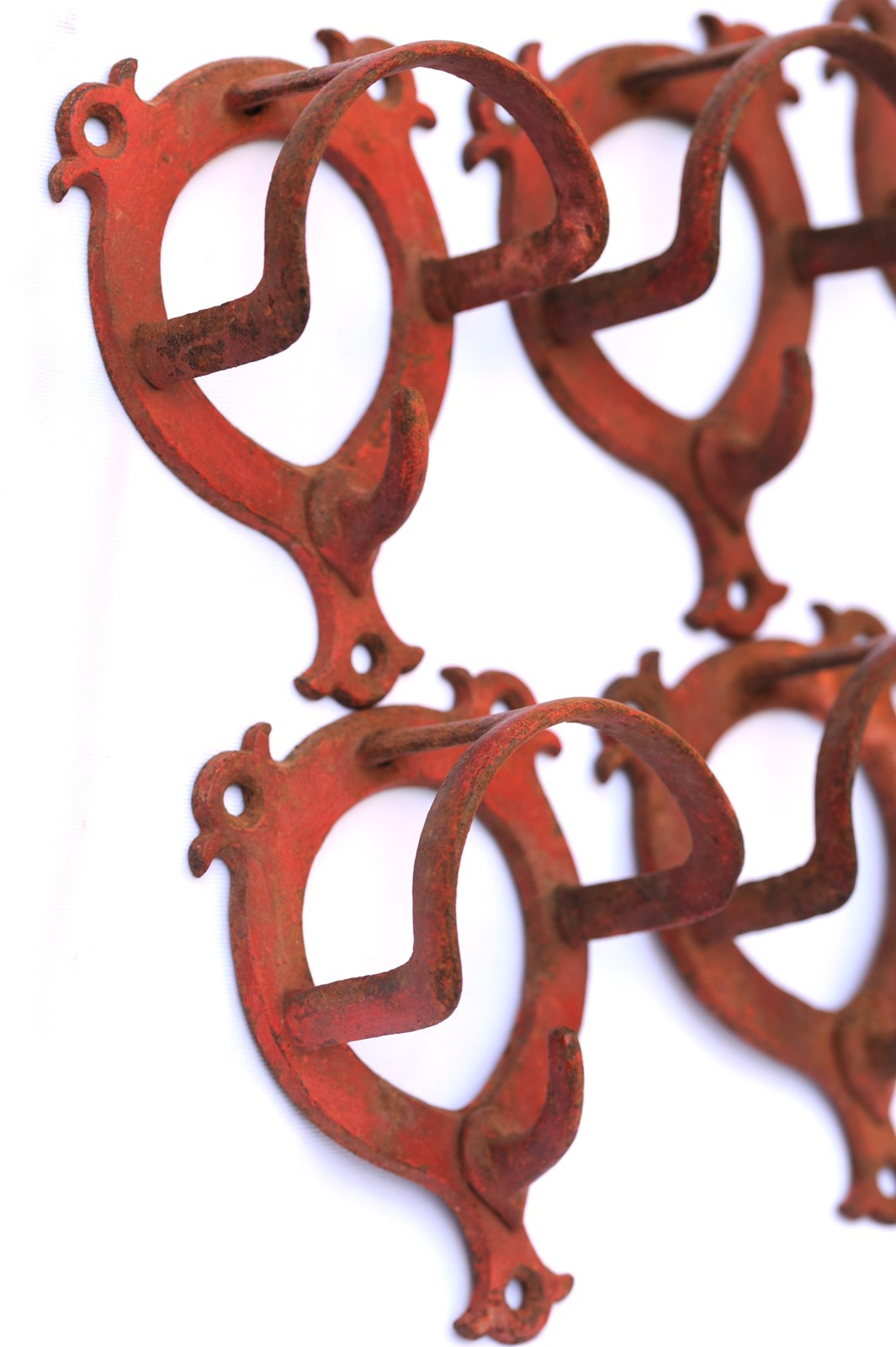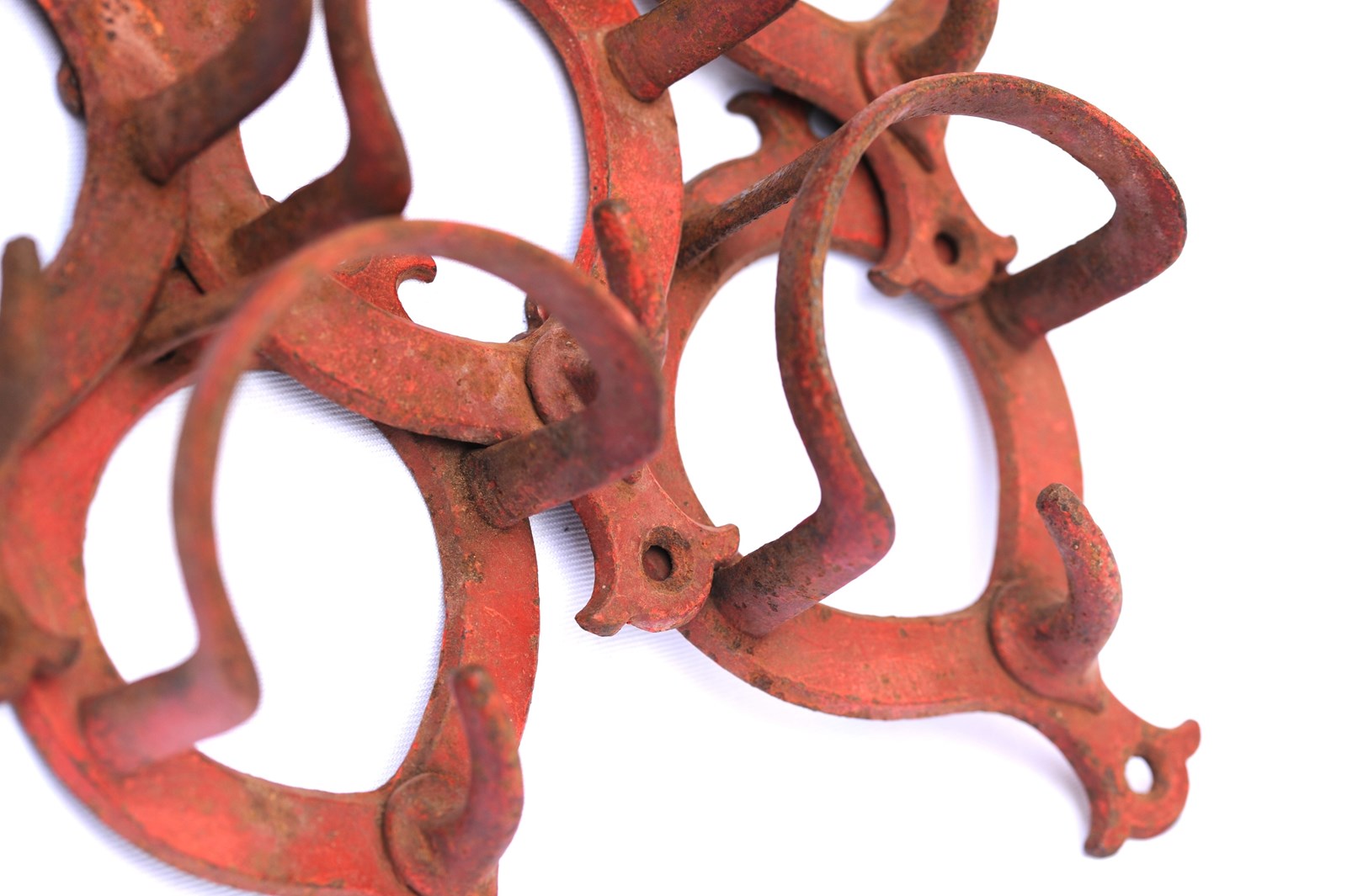 Priced individually & including UK delivery, these English late 19th cast iron Equestrian Bridle Brackets are in good overall untouched original condition, with remains of the original paint & makers mark on the back of each. Use them for the original purpose, or for coat hooks, they are also great for dog leads.
