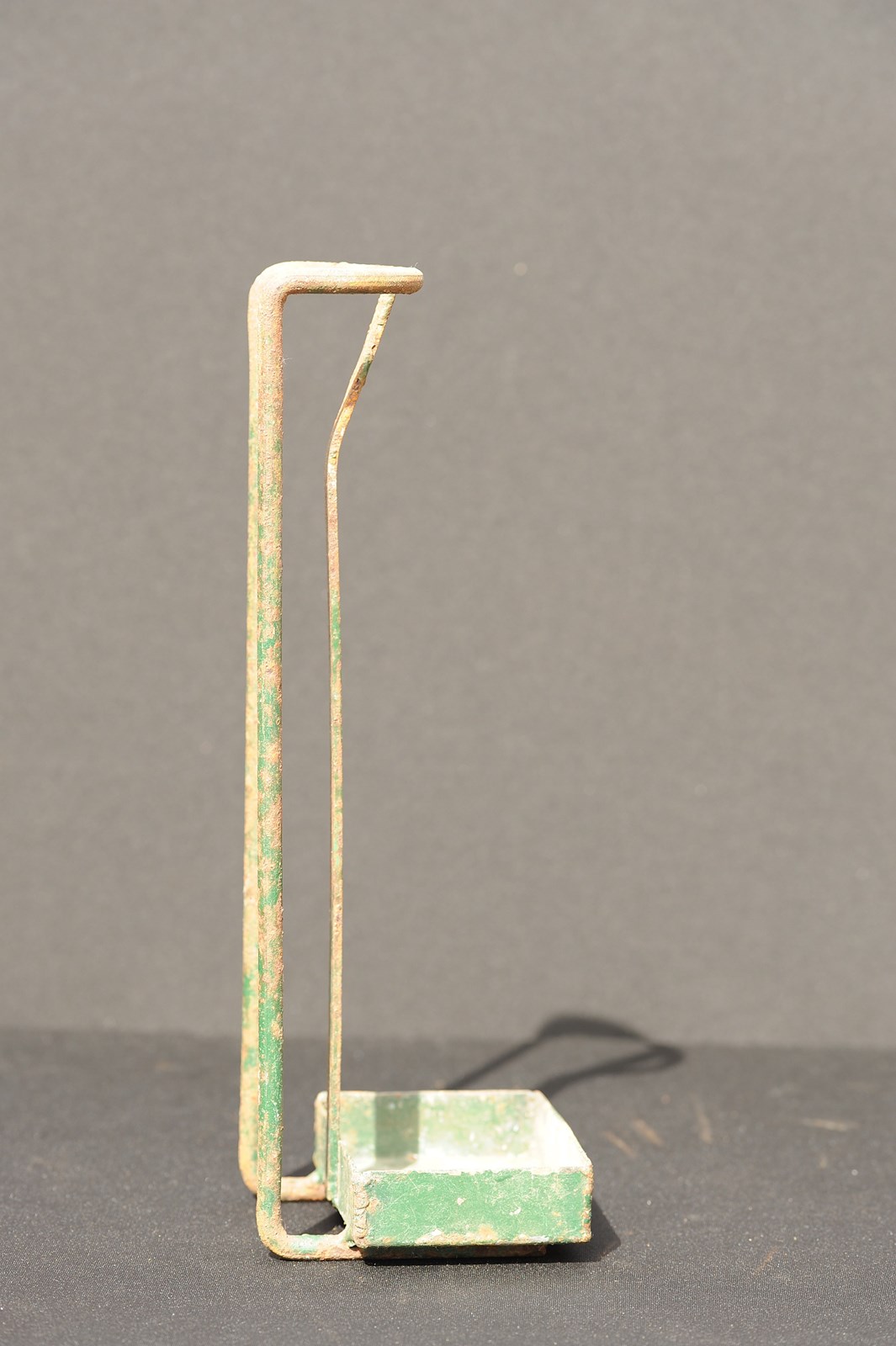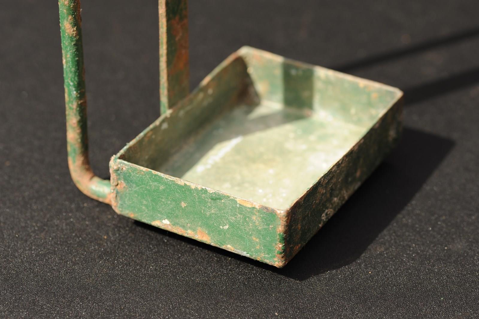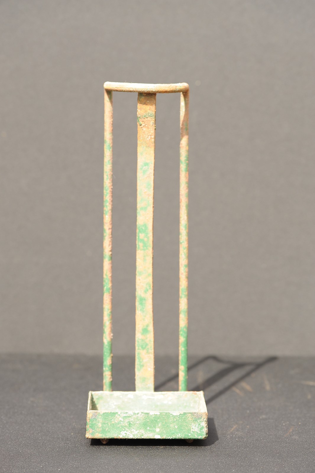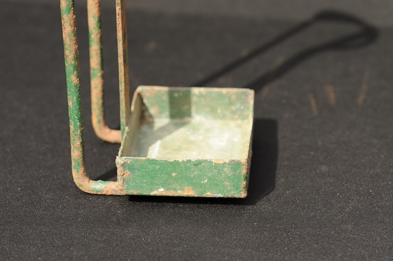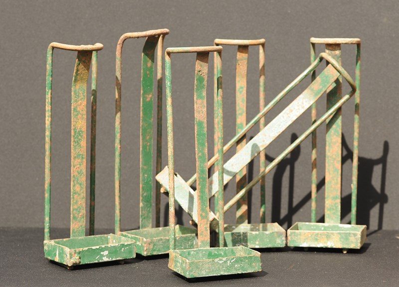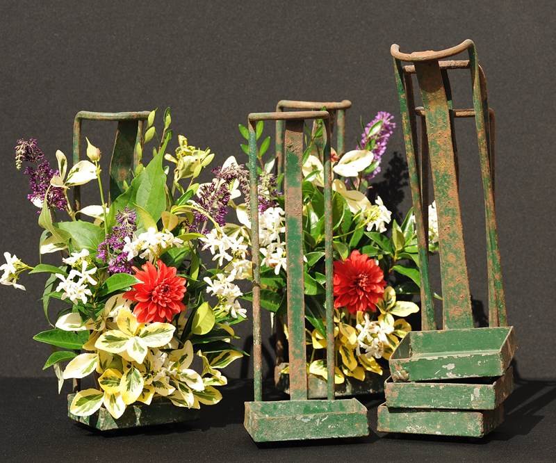 Old wrought iron florist display stands in original green paint. These are approximately 45 years old, a local now retired florist had them made up by the local blacksmith. Designed originally to be fitted onto Marquee posts, hence the curved backs. The base trays are designed to hold a piece of oasis for pretty floral displays. Although originally designed to fitted against marquee posts, they stand perfectly well on their own. These could now go back into the florist trade or into a home environment or shop. Approximate dimensions 34 cm in height, 12 cm in width, 11 cm in depth, size comparison last image next to a wine bottle. The base trays for holding the oasis are 11 cm x 8 cm x 3 cm. They are all in good solid untouched condition, with a great vintage look to them.
