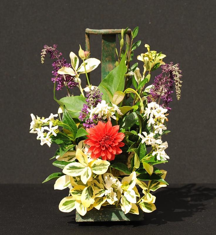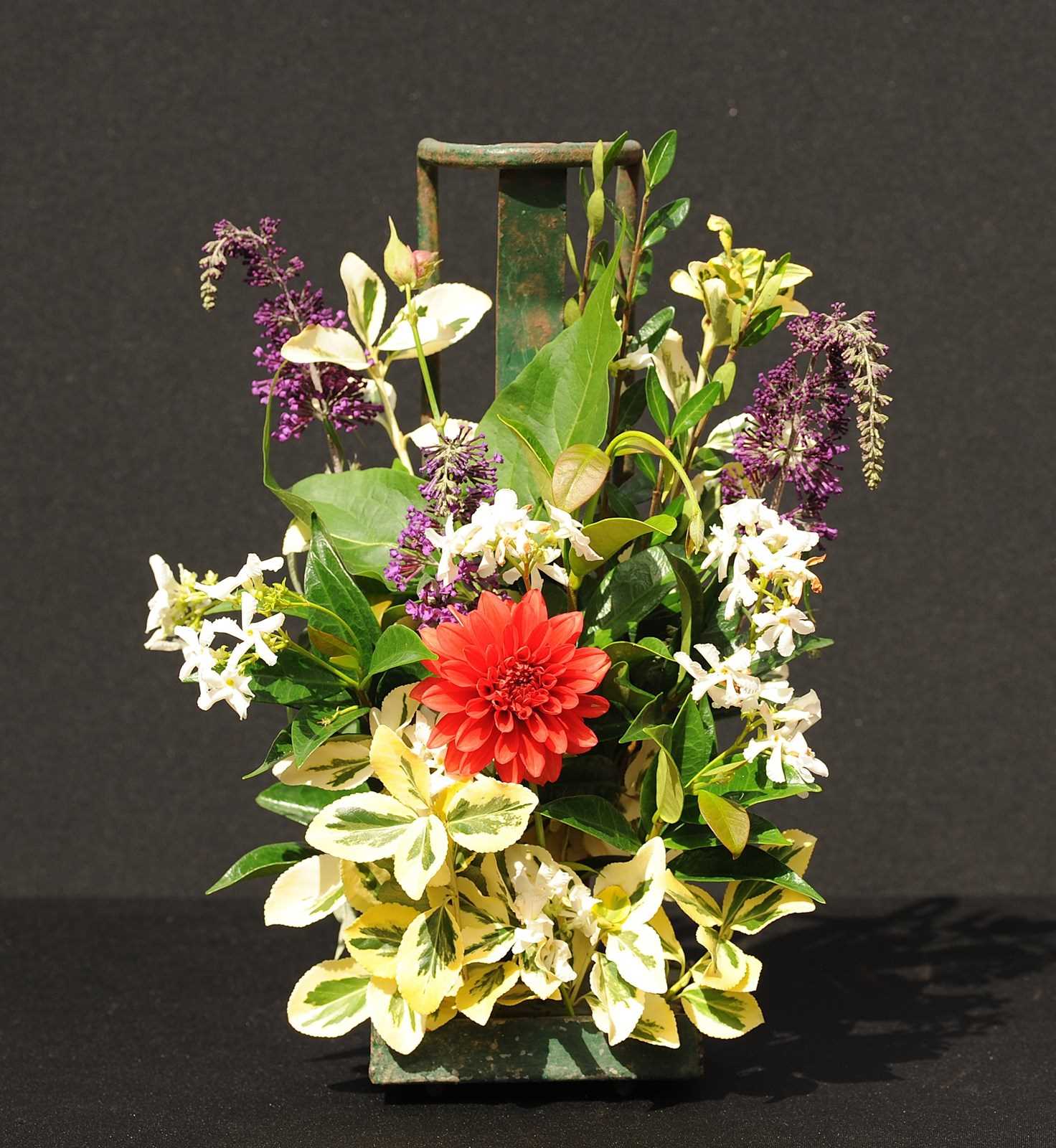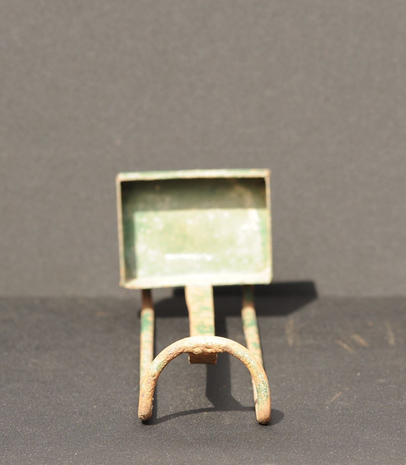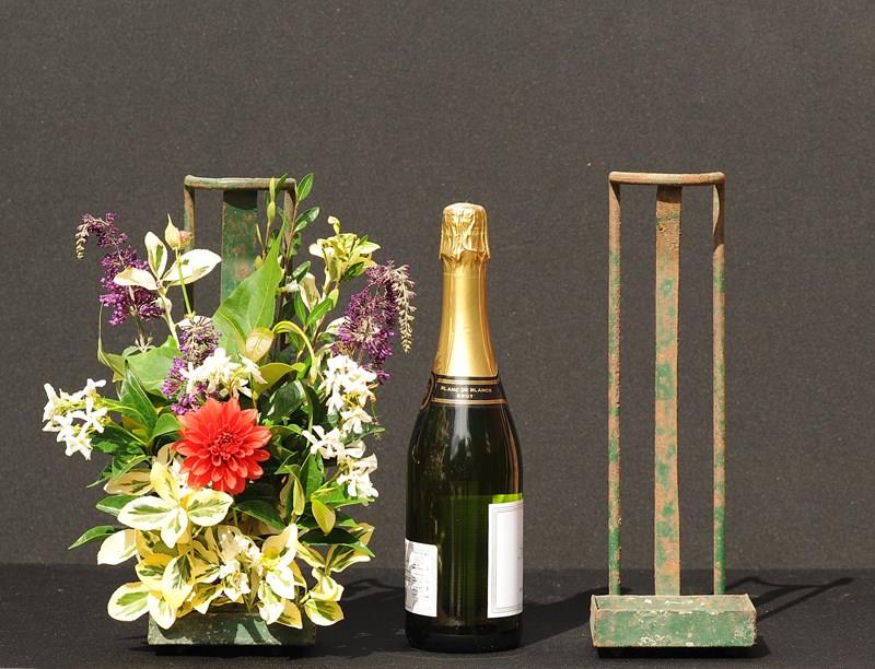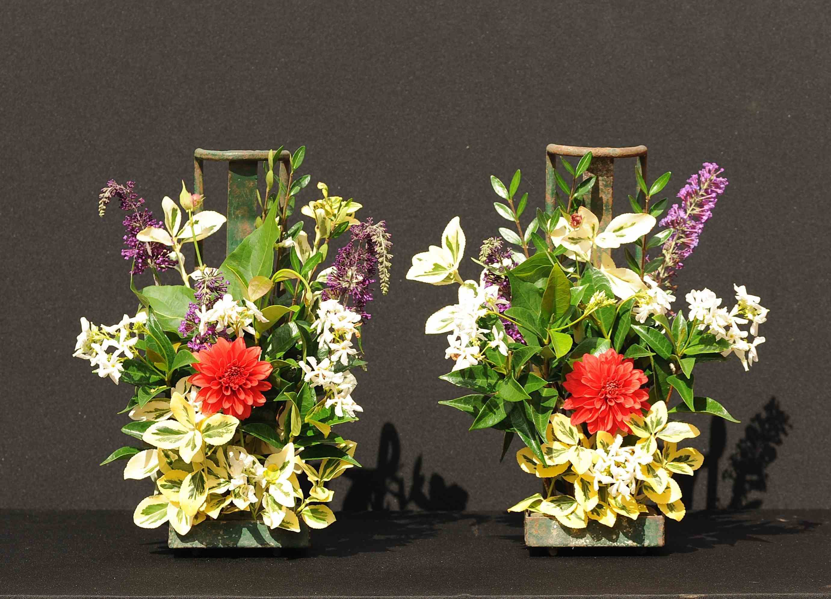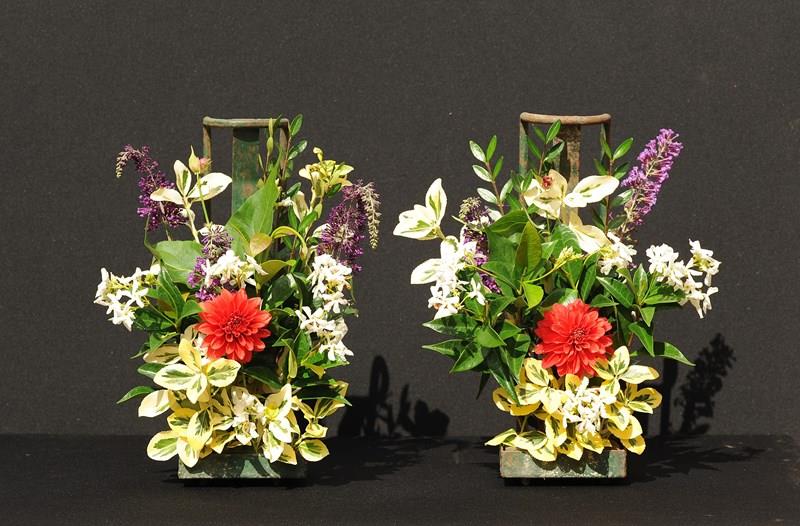 Old wrought iron florist display stands in original green paint. These are approximately 45 years old, a local now retired florist had them made up by the local blacksmith. Designed originally to be fitted onto Marquee posts, hence the curved backs. The base trays are designed to hold a piece of oasis for pretty floral displays. Although originally designed to fitted against marquee posts, they stand perfectly well on their own. These could now go back into the florist trade or into a home environment or shop. Approximate dimensions 34 cm in height, 12 cm in width, 11 cm in depth, size comparison last image next to a wine bottle. The base trays for holding the oasis are 11 cm x 8 cm x 3 cm. They are all in good solid untouched condition, with a great vintage look to them.