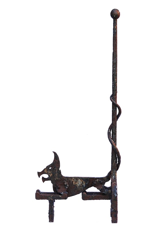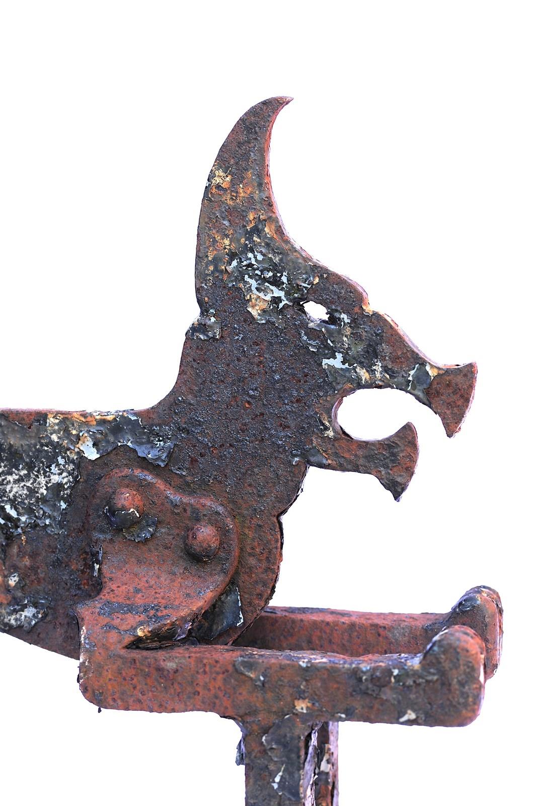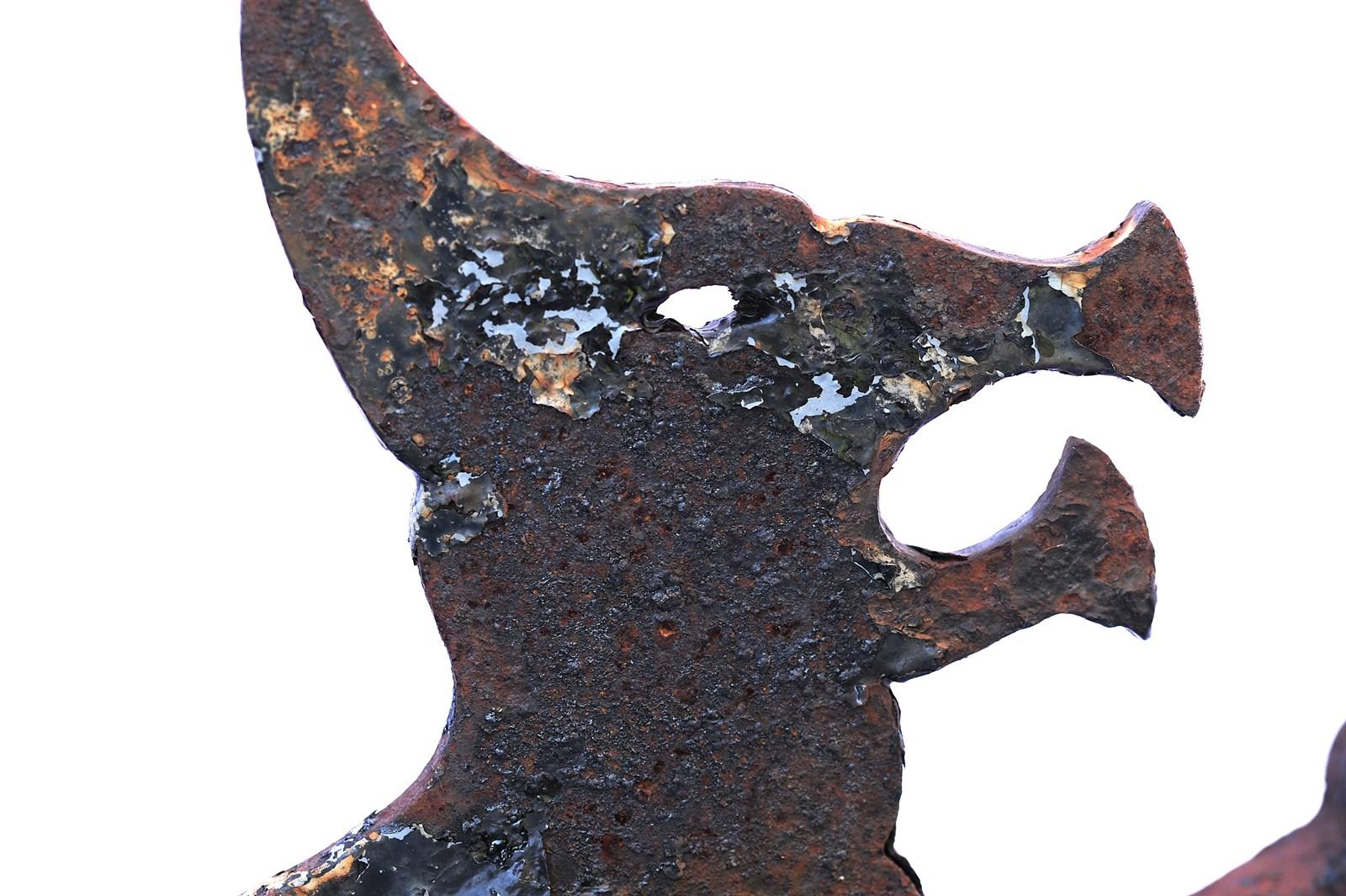 Antique English folk art wrought iron boot scraper in the form of a running fox. Early 1900s in date, by repute from the family we bought it off originating from the Norfolk area. Overall height 46 inches, width 19 inches, depth 8 inches. Weight 20kg. Completely original untouched condition, weathered & time worn. Possibly some loss in height off its standing feet, also possibly elements of loss to the foxes tail tip. Stands well, firm & level. Great look to it. For a UK inland delivery quotation please enquire.