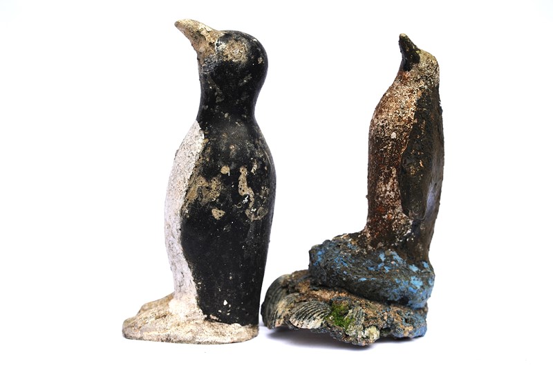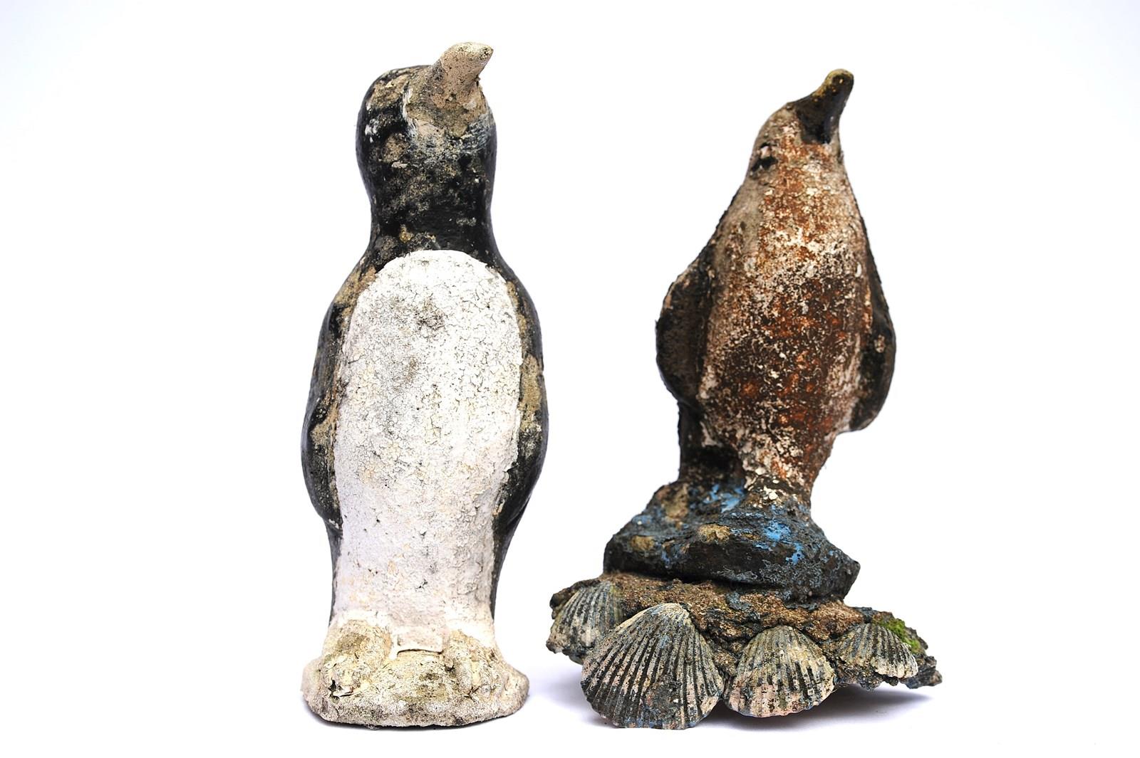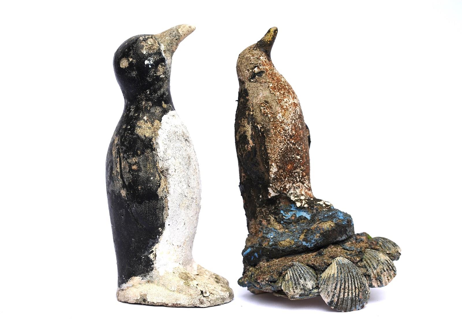 Folk Art Cast Stone Penguins. Circa 1930. Original untouched weather beaten. The maximum height is 11.5 inches. Weight 6 kg the pair. Sale is for both penguins. Delivery within the United Kingdom is included in the price.