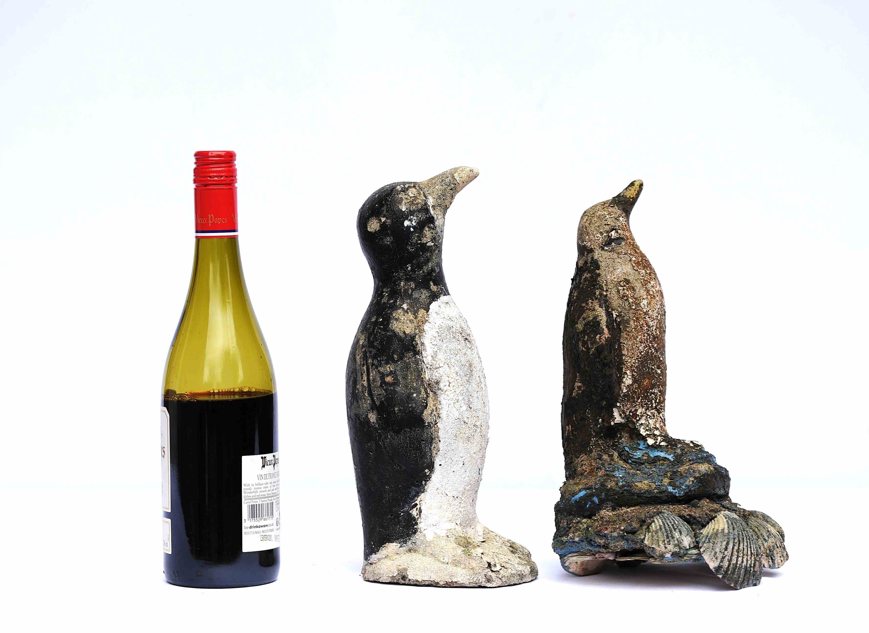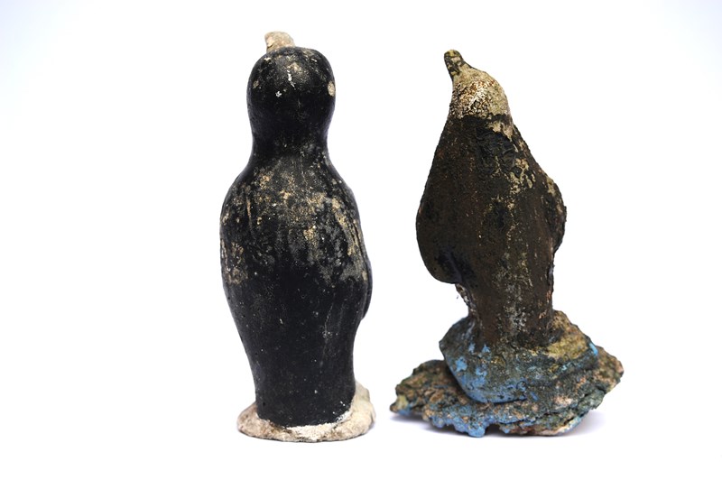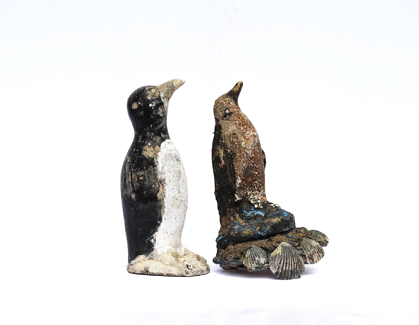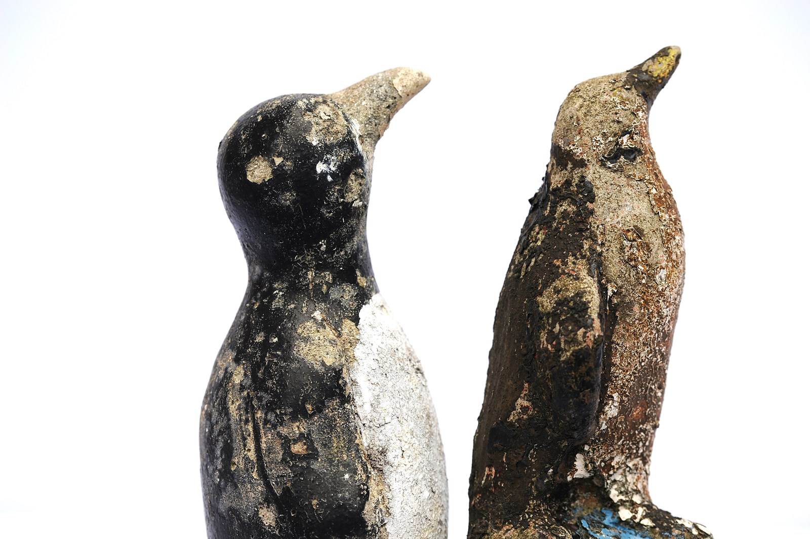 Folk Art Cast Stone Penguins. Circa 1930. Original untouched weather beaten. The maximum height is 11.5 inches. Weight 6 kg the pair. Sale is for both penguins. Delivery within the United Kingdom is included in the price.
