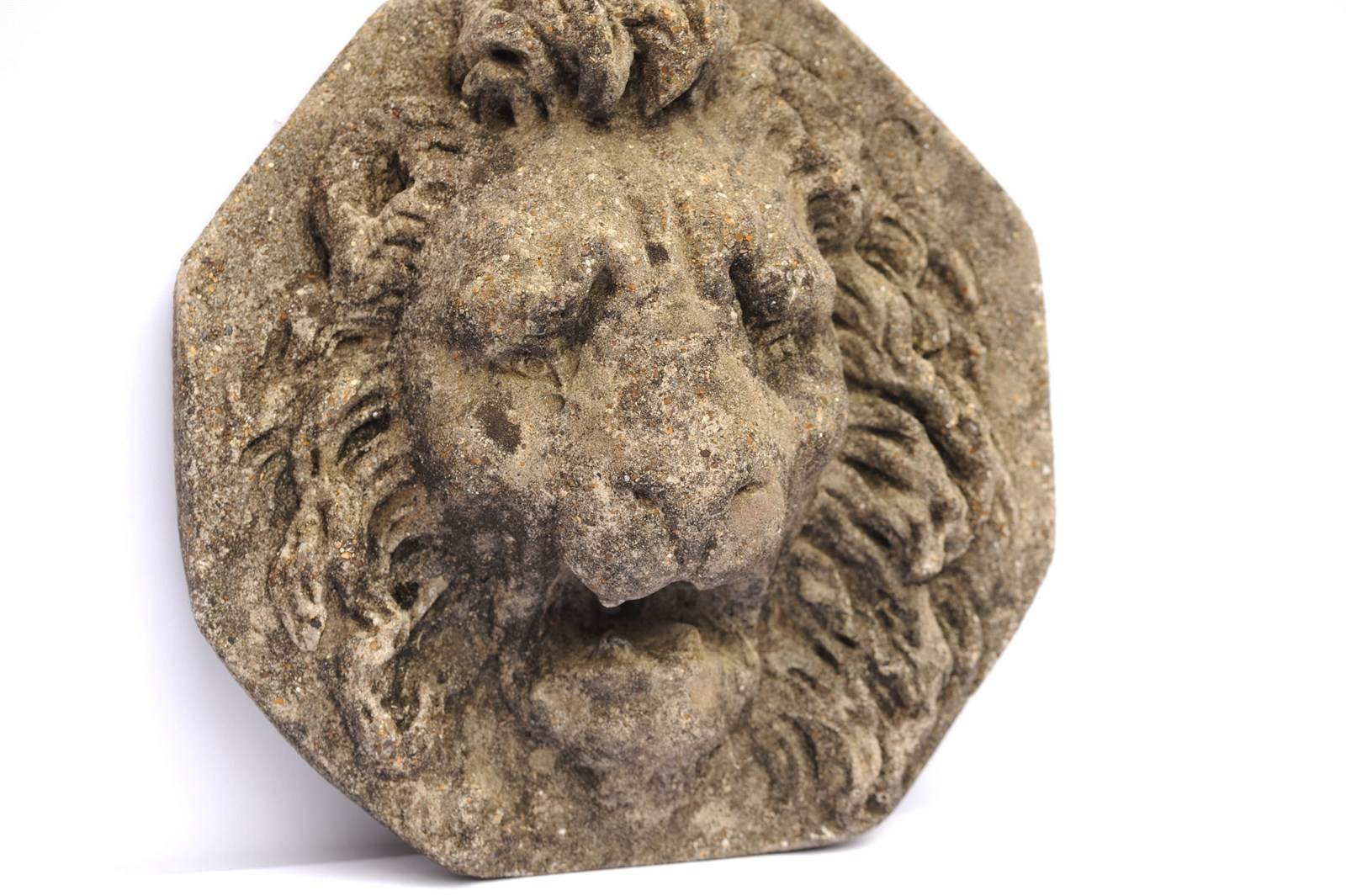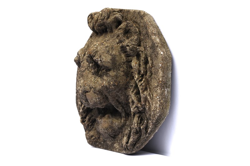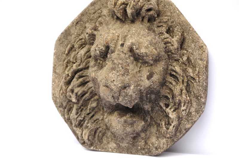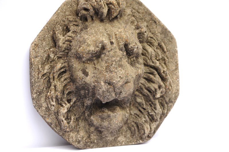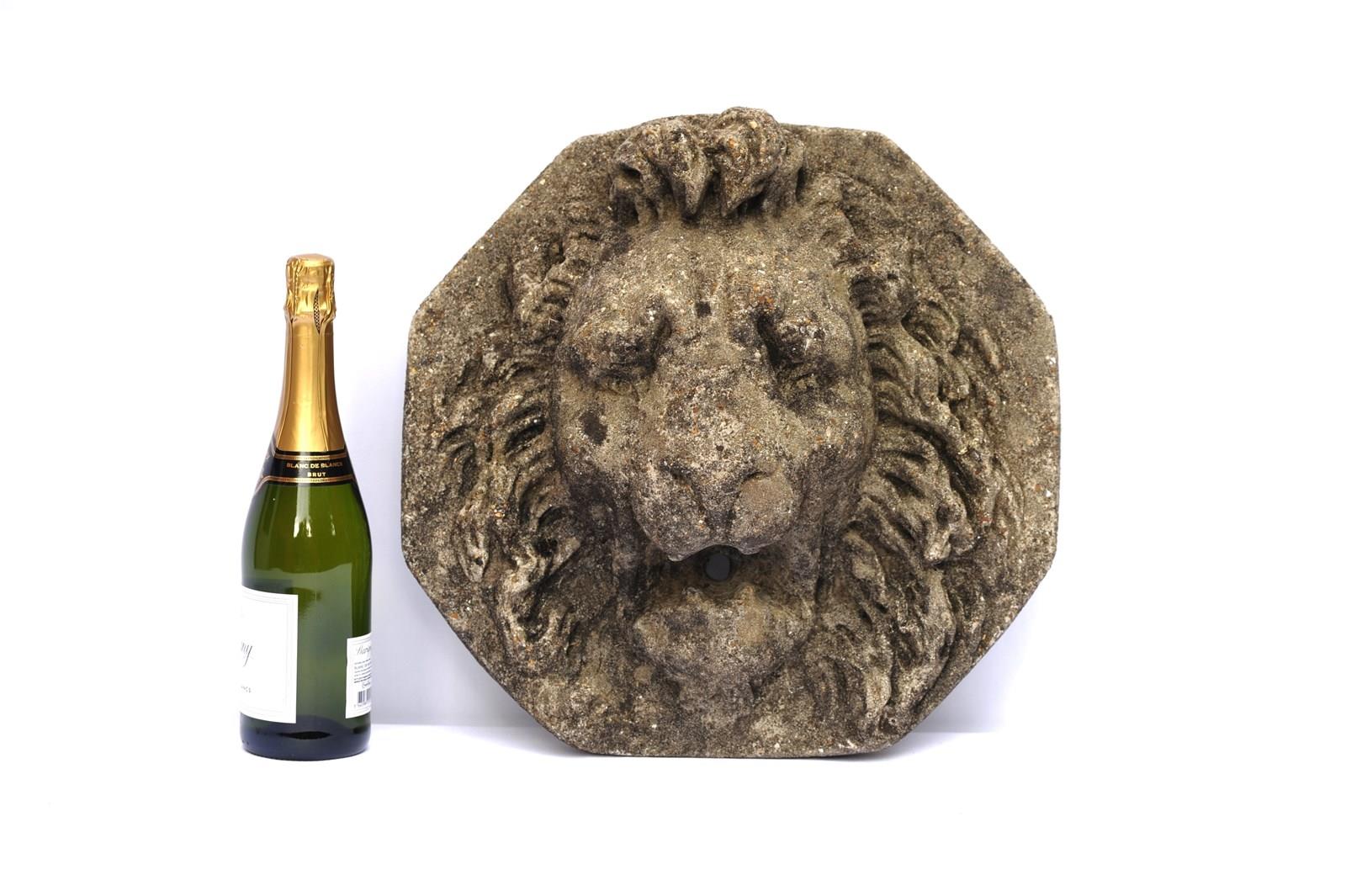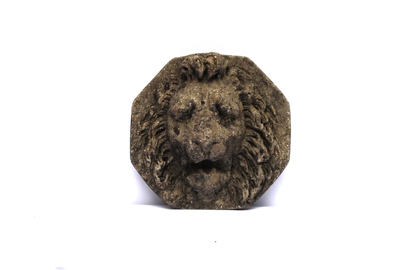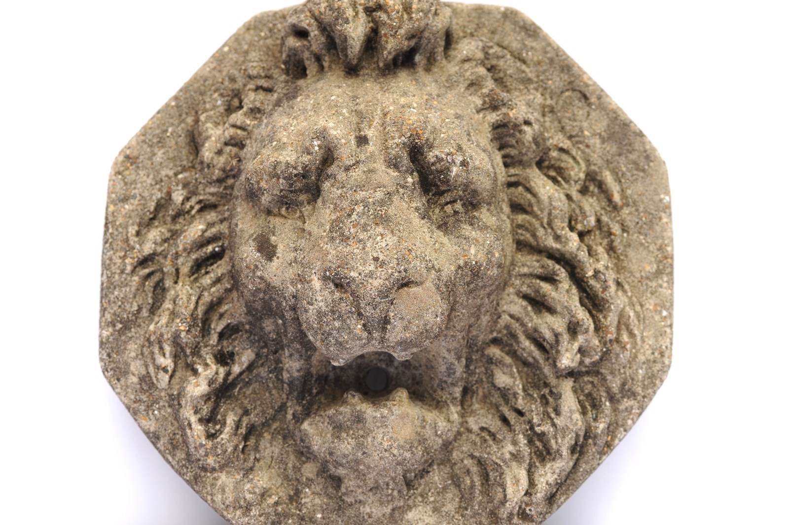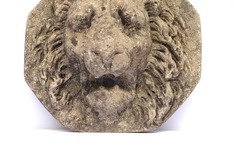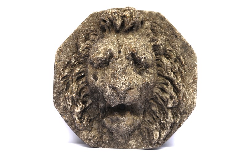 A large size cast stone lion water fountain head. Weathered garden condition. Heavy at around 18 kilos in weight. Measures approximately 16 inches x 16 inches & 6 inches in maximum projection. Spout hole 0.75 inches in diameter. Any questions please do not hesitate to ask. The price includes UK mainland delivery.