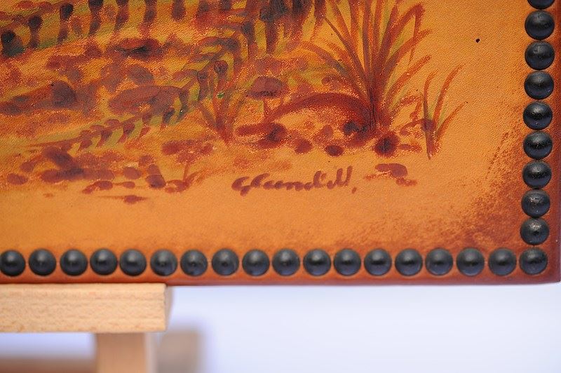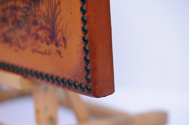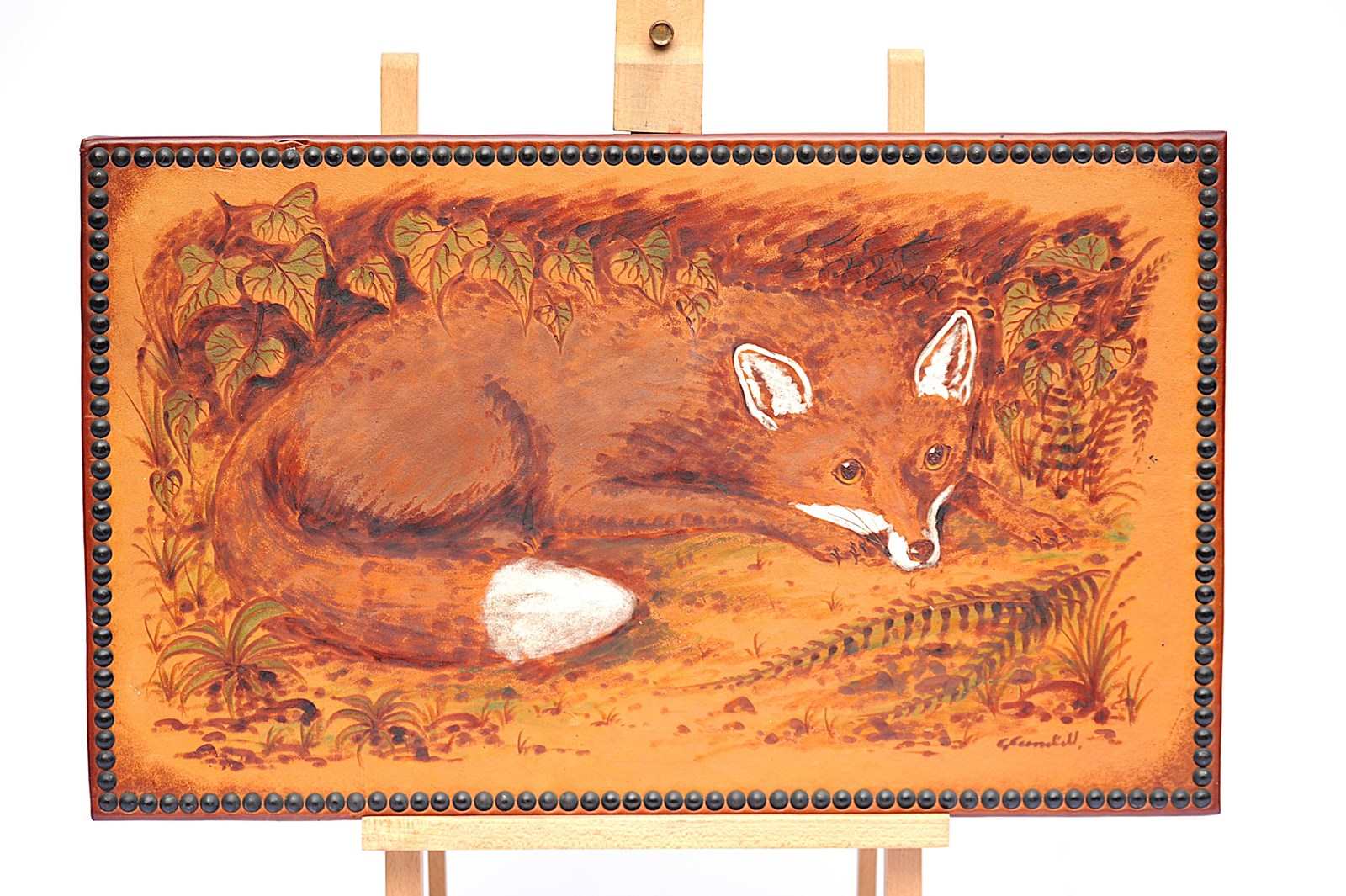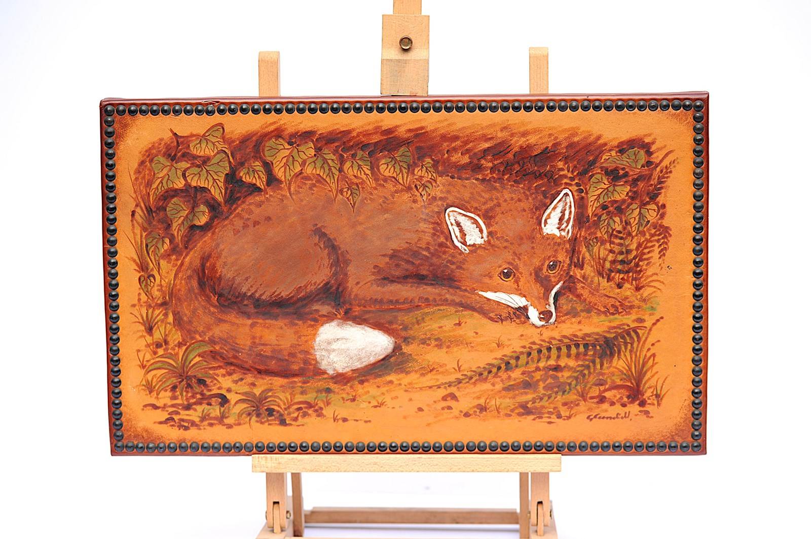 Circa 1980-90 Signed Leather Pokerwork (Pyrography) Resting Fox Scene in cover. Edges finished with brass stud work. Size 24 inches x 14 inches. Good overall condition. Sale includes delivery within the United Kingdom. This could make a wonderful gift to a keen fox lover.