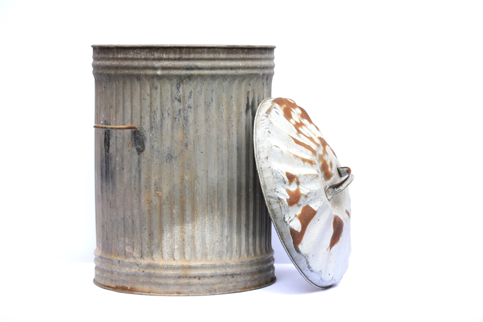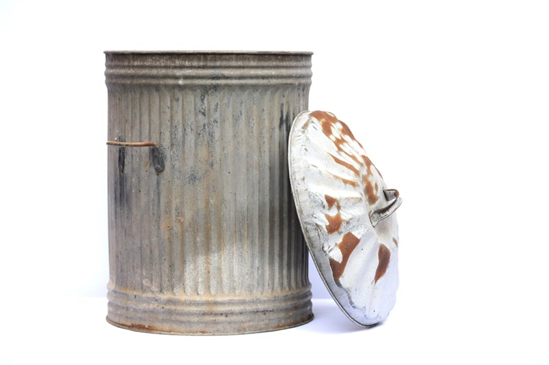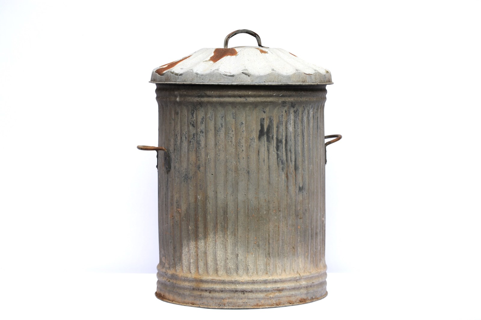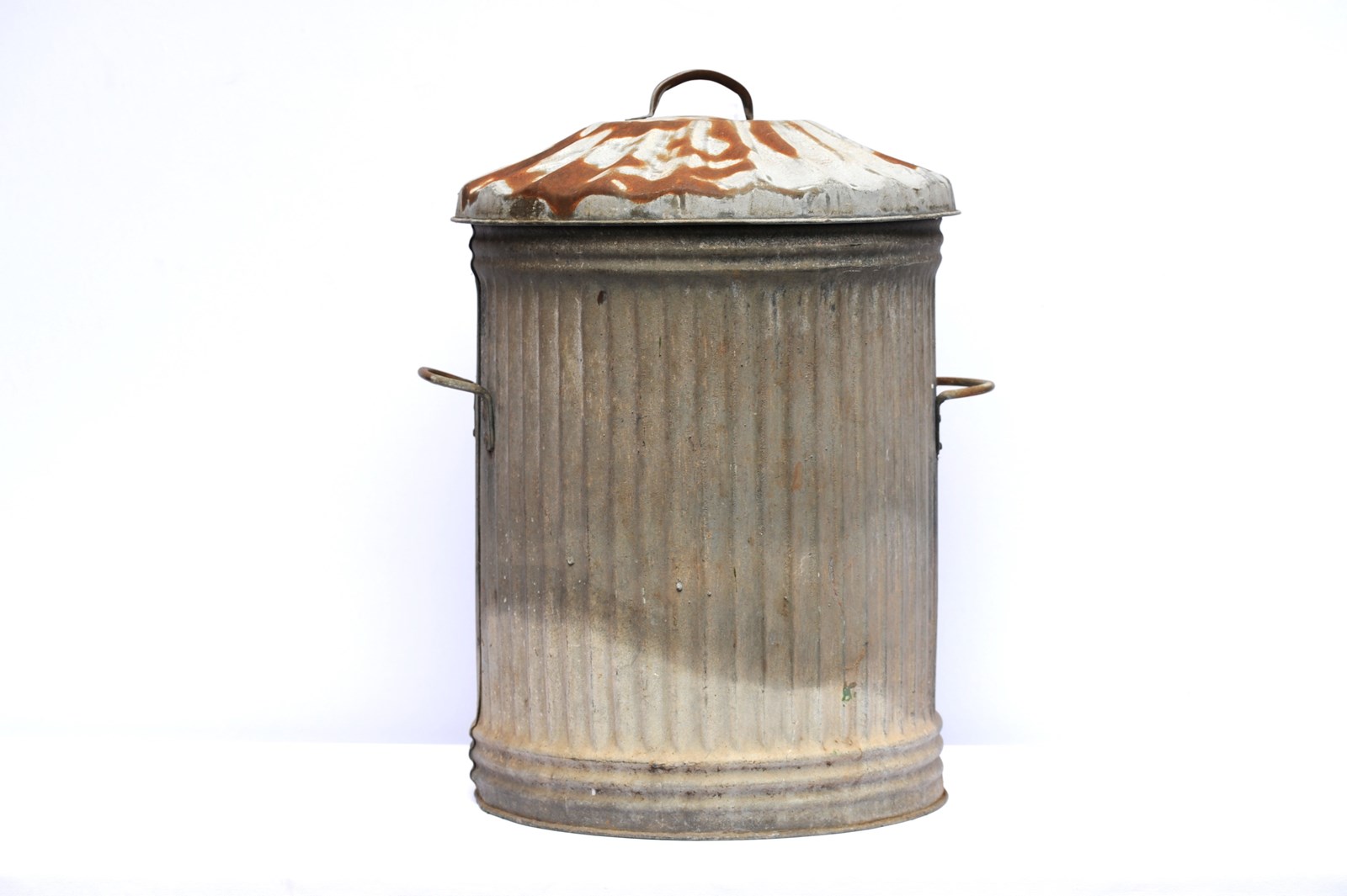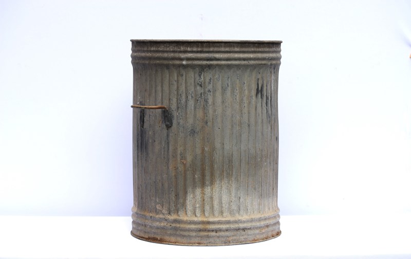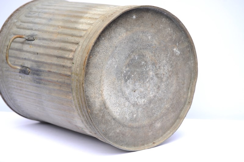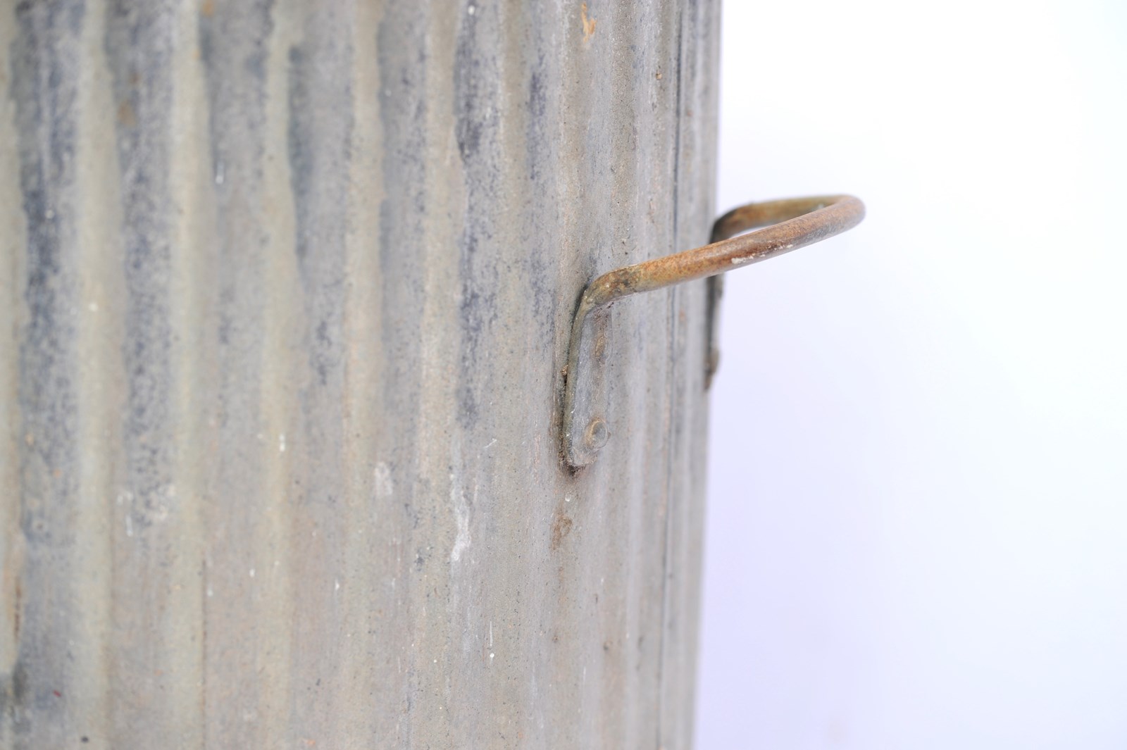 An original English mid 20th century corrugated galvanised metal bin with riveted side handles, now the ideal tall planter. The bottom is good & solid & overall it is in good overall condition. It appears there are no holes in the base, so if you are considering using this as a tall planter, holes may require adding. It comes complete with its original lid. Approximately 2 foot in height & 18 inches in diameter. Strong & well made, it weighs around 8 kg. Sale includes UK inland tracked delivery.