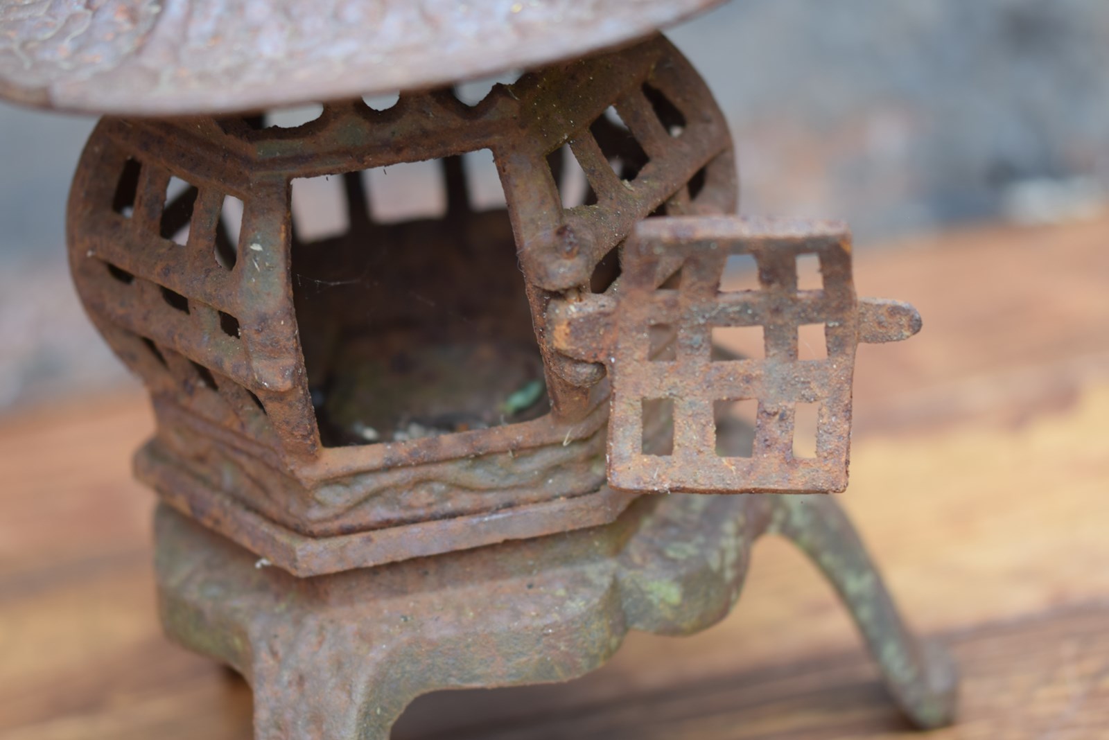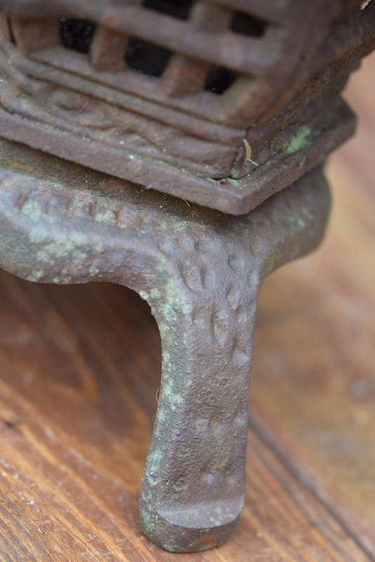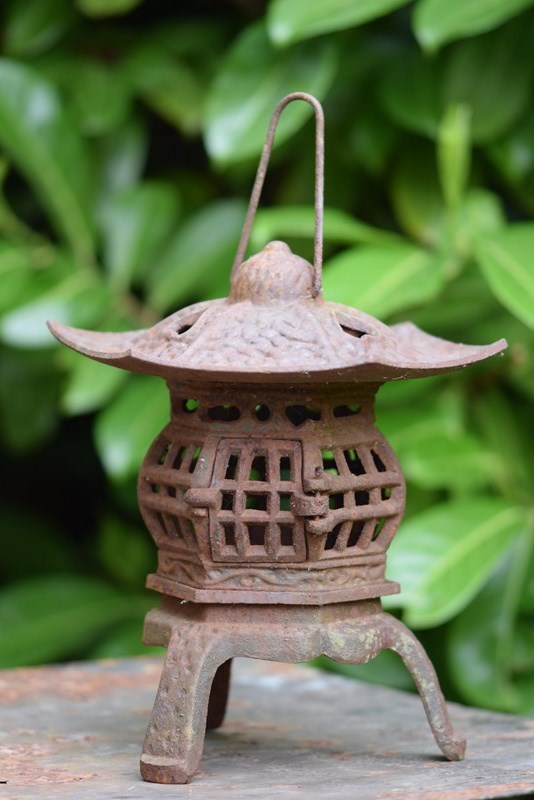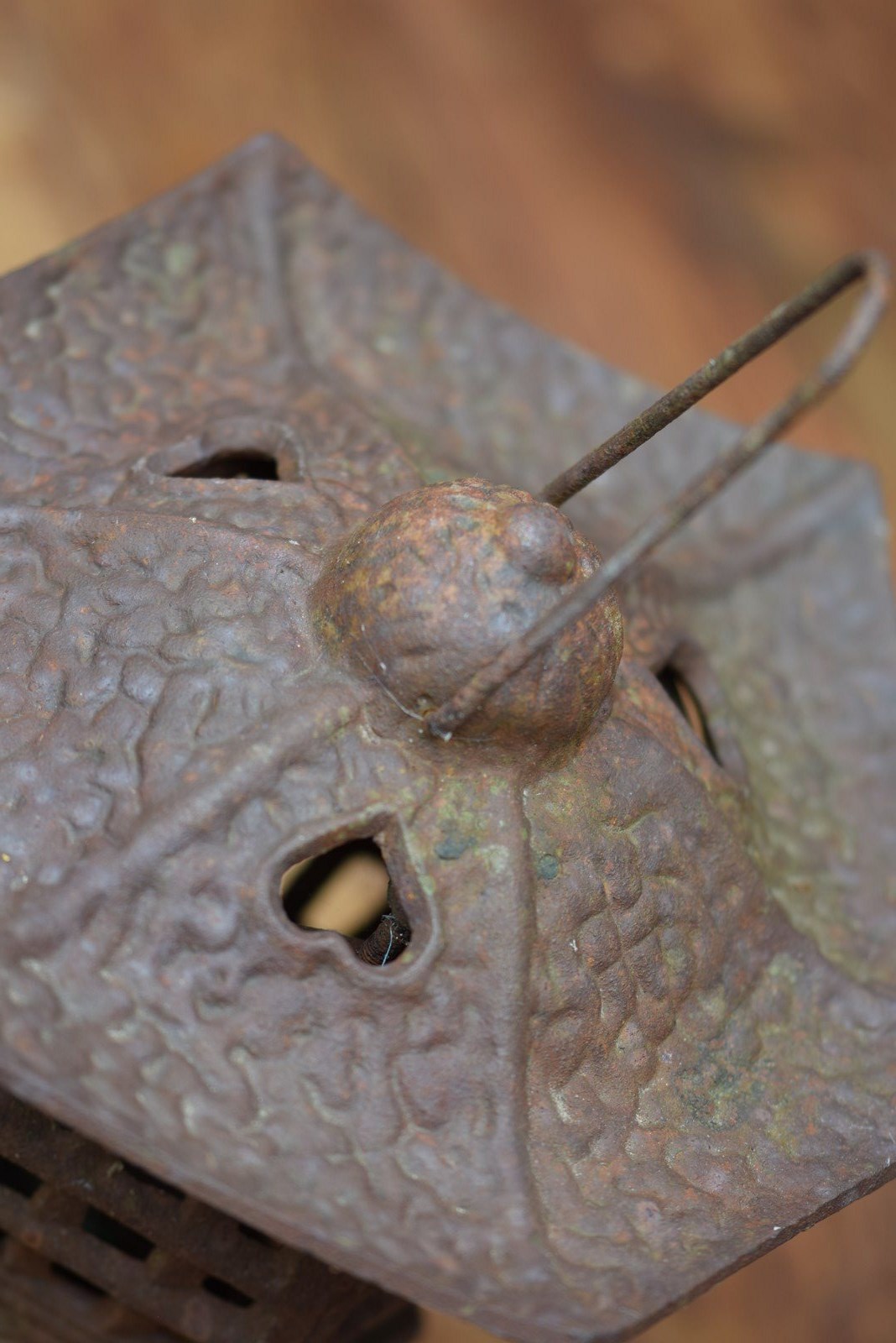 A vintage heavy cast iron Garden Pagoda Candle Lantern. The overall height including the top carry handle when upright is 12 inches. The top width is 9 inches across. Weight 3 kg. Door opens up to allow access to a candle base stand inside which is approximately 1.5 inches in diameter. Good overall garden weathered condition, ideal for cosy evenings outside. Free UK inland tracked delivery. Returns are happily accepted.