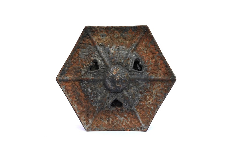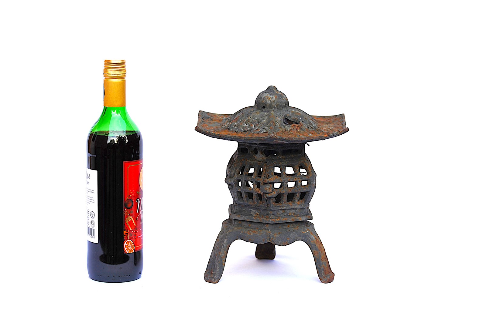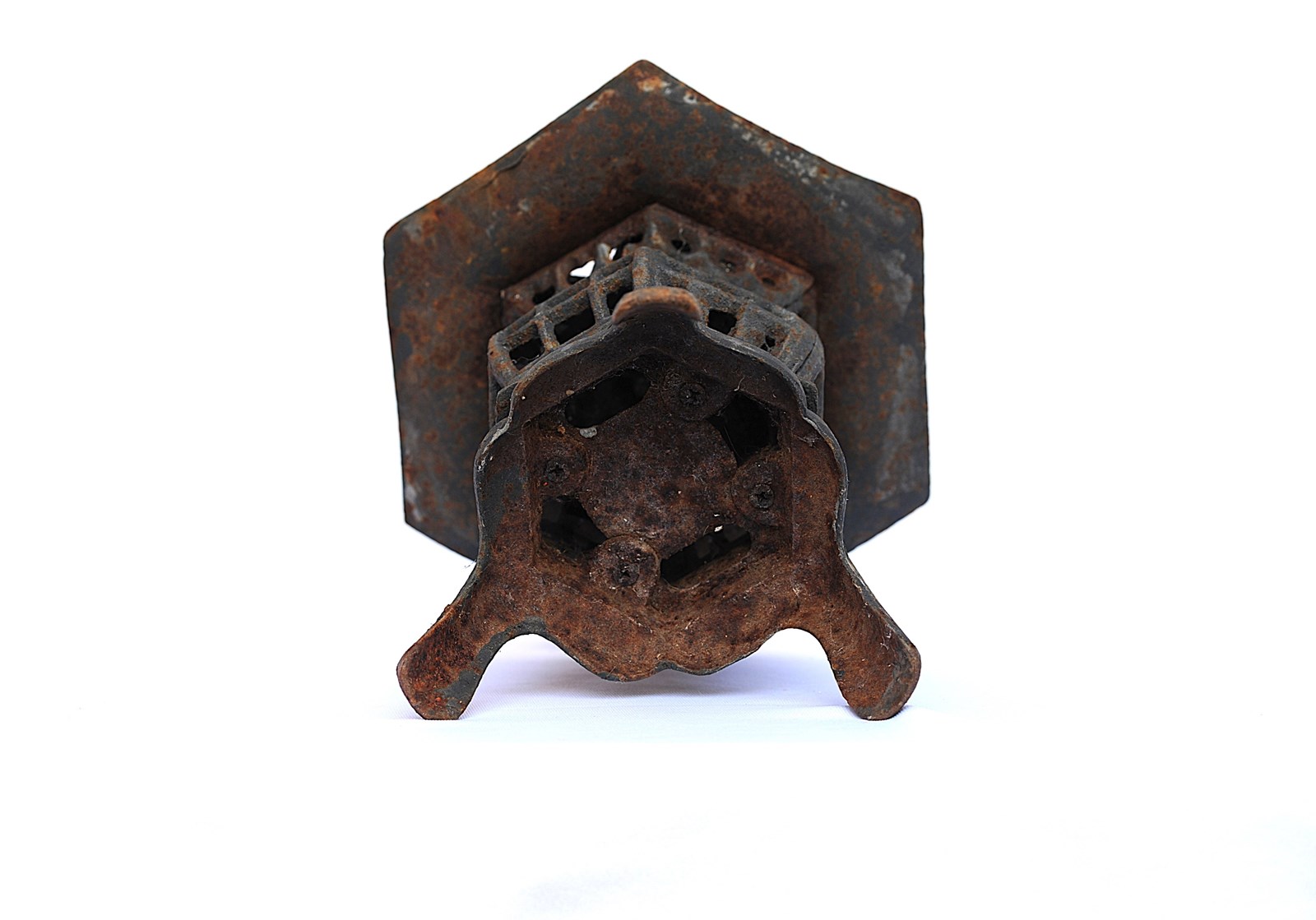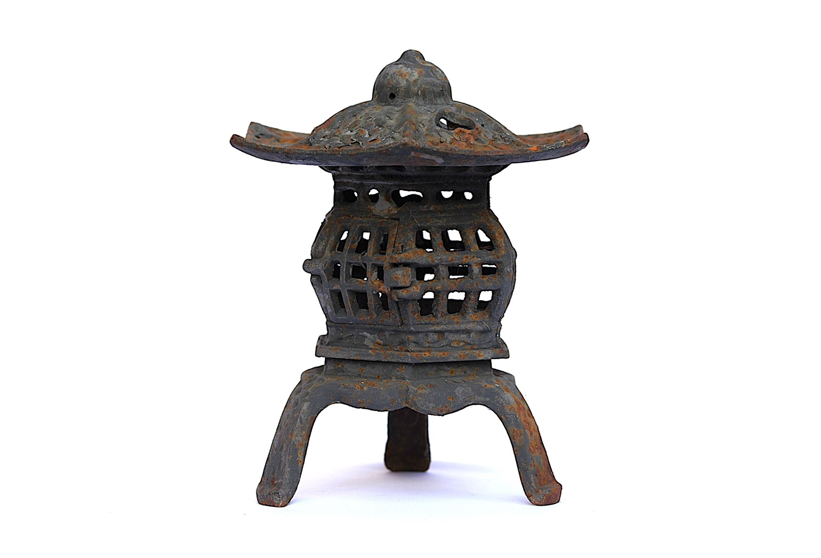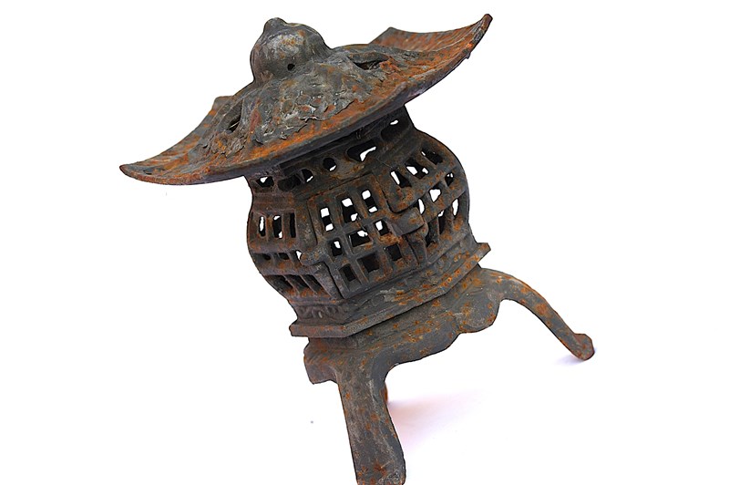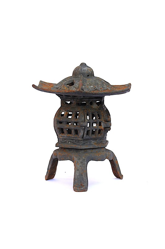 An old vintage heavy solid cast iron Garden Pagoda Lantern. Garden weathered & time worn. Approximately 10 inches in height & width, weighs around 3kg. A door opens up on the side (please see last image) to allow access to a candle stand inside which is approximately 1.5 inches in diameter. Ideal for cosy evenings outside now the weathers getting a little warmer. Sale includes delivery within the United Kingdom.