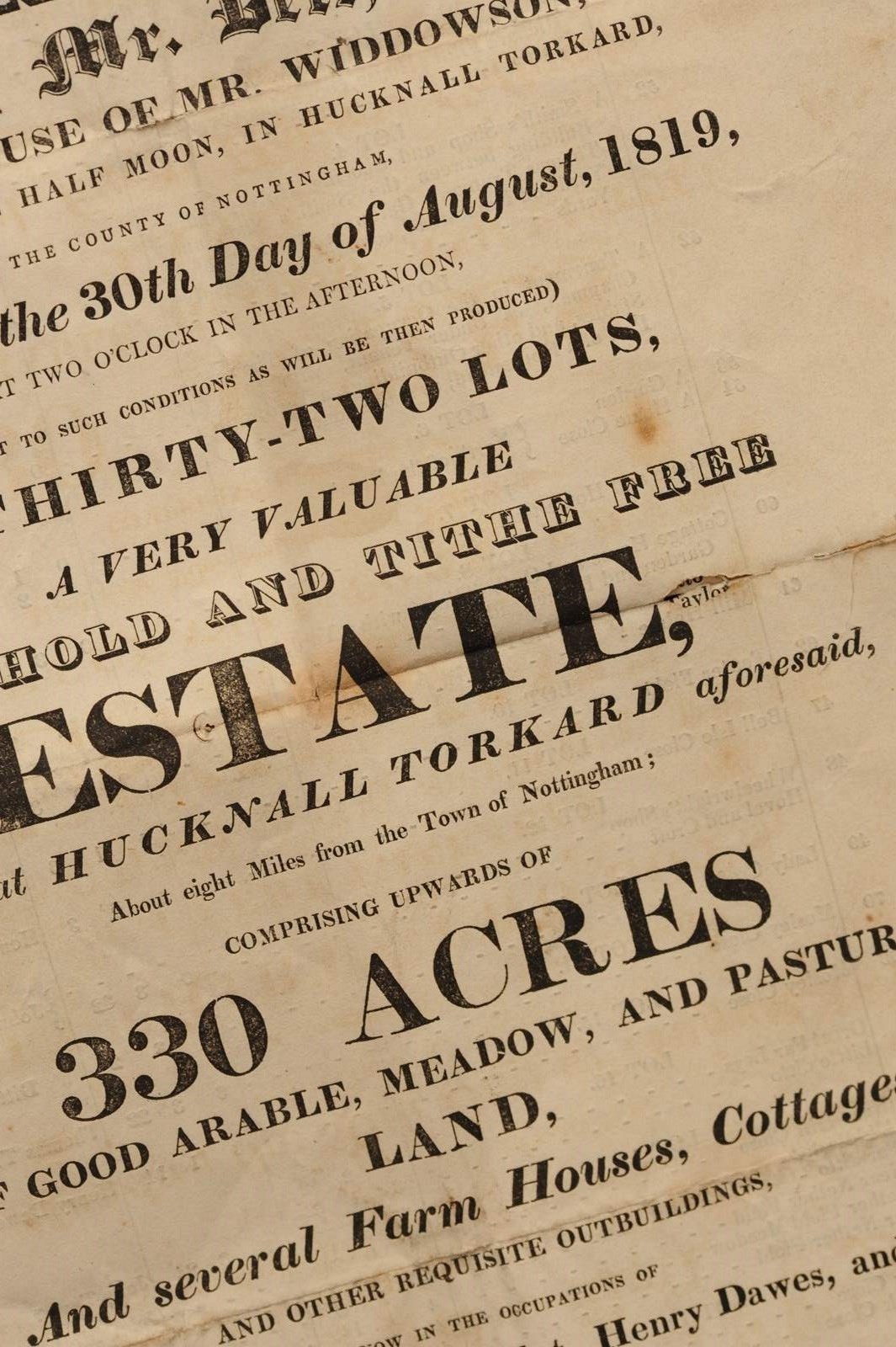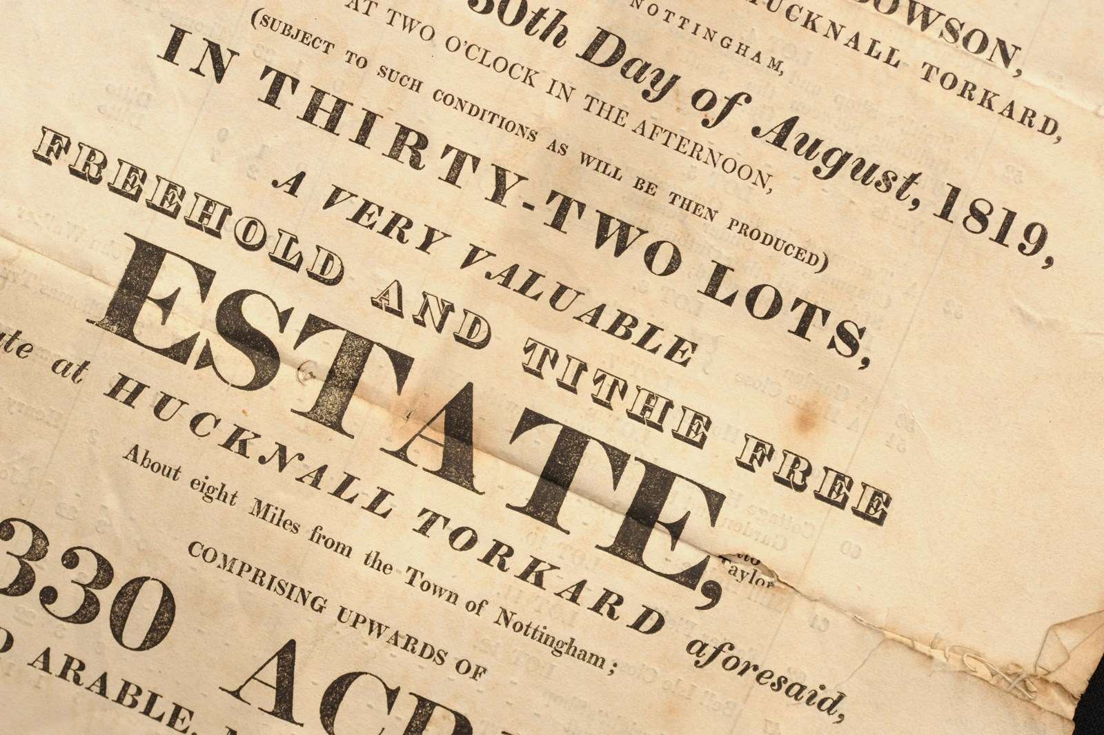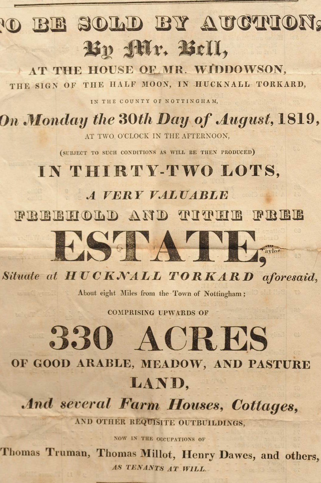 A George III period land auction poster & particulars. Hucknall Torkard, Nottinghamshire. Size 17" x 11", unfolded 17" x 22". Covering arable land, meadows, pastures, farm houses, cottages & other buildings. Dates to Monday 30th August 1819. Interesting to note how G.Stretton, Nottinghamshire, the printers of this poster used every typeset they had when printing the front page, showing off their printing skills. A unique survivor from the late Georgian period & almost certainly the only one still in existence, it would look great framed. Sale includes UK inland tracked delivery.