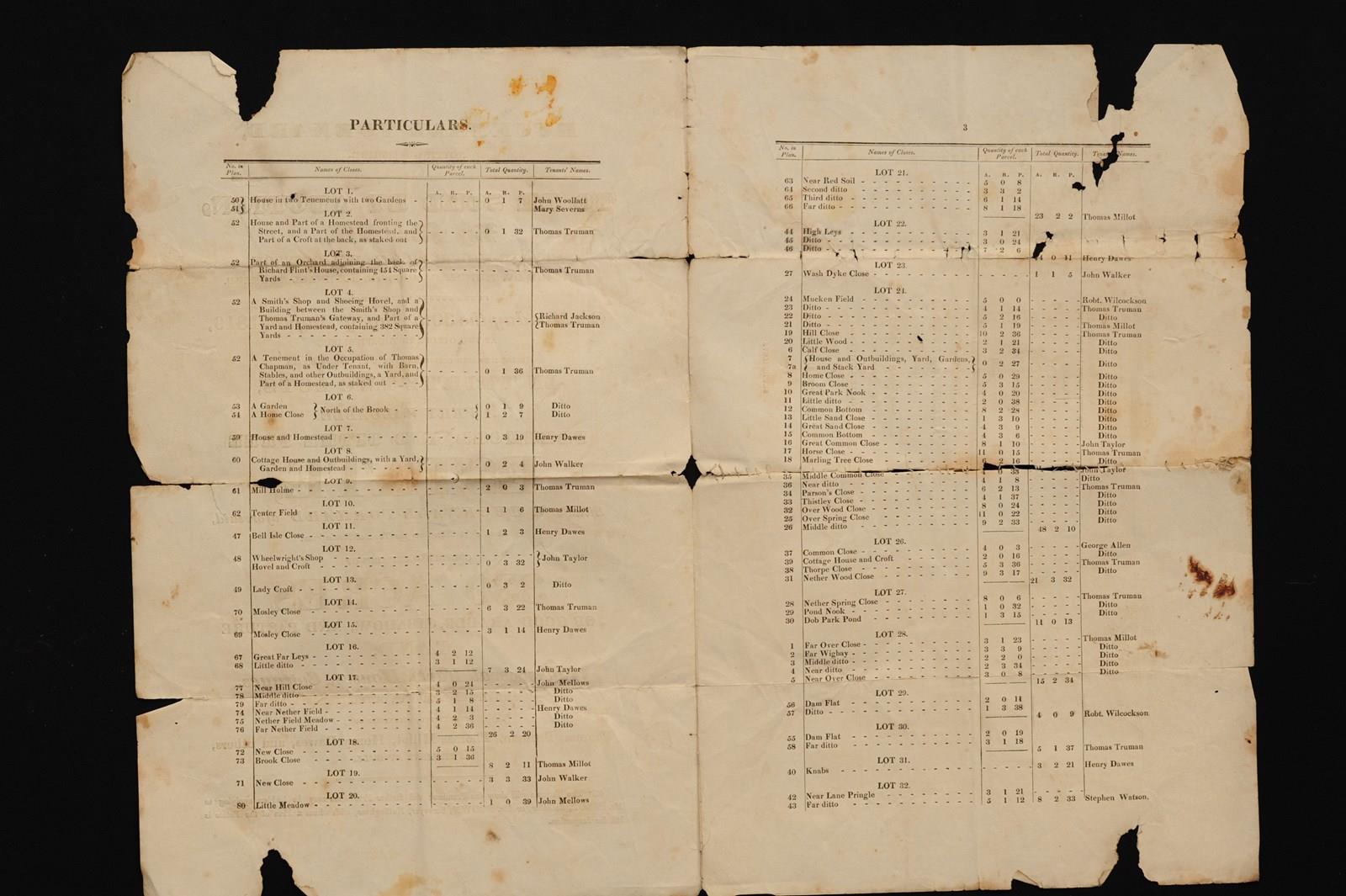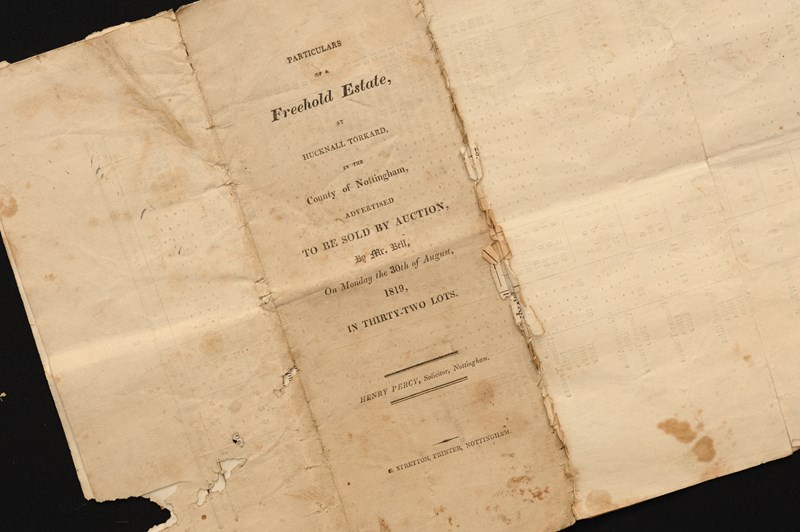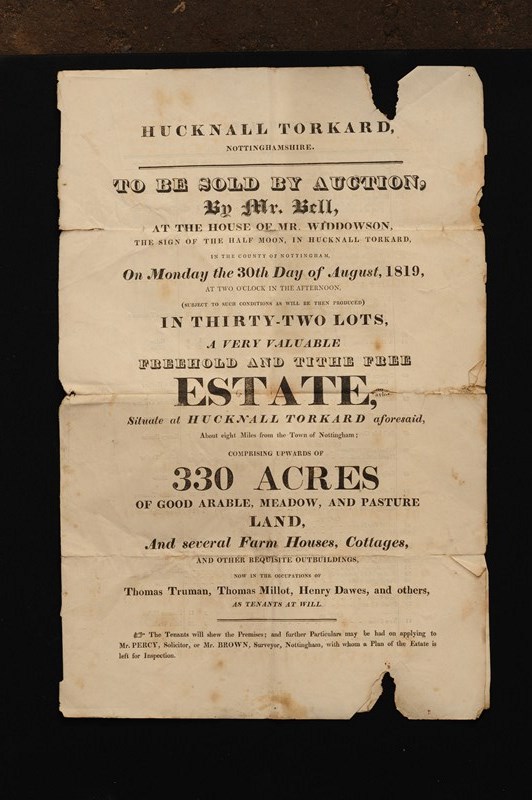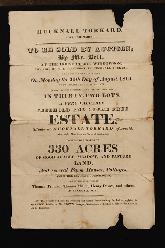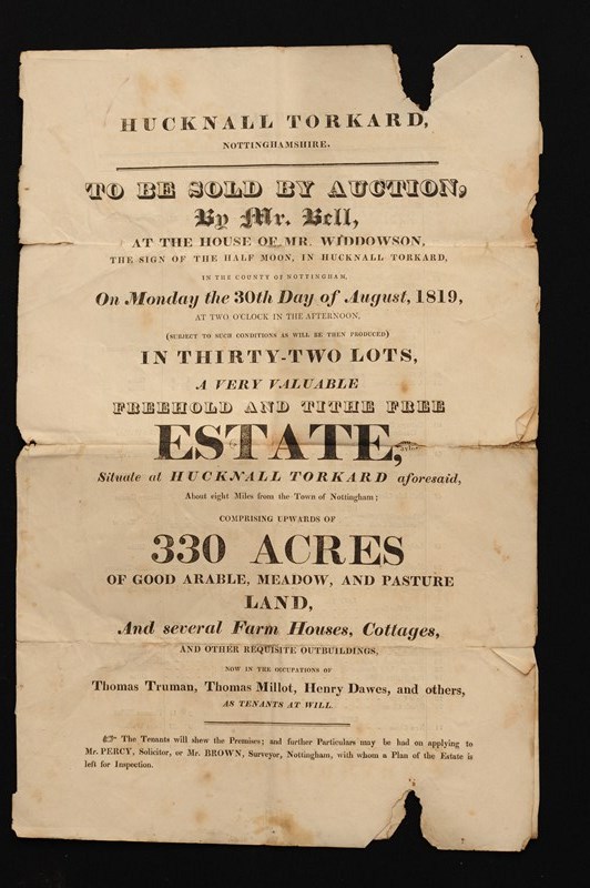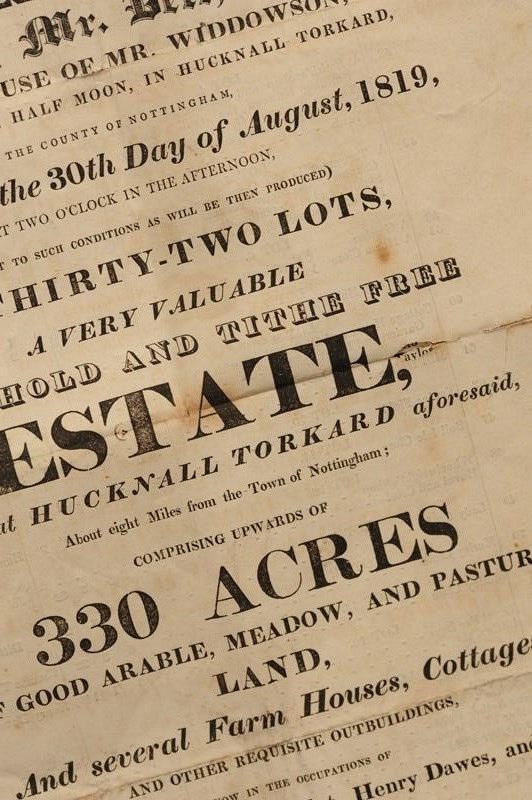 A George III period land auction poster & particulars. Hucknall Torkard, Nottinghamshire. Size 17" x 11", unfolded 17" x 22". Covering arable land, meadows, pastures, farm houses, cottages & other buildings. Dates to Monday 30th August 1819. Interesting to note how G.Stretton, Nottinghamshire, the printers of this poster used every typeset they had when printing the front page, showing off their printing skills. A unique survivor from the late Georgian period & almost certainly the only one still in existence, it would look great framed. Sale includes UK inland tracked delivery.