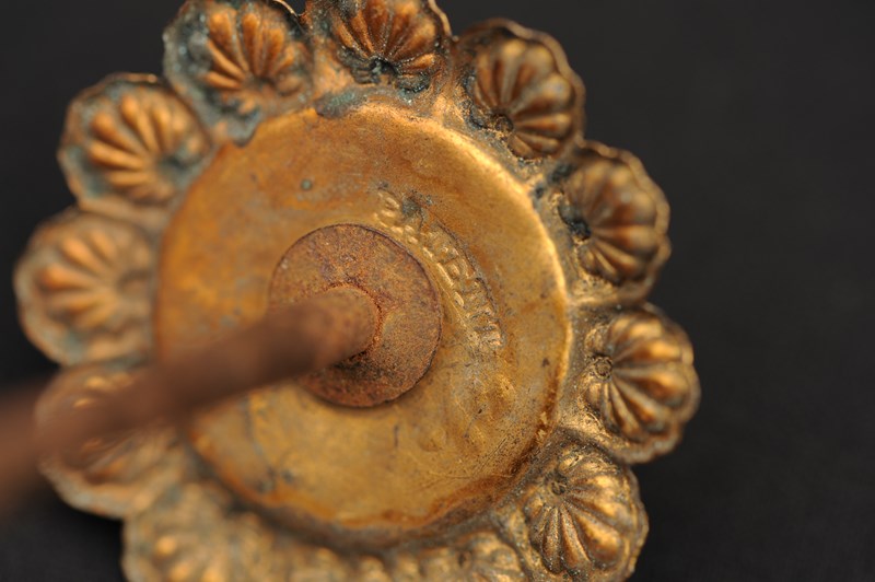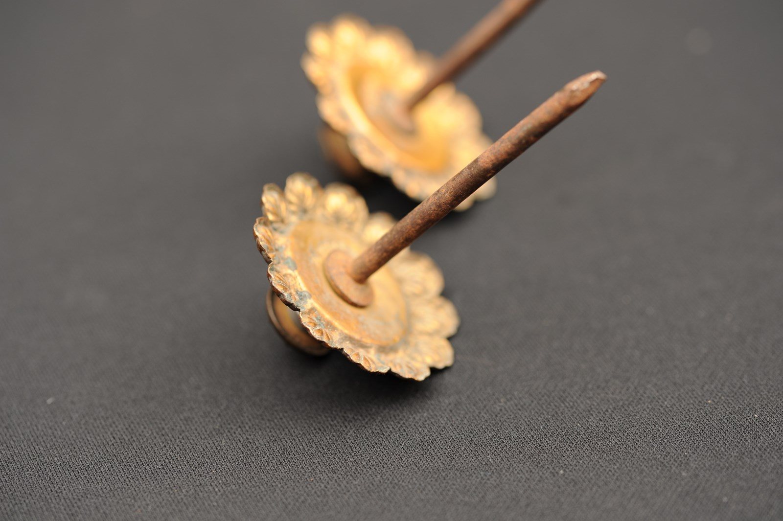 An extremely scarce pair of Late Victorian country house English Patent picture hanging nails / hooks. Pretty gilt brass petal shaped wall plate mounted with a round white porcelain centre and a brass embossed capped centre protruding picture wire support. Wall plate 1.75 inches in diameter, fixing nail length 2.25 inches. Both in good overall original untouched condition. Sale is for the pair & includes UK inland delivery.
