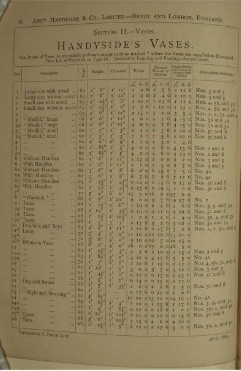 Please see the last few images of an historical trade catalogue, lower centre depicting, shows the tazza vase in the Handyside catalogue of the late 1870s. Illustrated paired with a catalogue addition No. 8 pedestal.