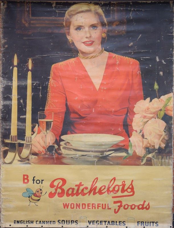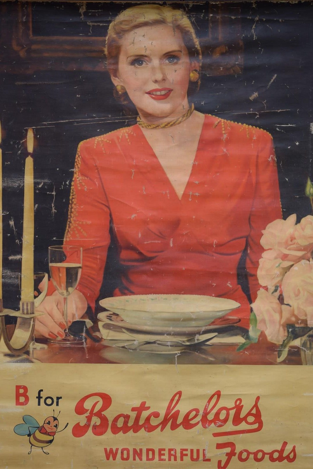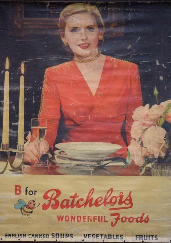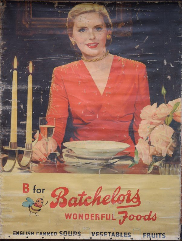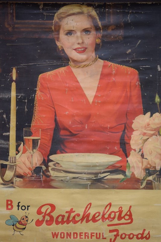 Exceptionally rare large (huge) circa 1950 advertising hoarding for Batchelors Foods. Hand painted oil on canvas. One side. Approximately 91 inches x 70 inches or 2.3 metres x 1.8 metres. Old original condition with marks & wear. Displays well. Sale includes UK inland tracked delivery, it will be sent rolled.