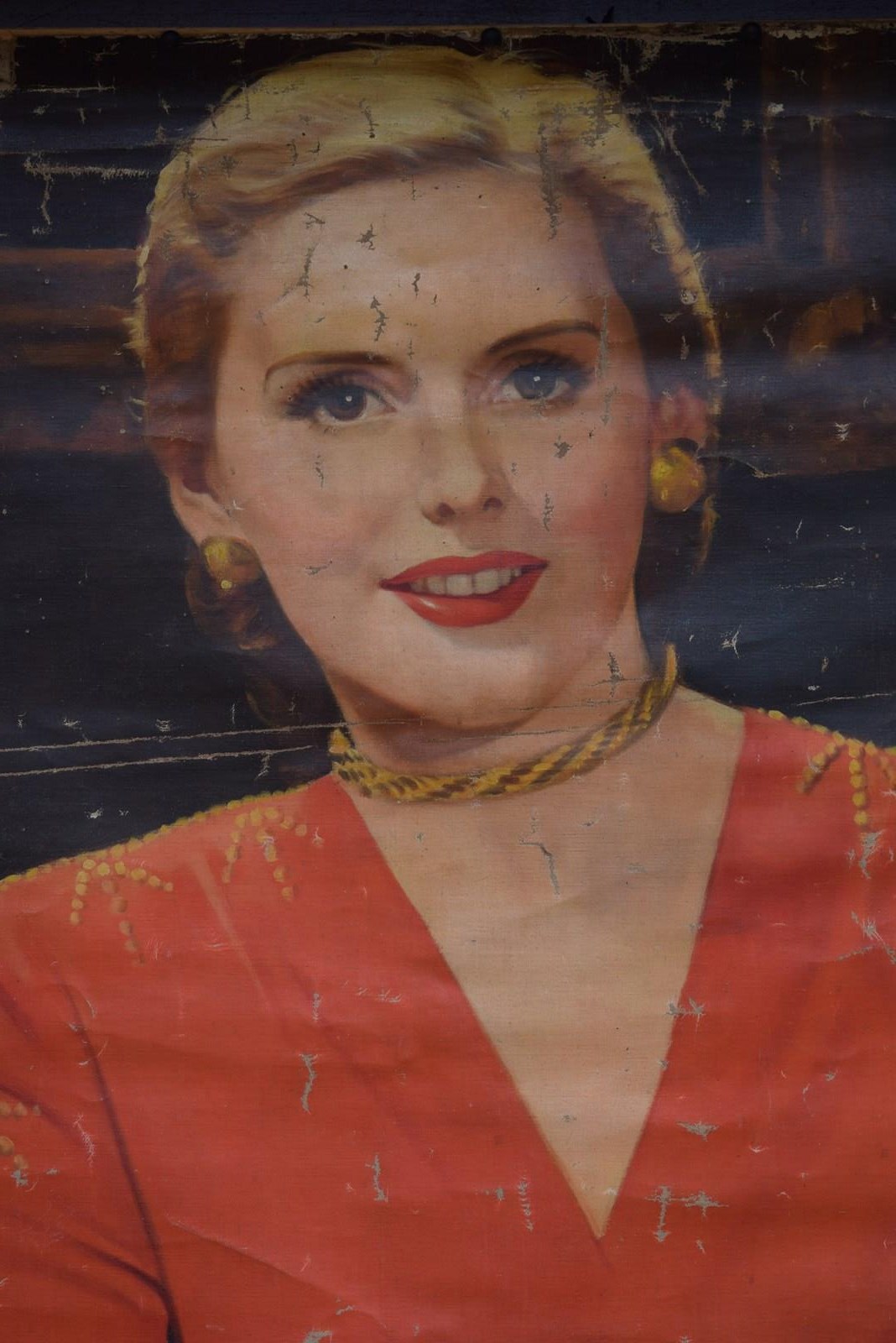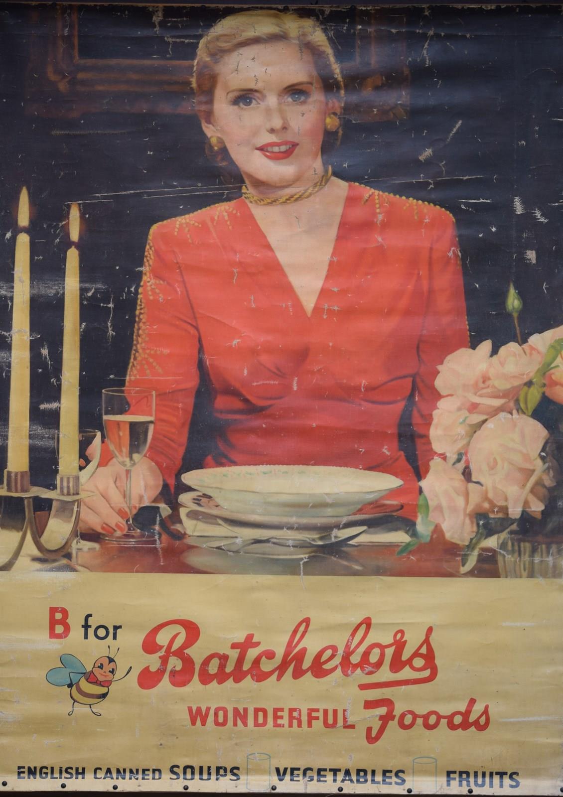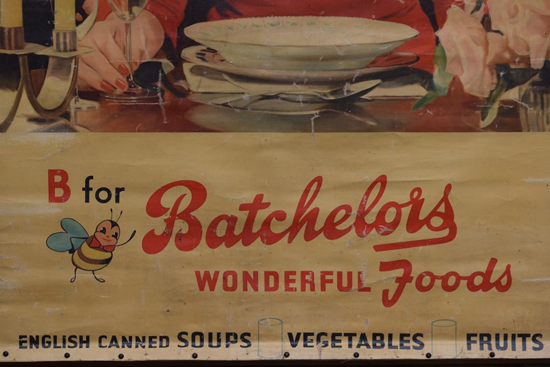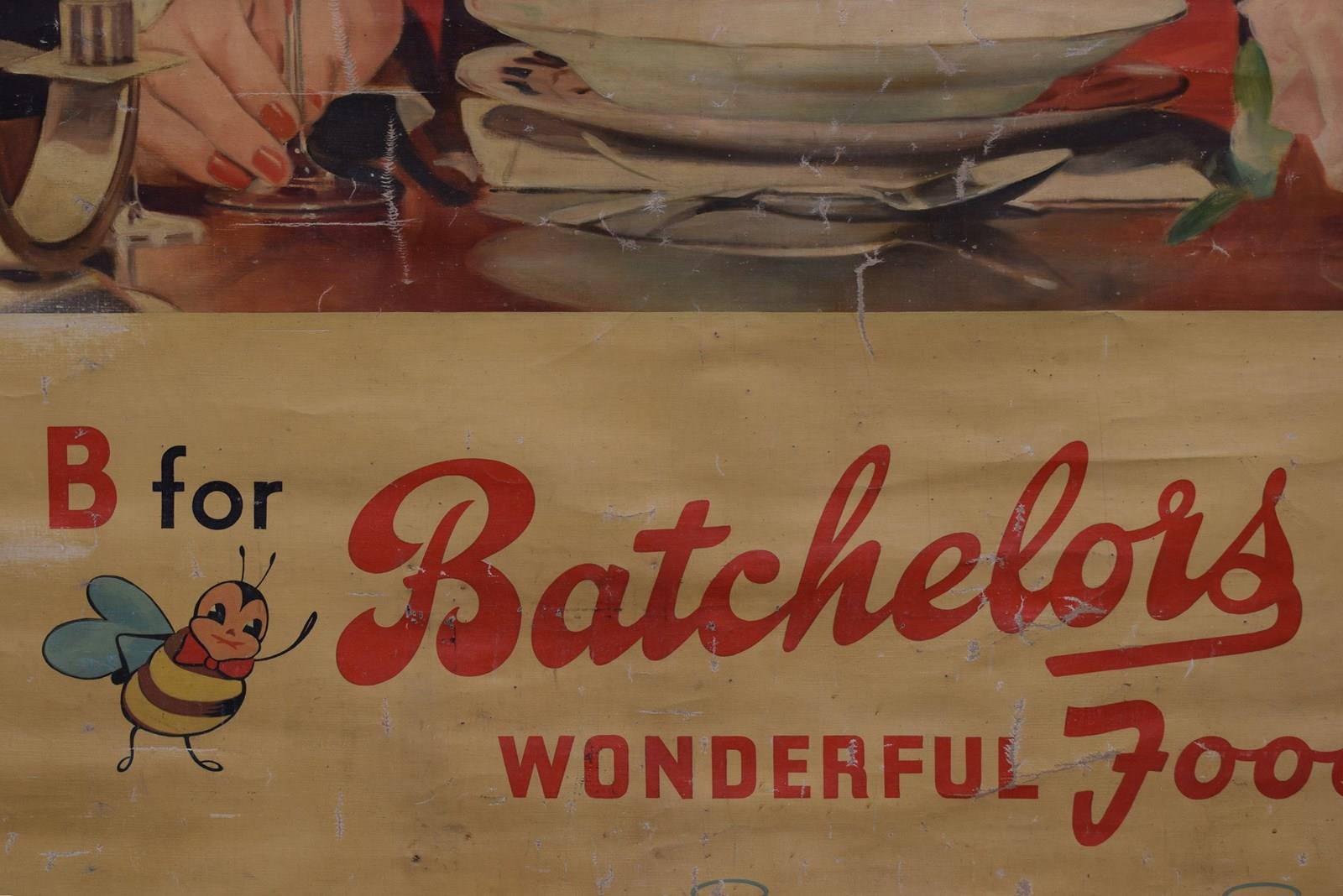 Exceptionally rare large (huge) circa 1950 advertising hoarding for Batchelors Foods. Hand painted oil on canvas. One side. Approximately 91 inches x 70 inches or 2.3 metres x 1.8 metres. Old original condition with marks & wear. Displays well. Sale includes UK inland tracked delivery, it will be sent rolled.