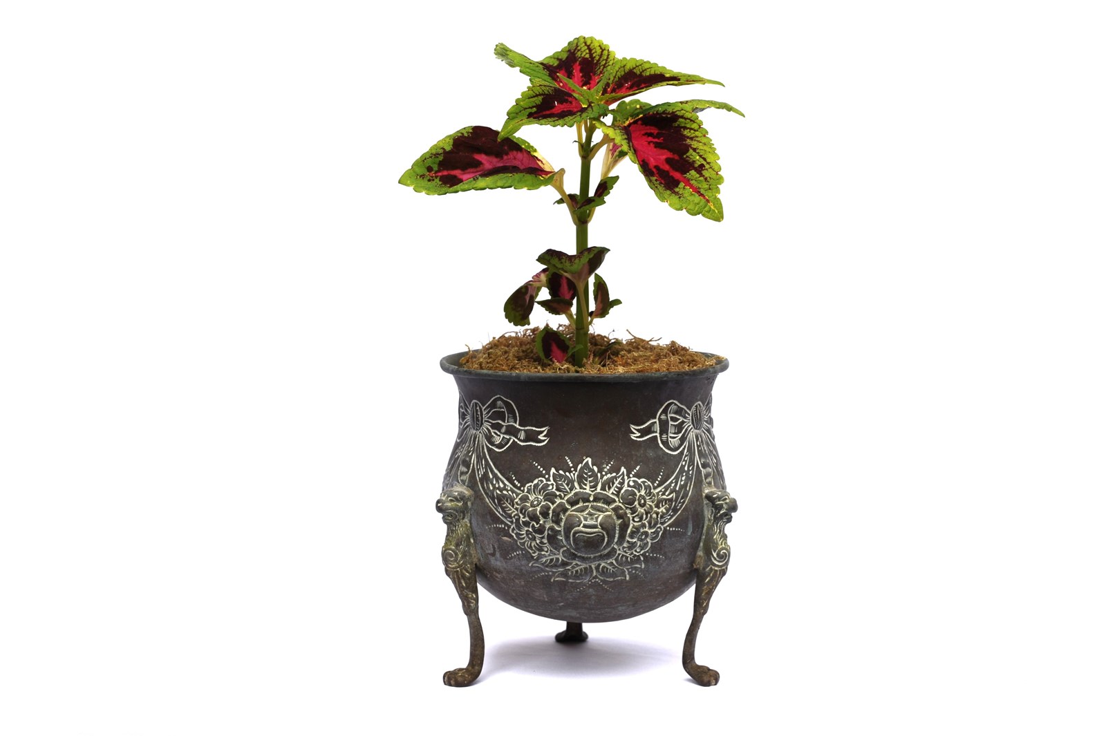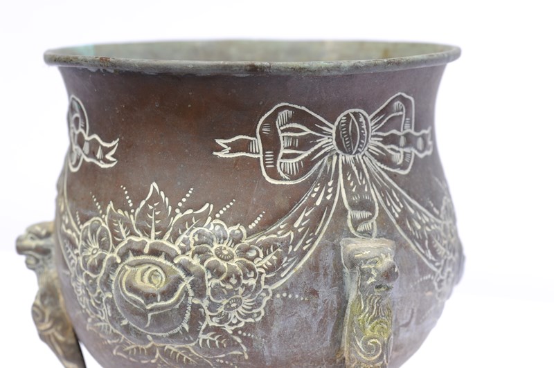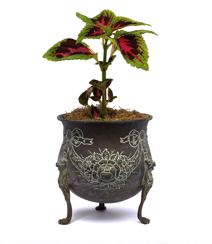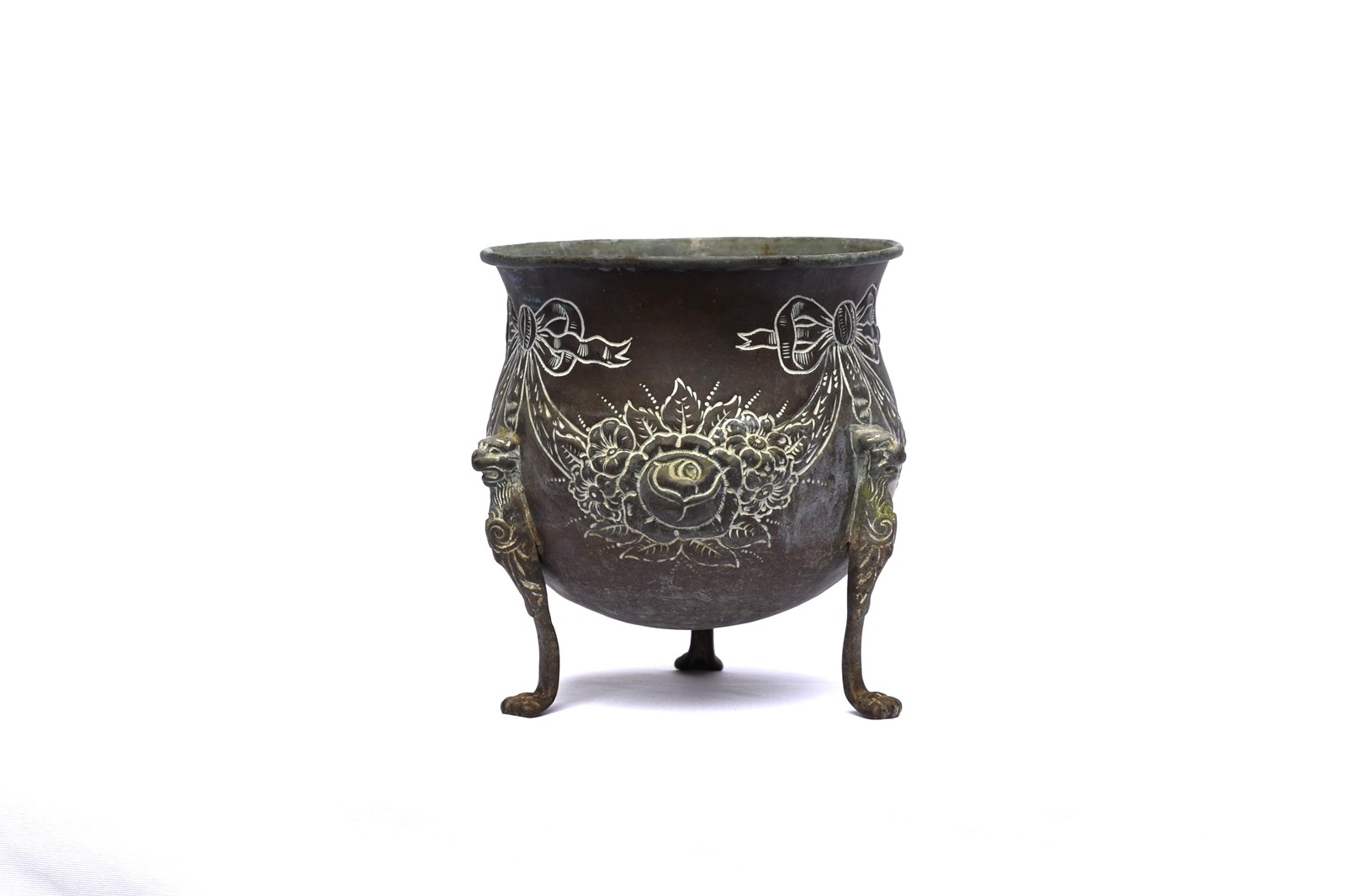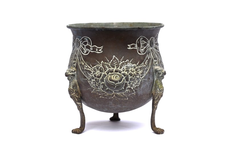 A beautiful untouched dinanderie indoor planter. Dates to around c1920. Hand embossed copper body with with three solid brass lion & paw standing feet. It has clearly never been polished, which we love! The subsequent time aged patina it now carries is so lovely. It is watertight so quite usable for its intended purpose. It will hold around 3 litres of compost. Good overall completely untouched original usable condition. Sale includes UK inland tracked delivery. Returns are happily accepted.
