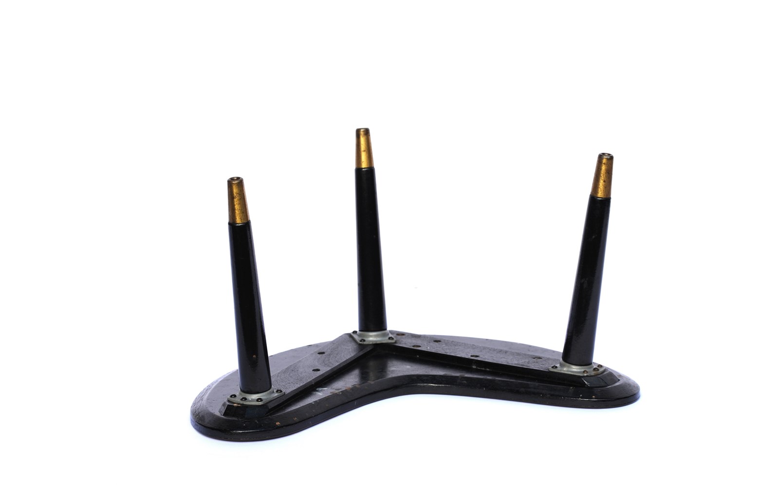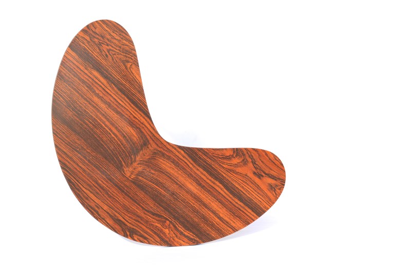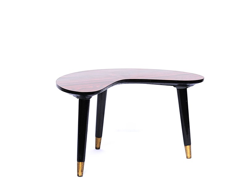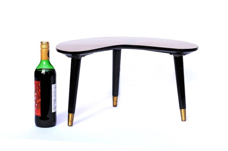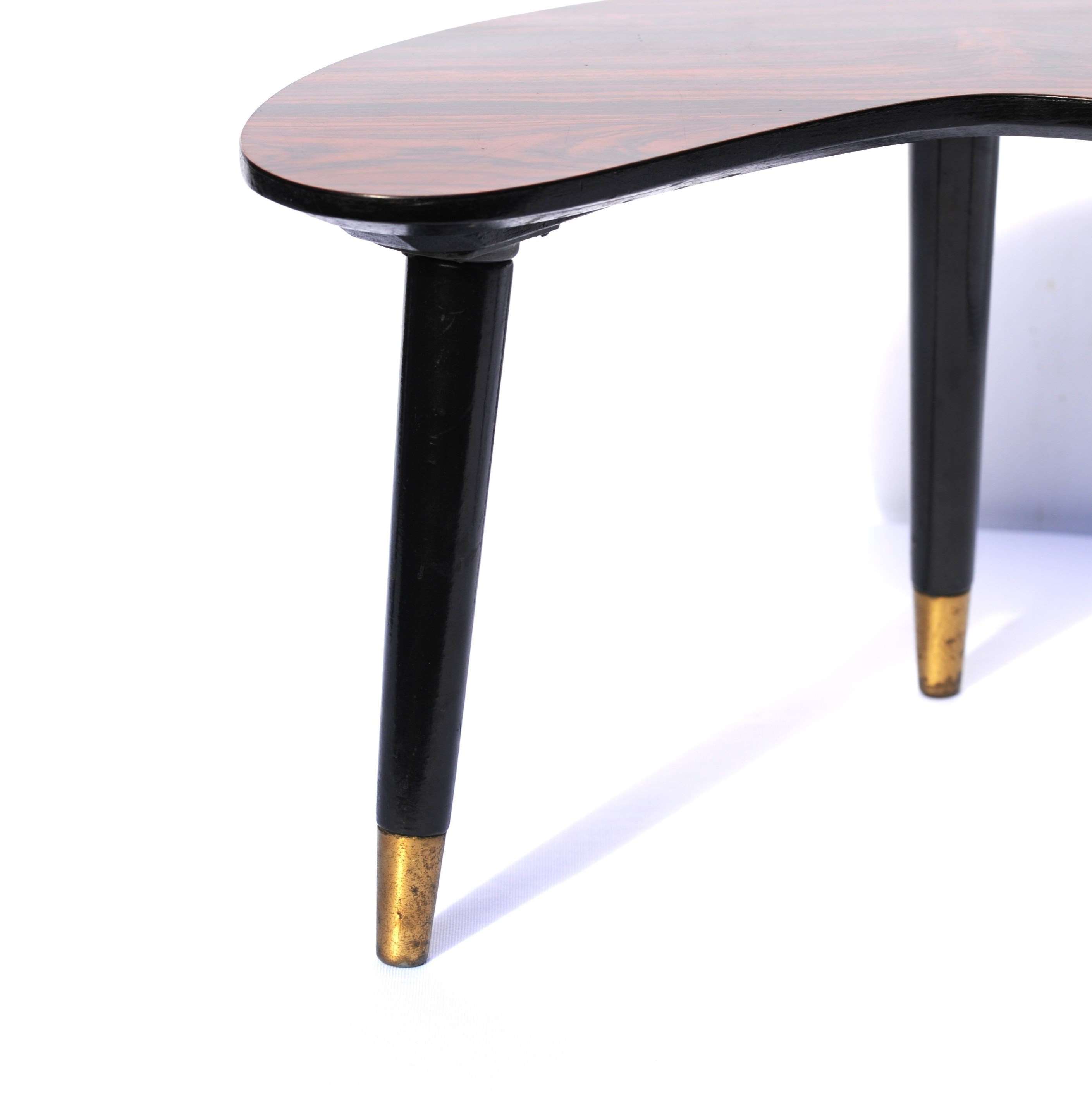 Circa 1950 - 1960 Kidney shaped side table. Grain effect durable melamine formica top on a ebonised solid beech wood base frame with three legs capped in brass. Legs unscrew. Good condition, solid & firm, stands well. Height 10.5 inches. Sale includes UK delivery.