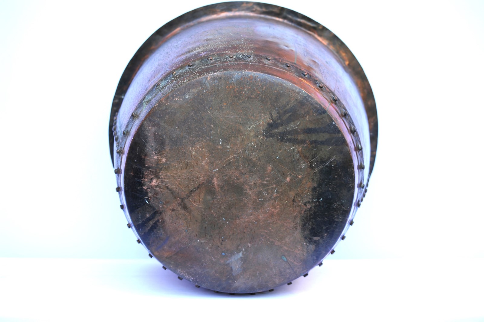 An English late 19th-century large riveted copper tank. Now ideal as a planter or log basket. Height 19 inches. Diameter 26 inches. Weight 10 kg. Holding capacity around 20 imperial gallons. Good overall solid condition, well made originally from high quality copper, most likely mined in the west country. Sale includes delivery within the United Kingdom.