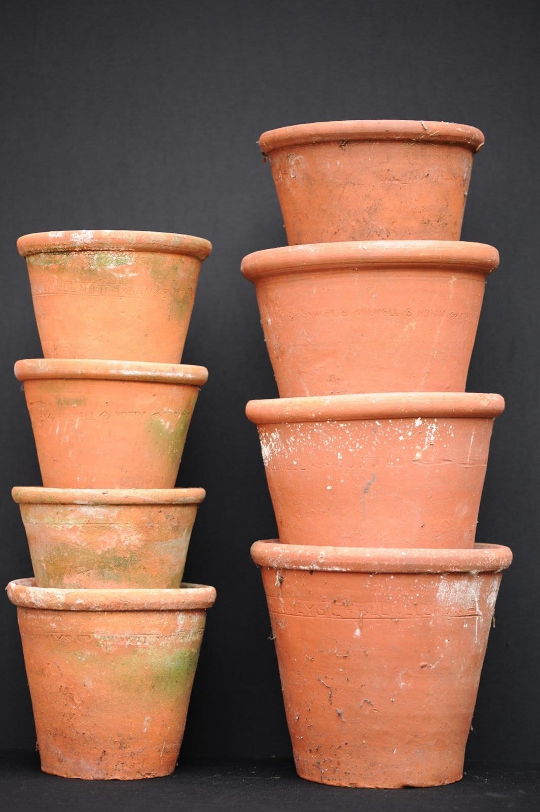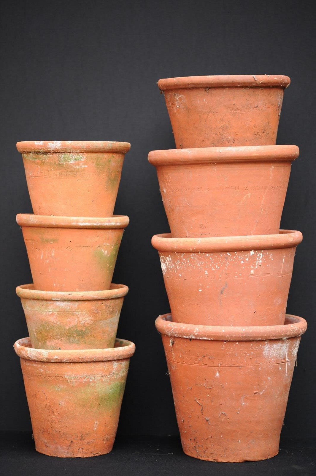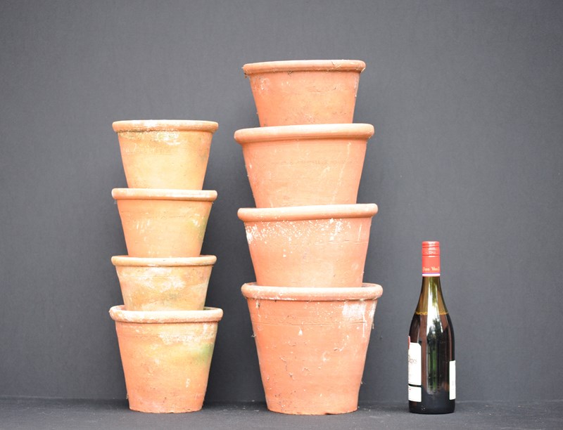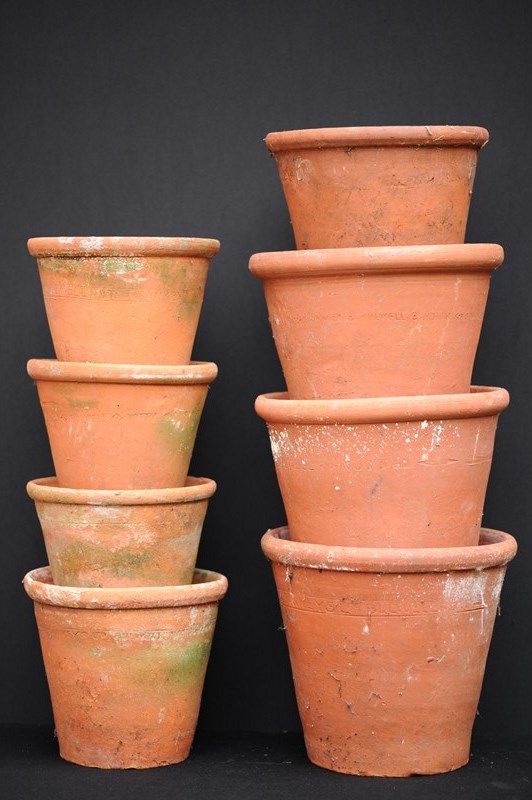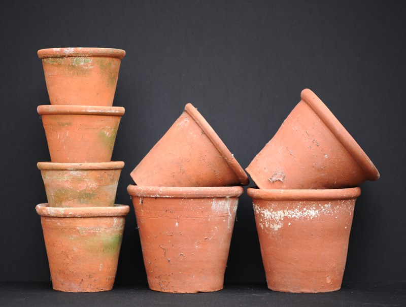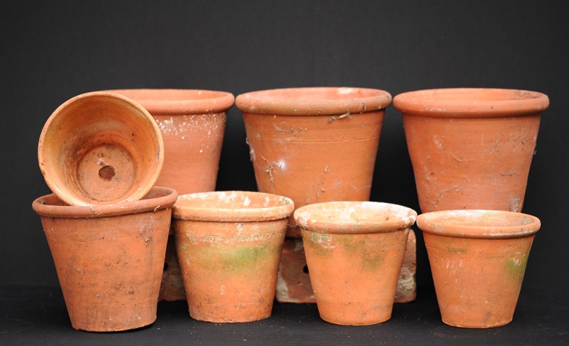 A collection of eight larger size antique horticultural late 19th century English hand thrown terracotta planters. Good condition, no cracks, all ring well when lightly tapped. This collection of eight planters can be dispatched free of charge for delivery within the United Kingdom.