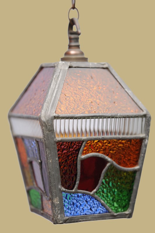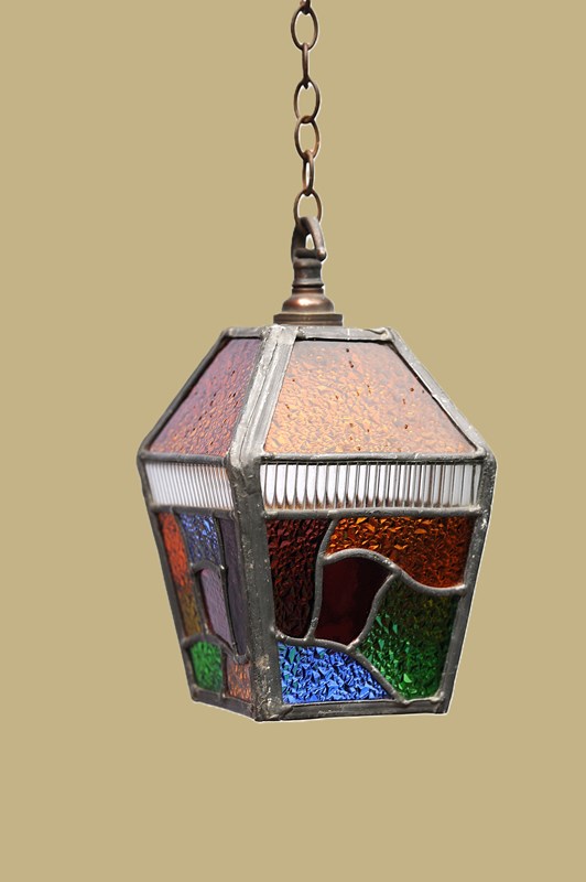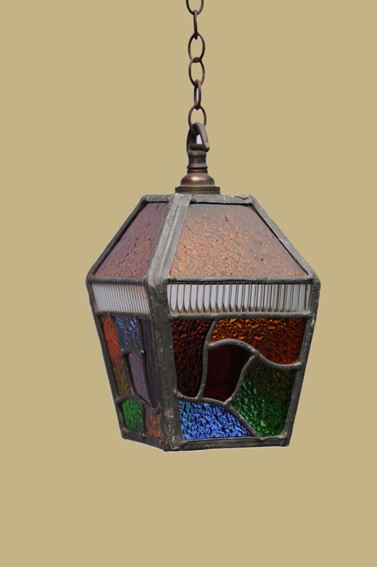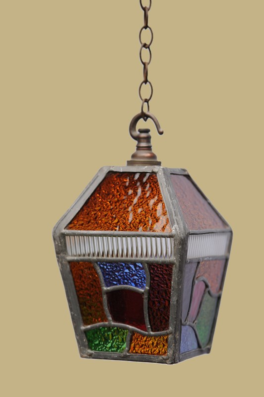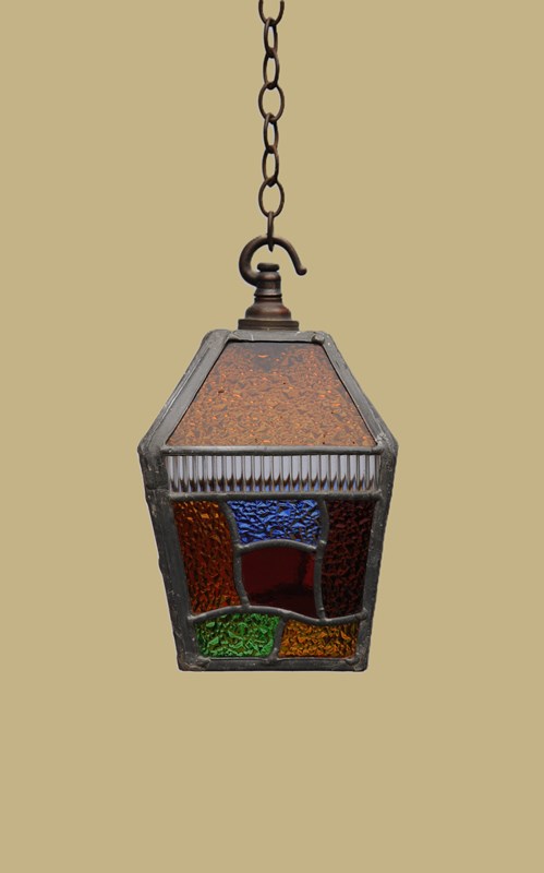 The most beautiful antique lead & stained glass porch lantern. English circa 1920. Good selection of glass colours, amber, blue, green, red, clear, orange. In excellent untouched original condition, no broken glass panels or repairs. Suppled with a short length of original hanging chain. Just requires professionally wiring in, you may choose to change the bulb holder although the original looks in good condition. Sale includes delivery within the United Kingdom. Dispatched within a week of purchase. Returns are happily accepted within 5 days of receipt.