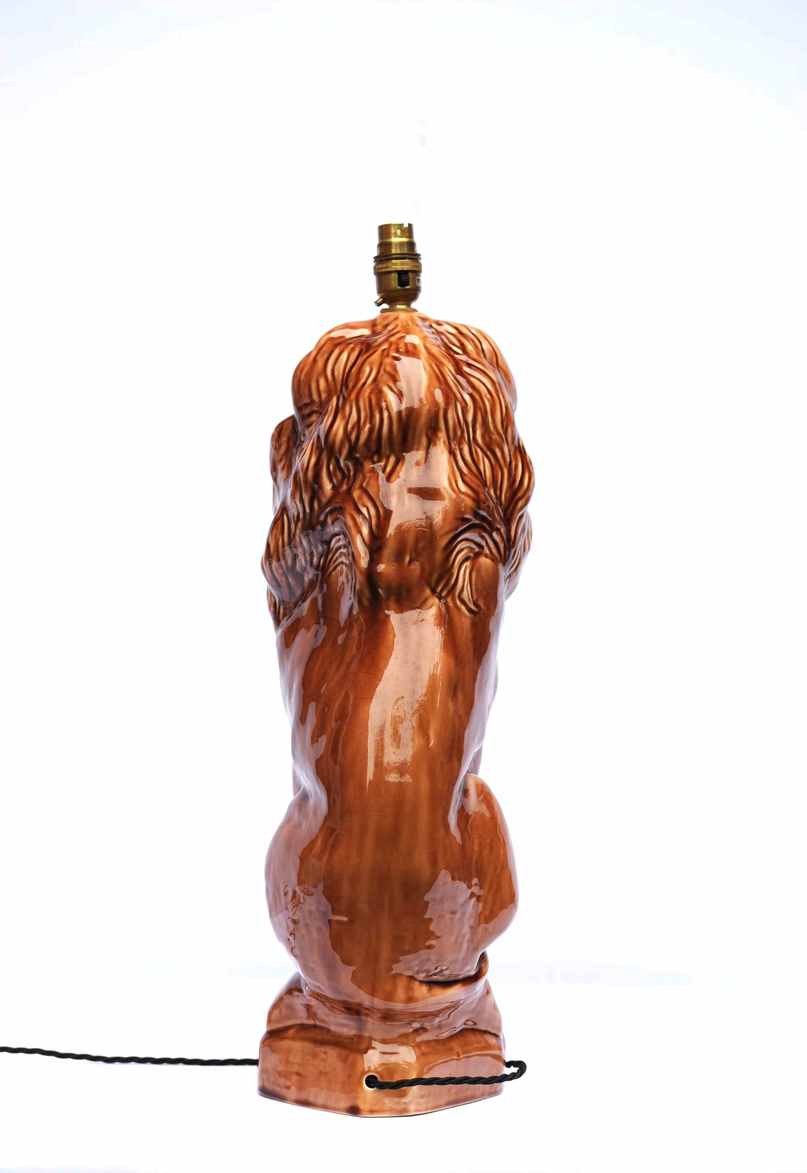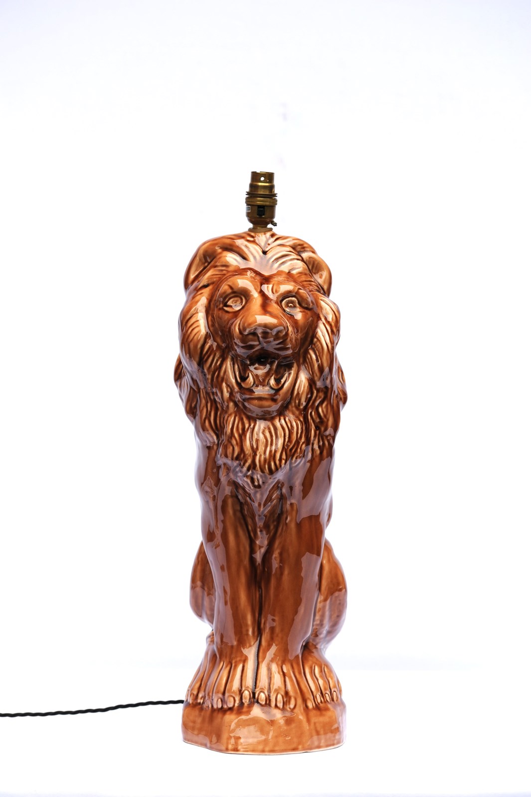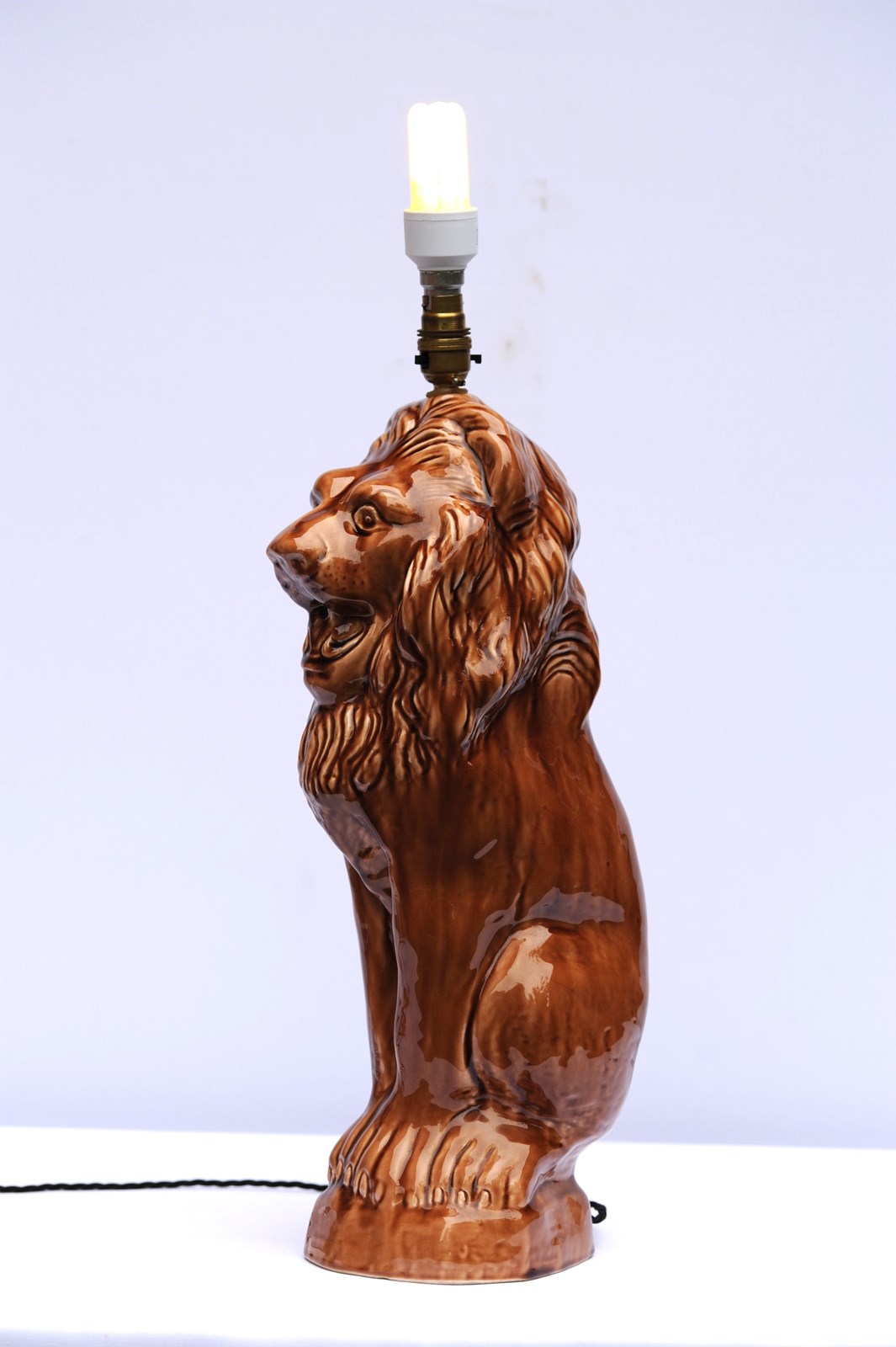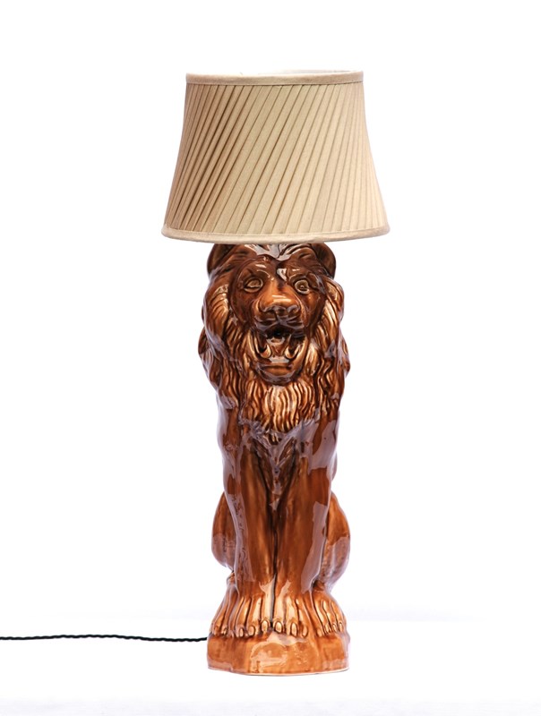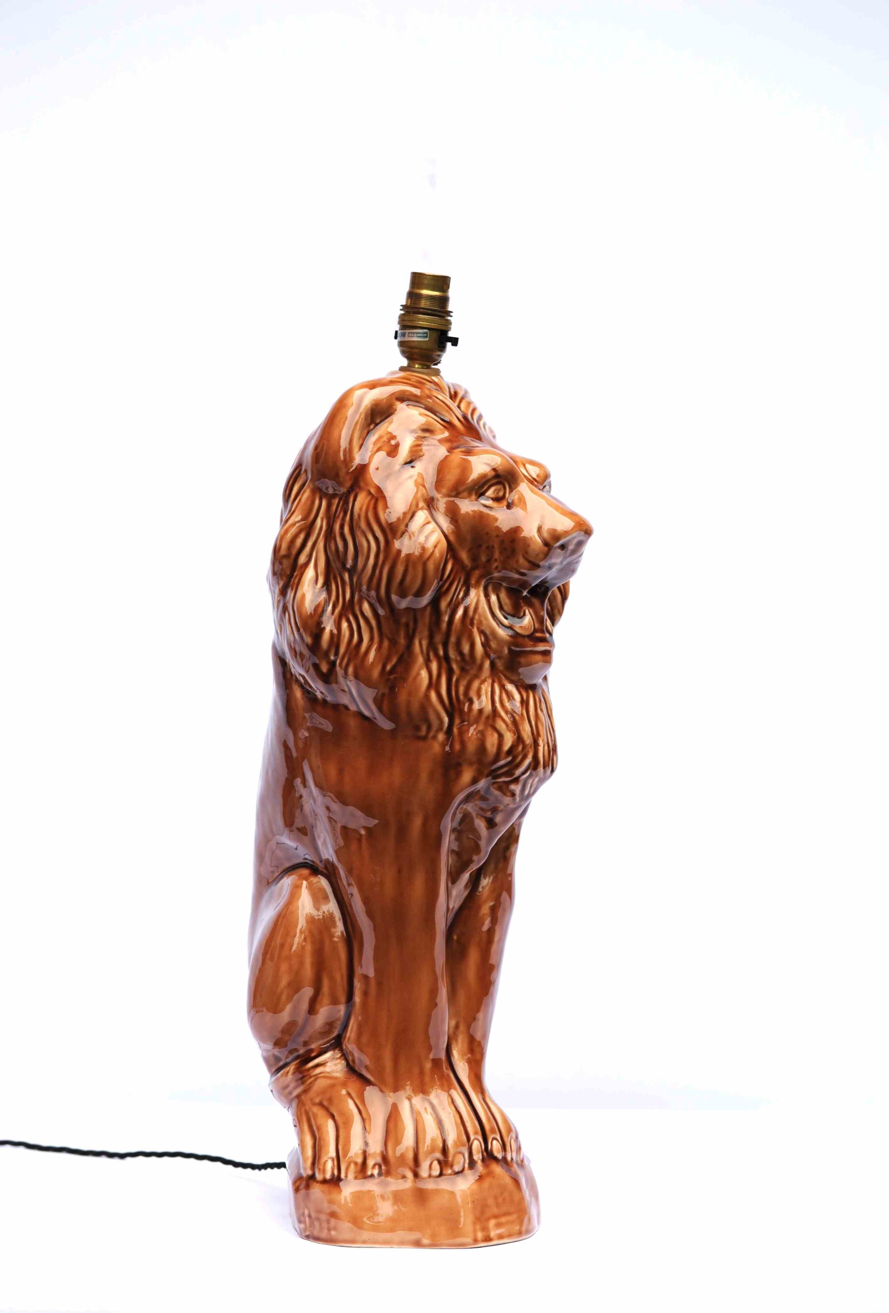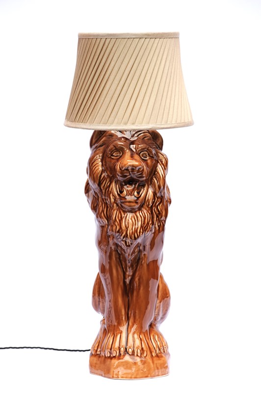 In a warm rich brown glaze, this ceramic lion floor lamp definitely has a look to it. It stands at just under two foot in height. It is a purpose made lamp, rather than a converted ornament. The lady we bought it from told us she picked it up in the 1960s on the Isle of Wight. We have just rewired it in black fabric covered flex & tested. The flex is 2.5 metres in length. Hollow form ceramic. Good condition. No shade supplied with it. Sale includes UK inland tracked delivery.
