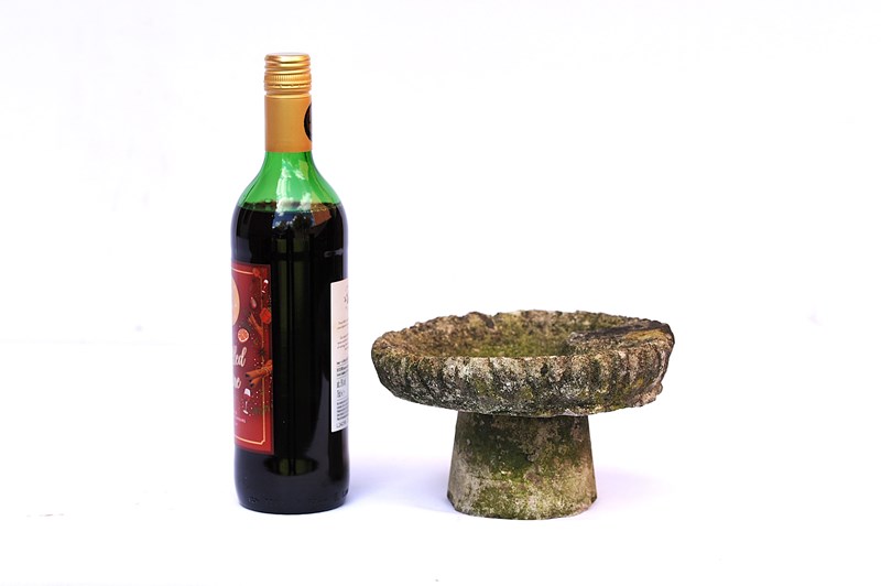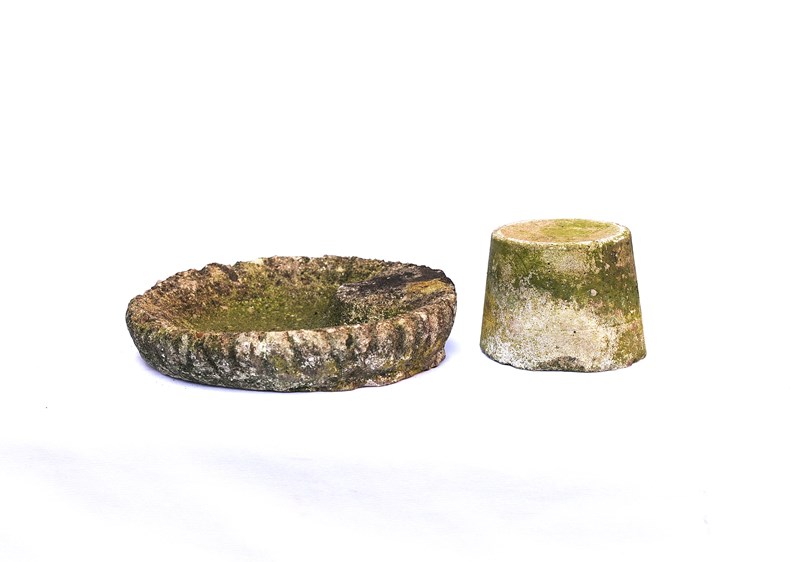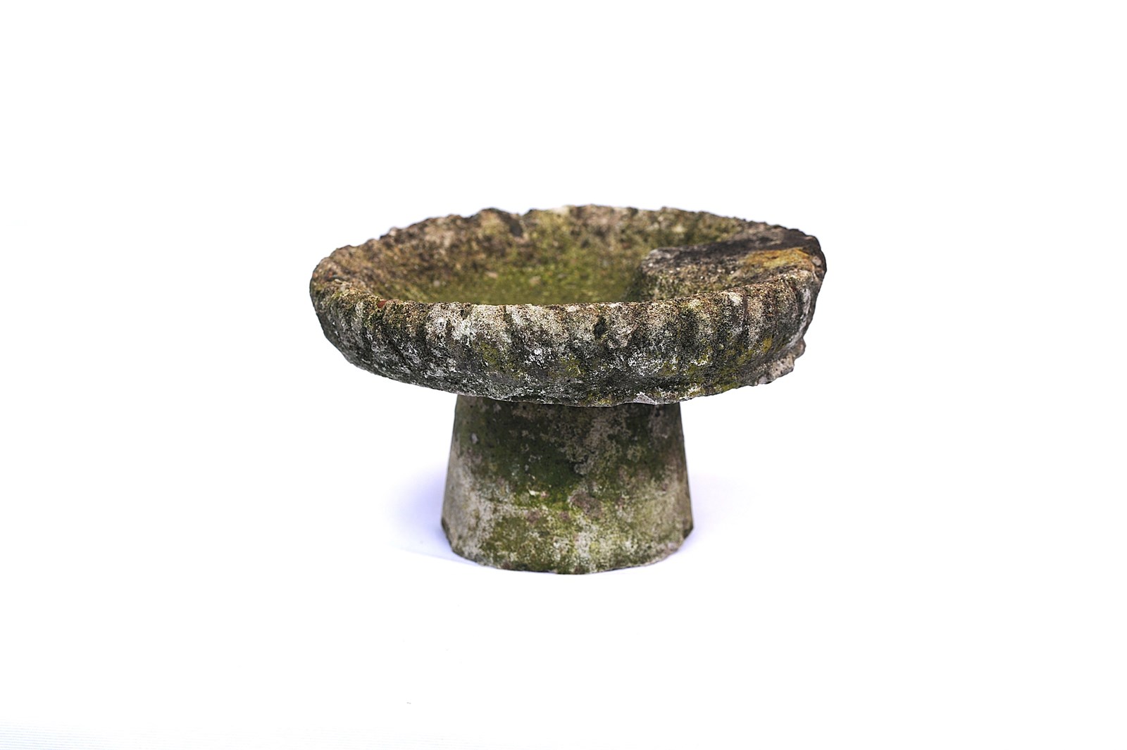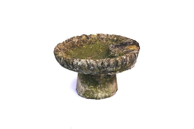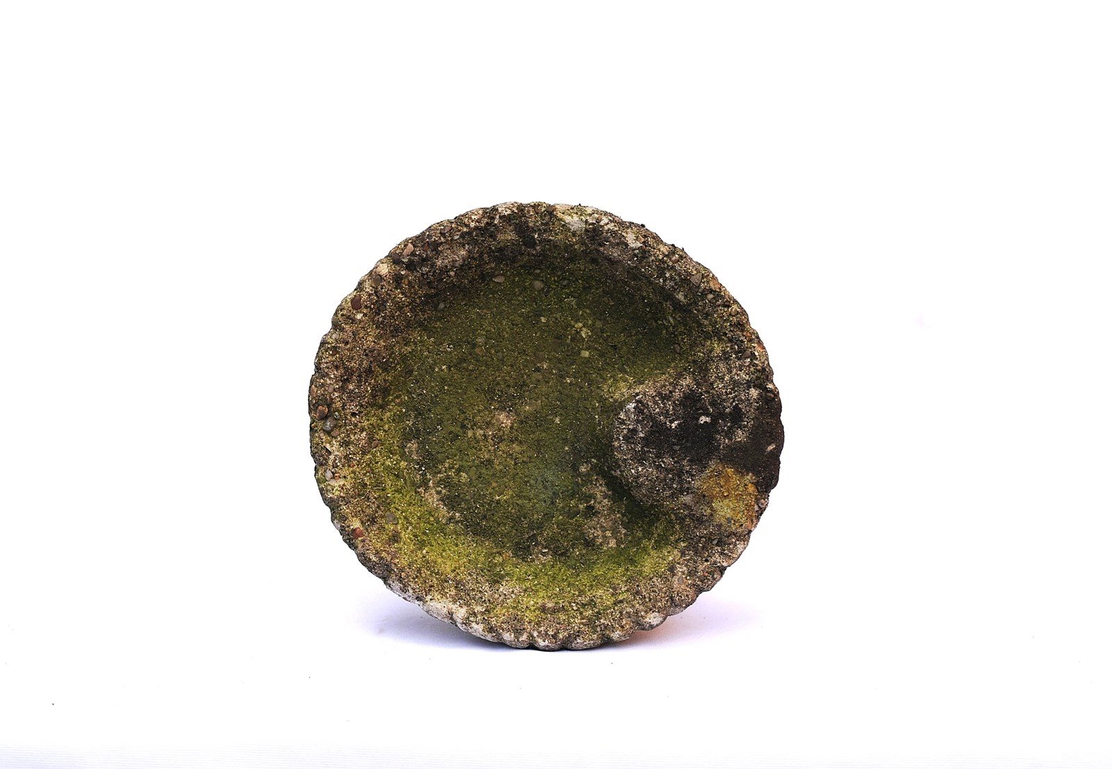 A small vintage cast stone bird bath, garden weathered. Ideal for a window sill or small balcony. Height 5 inches, 8 inches across. Weight 2.2kg. Holds around a third of a pint of water. Sale includes UK delivery.