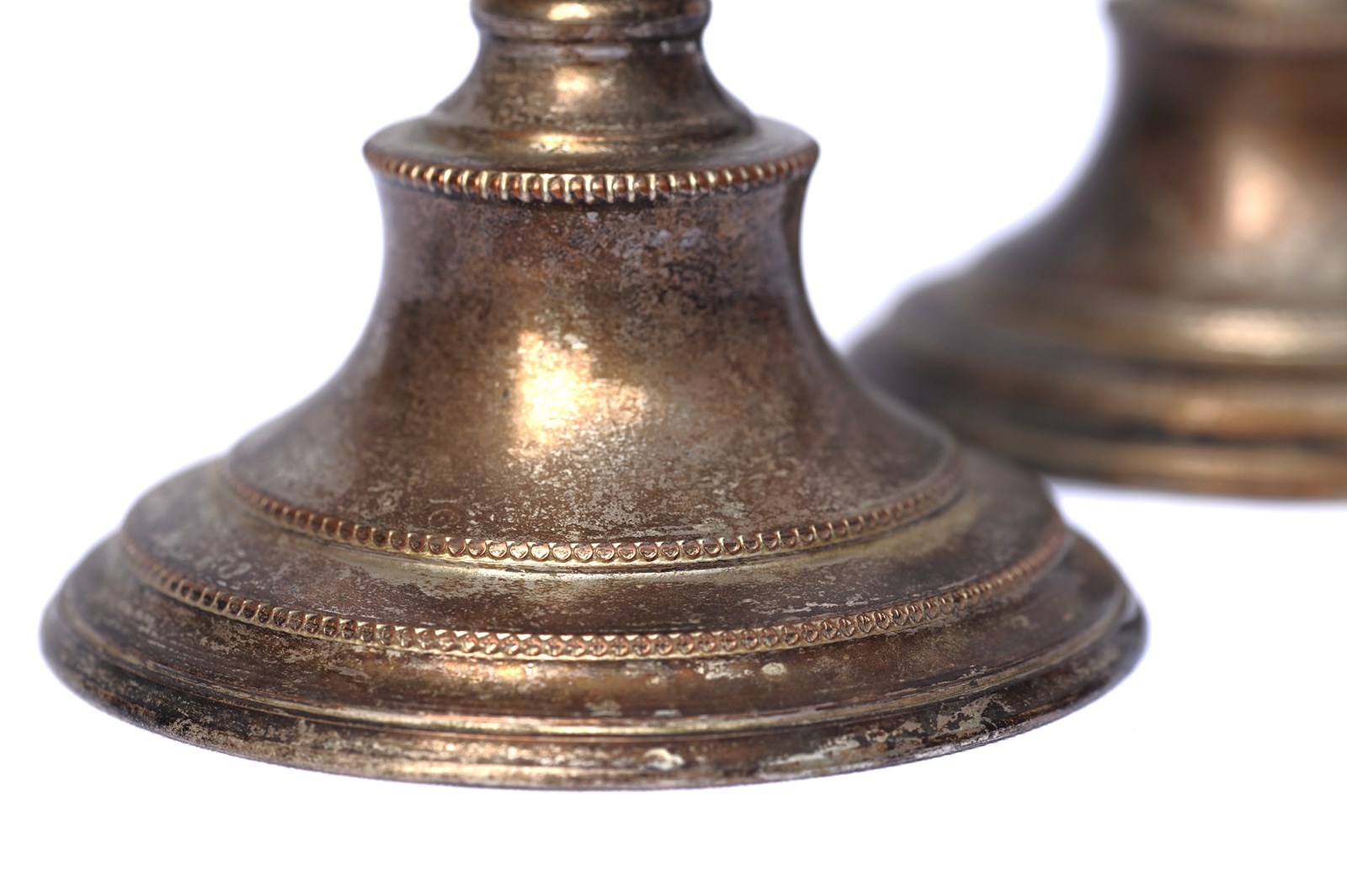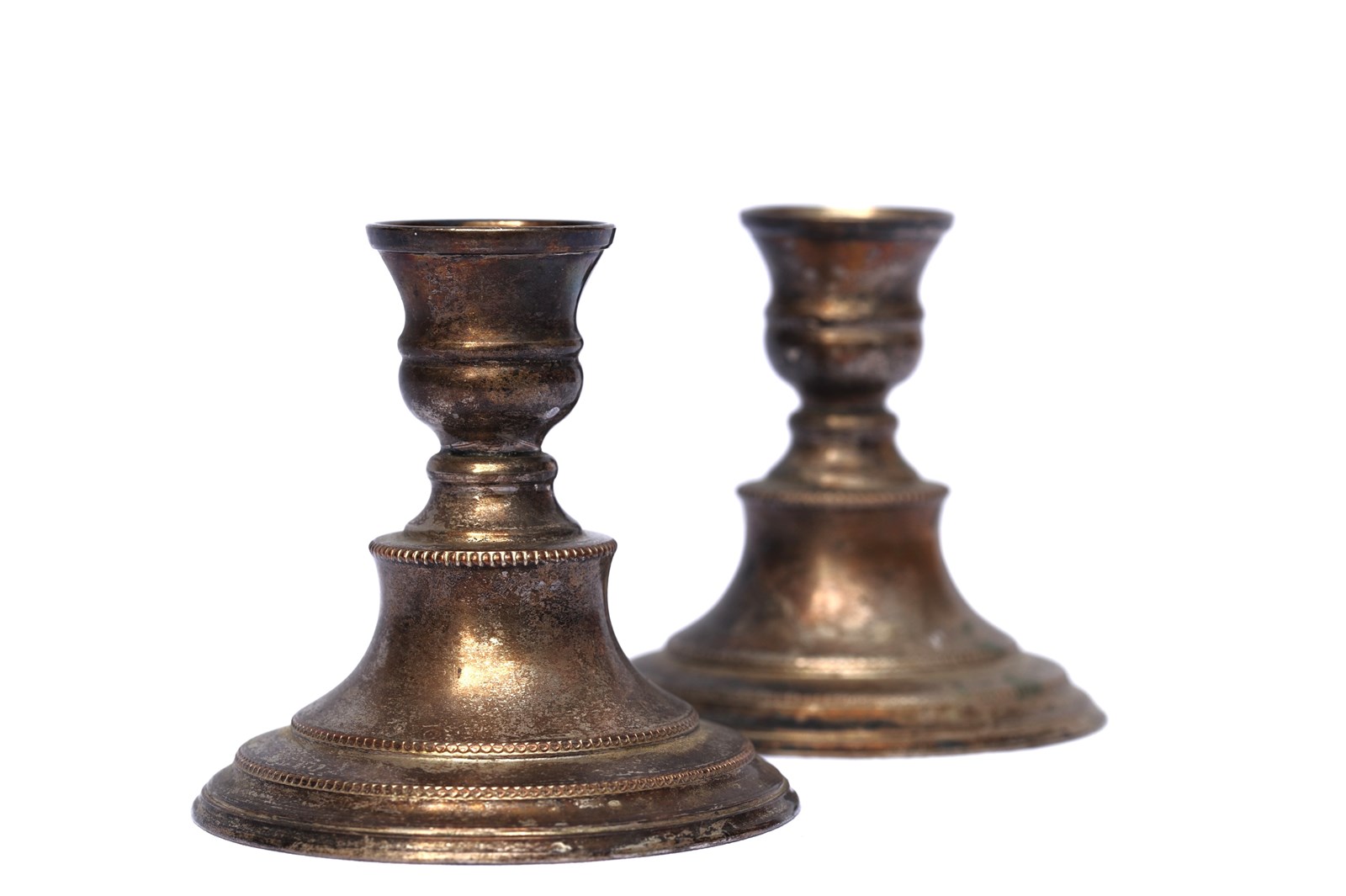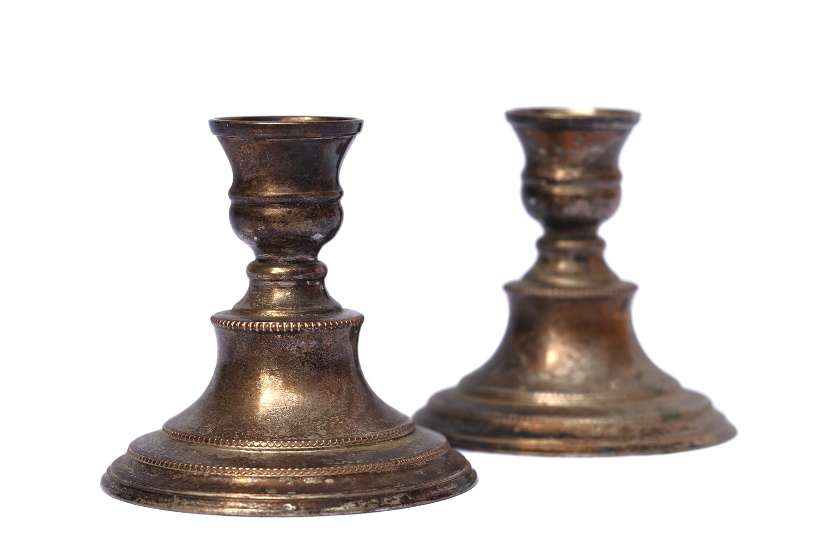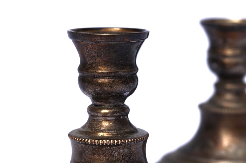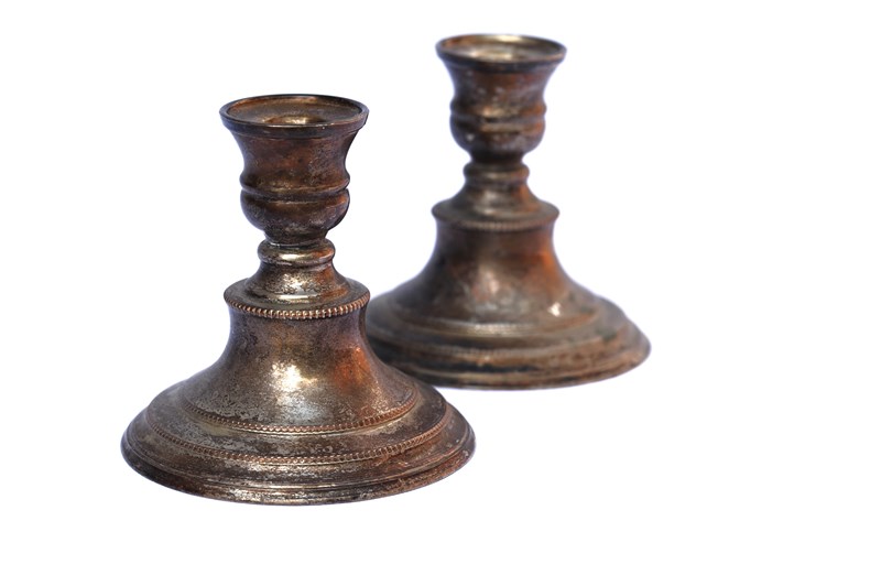 An attractive pair of low silver plate candlesticks in old untouched condition with a lovely time worn look. Height 4.25 inches or 11 cm. Will accept candles of 2.5 cm diameter. Sale includes UK delivery.