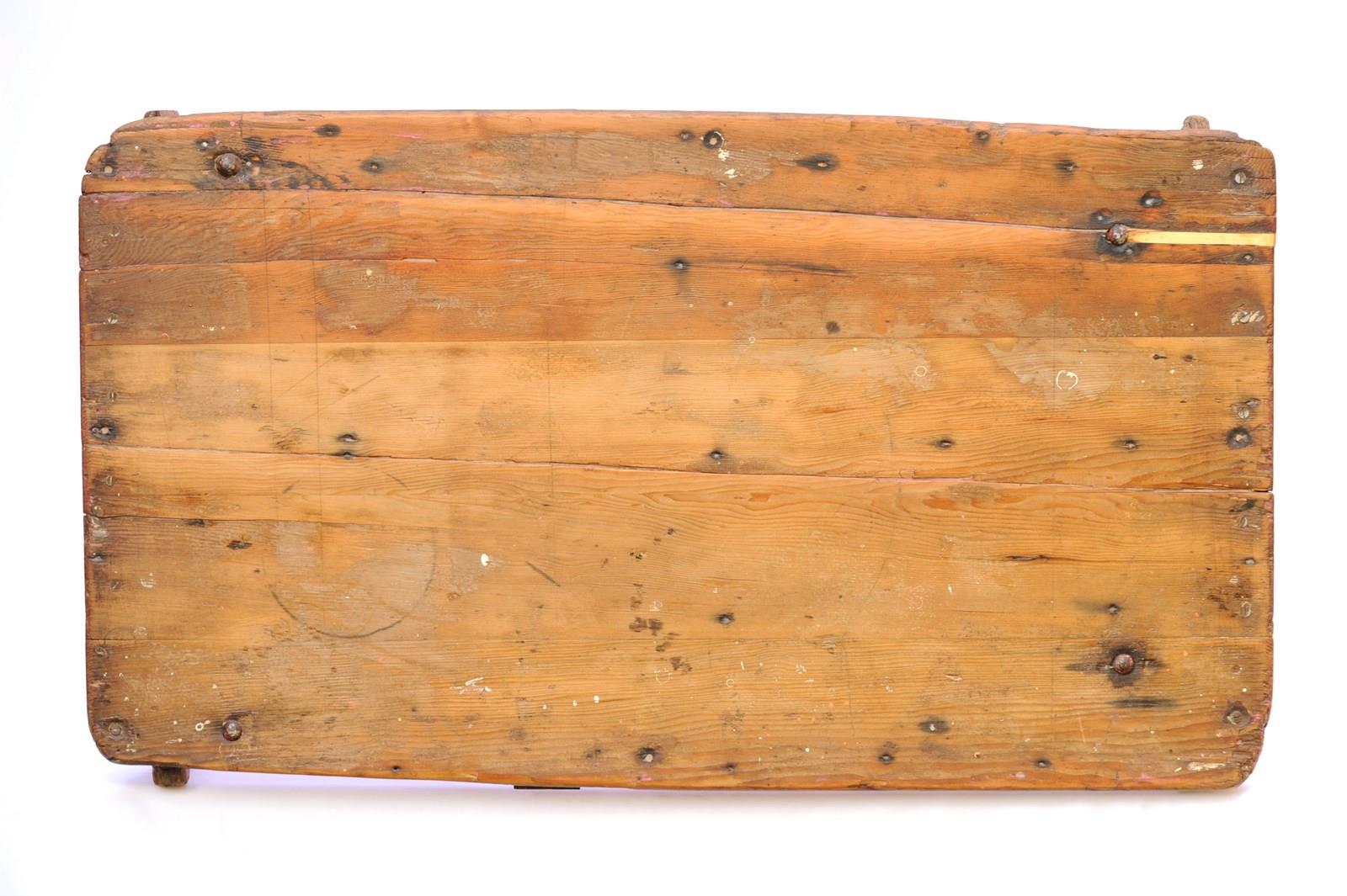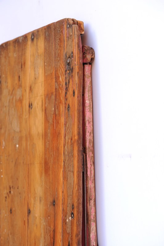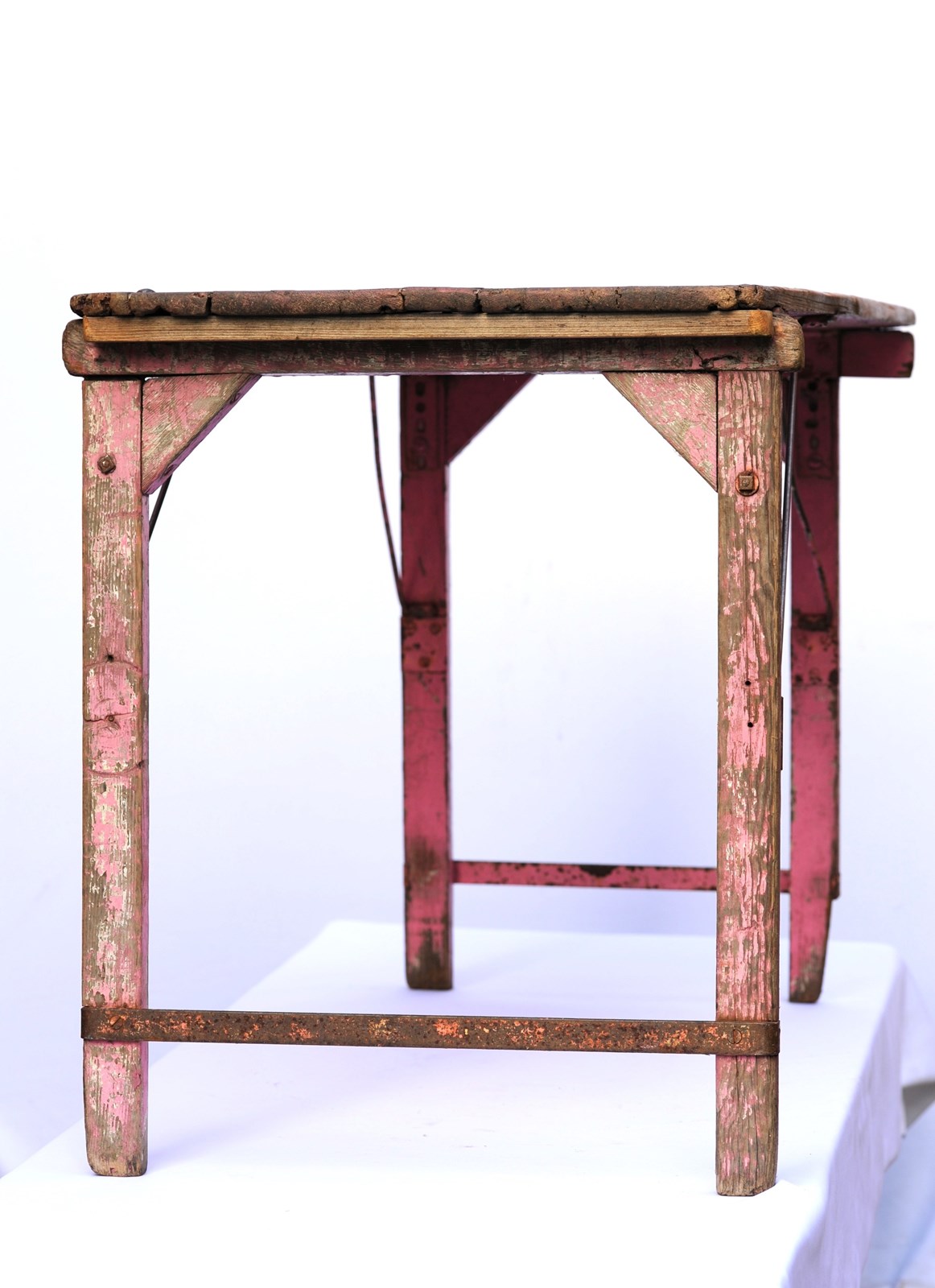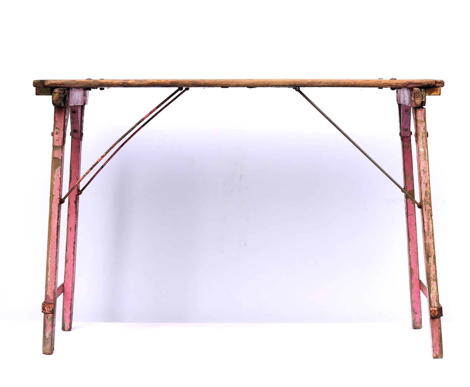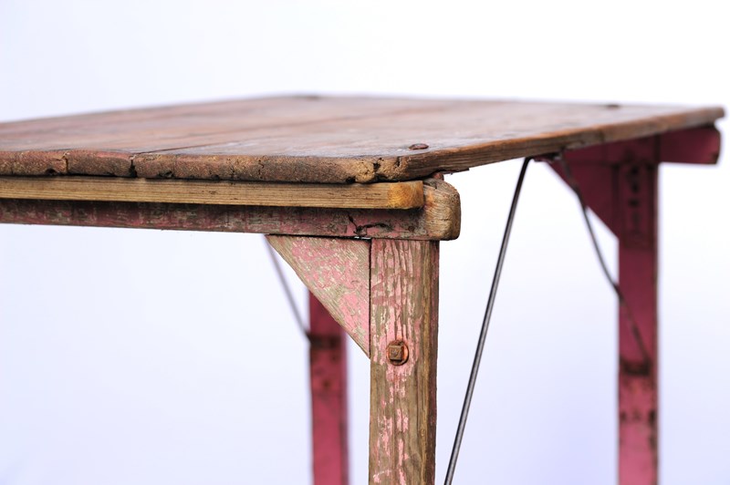 A wonderful antique pine folding trestle table of a manageable size & weight. In use height 28.5 inches, the top being 42 inches wide x 23 inches in depth, with a weight of around 12 kg. The top is nice & clean with a smooth finish so ideal for displaying items on. There are old historic use marks & wear to the table top all of which add to its appeal. The strapped legs & underneath have been left in original time aged condition. The table dates to the early 1900s and as such does have some lifetime running repairs. It stands well & folds away quite flat. A lovely compact trestle table with a great look. Sale includes UK inland tracked delivery.