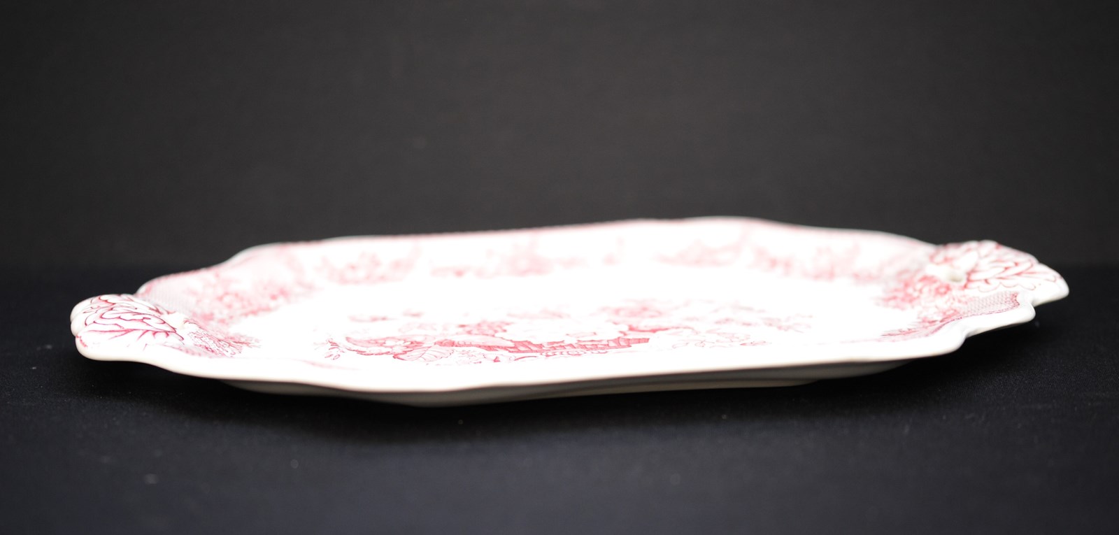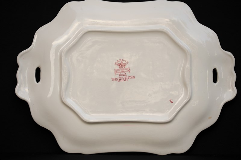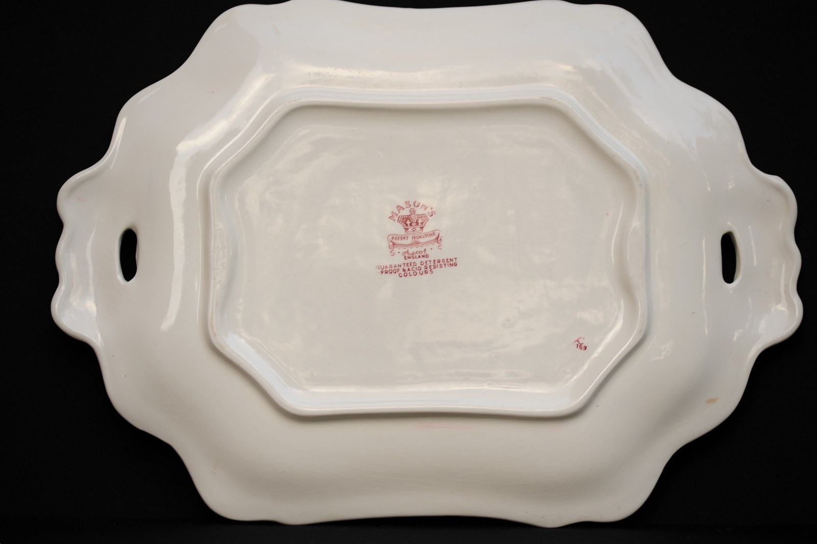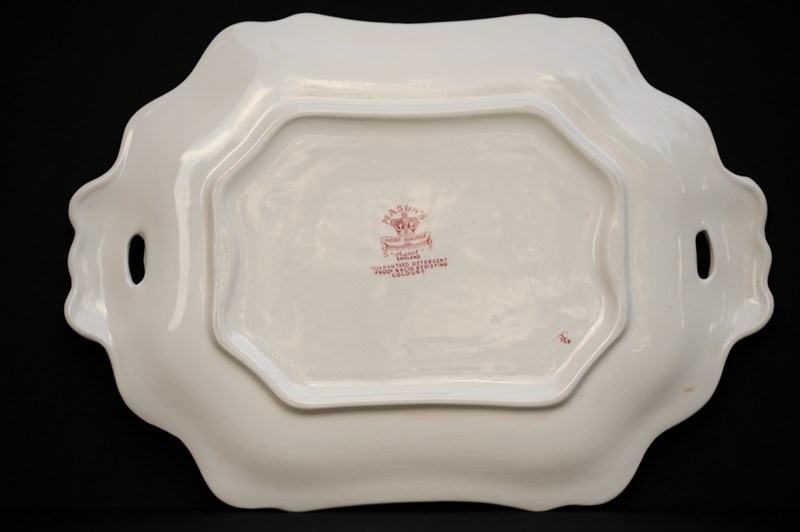 A scarce Mason's patent ironstone china Ascot Red soup tureen underplate. Depicting a red floral urn centre & floral design border. Transfer print. Dates to circa 1968-69. Measures 38 cm x 27 cm with a place height of 3 cm. Weight 1.1 kg. In excellent condition. Sale includes delivery within the United Kingdom. Worldwide delivery maybe available please enquire for a delivery quotation. Will be packed well.