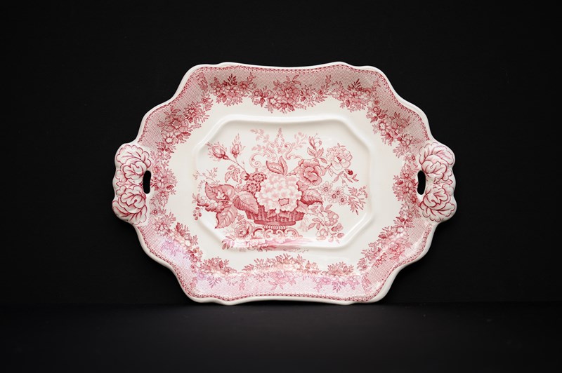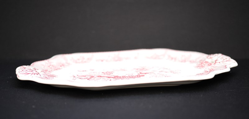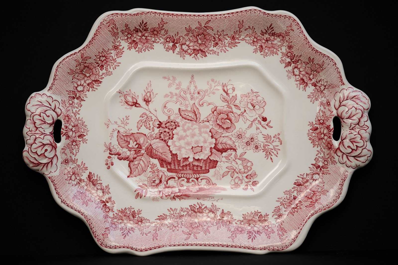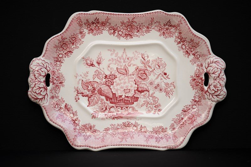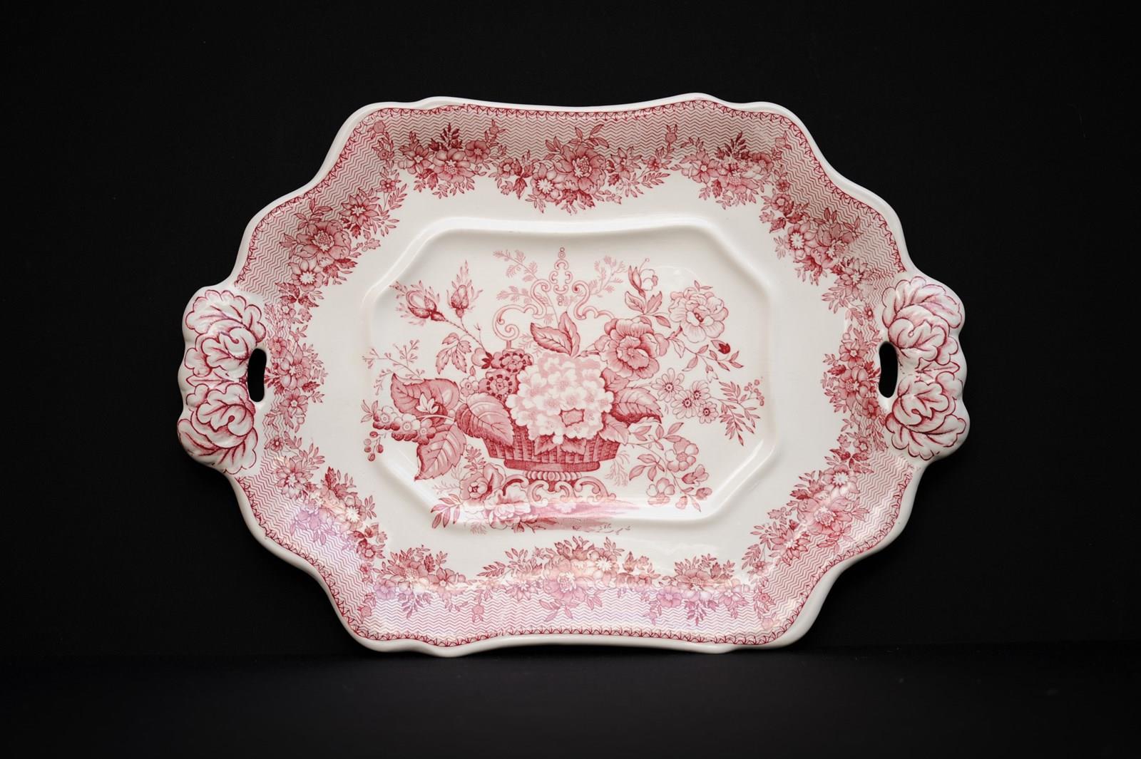 A scarce Mason's patent ironstone china Ascot Red soup tureen underplate. Depicting a red floral urn centre & floral design border. Transfer print. Dates to circa 1968-69. Measures 38 cm x 27 cm with a place height of 3 cm. Weight 1.1 kg. In excellent condition. Sale includes delivery within the United Kingdom. Worldwide delivery maybe available please enquire for a delivery quotation. Will be packed well.