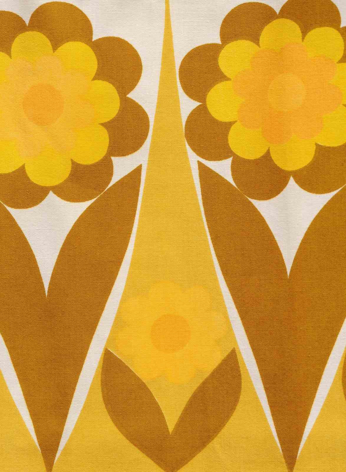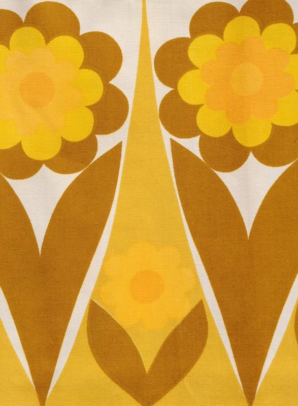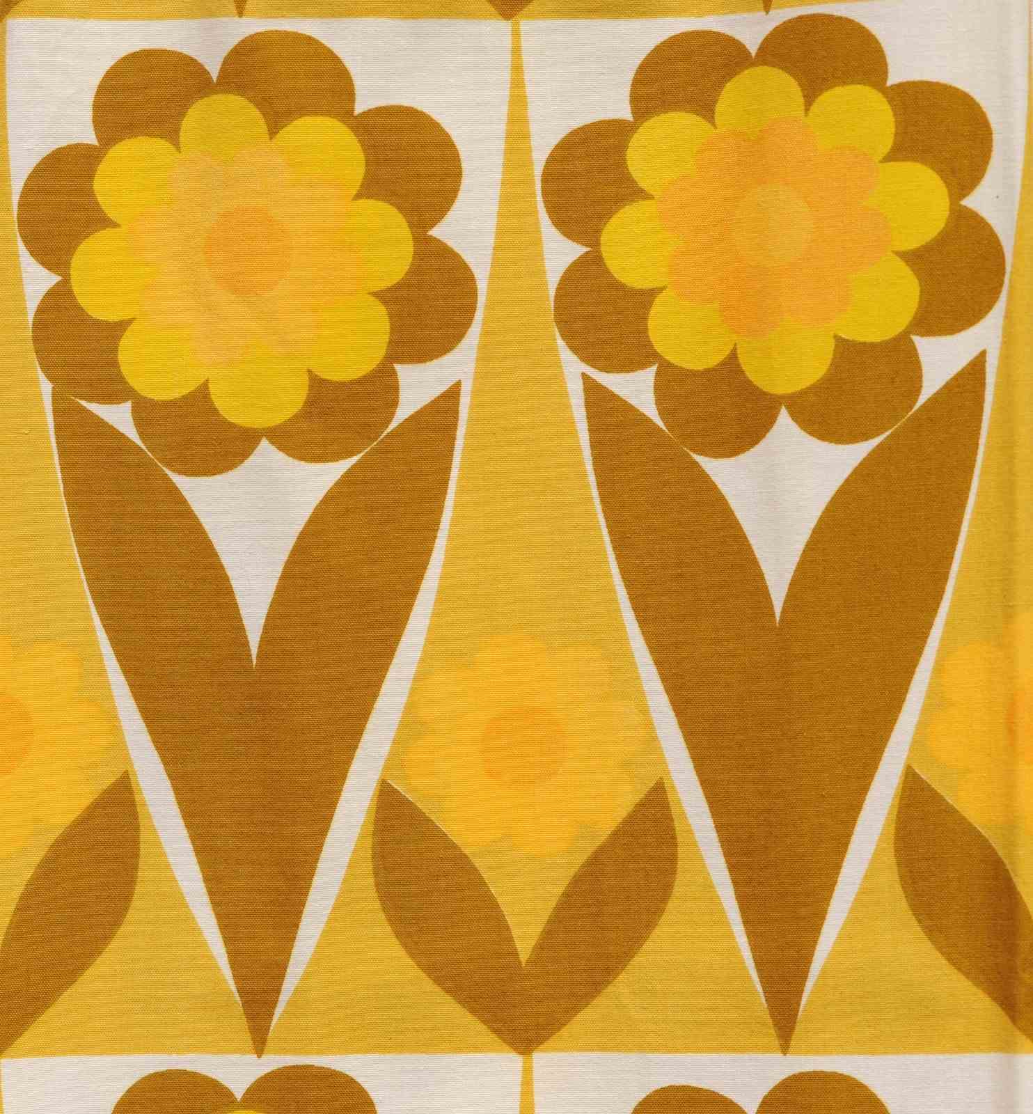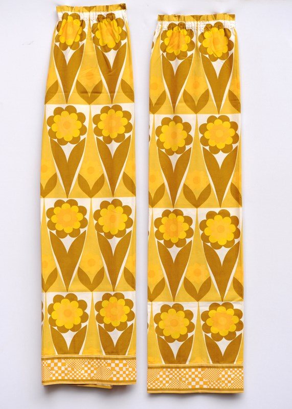 A wonderful pair of original vintage late 1960s early 1970s cotton Orange & Yellow Sunflower curtains. Approximate dimensions of each curtain, 46 inches drop, top as gathered 32 inches across, bottom as pulled straight 46 inches across. Good overall clean condition, couple of little holes, repair as pictured. Iconic period design. Of course the fabric could also be used on its own if you didn't want to use these as curtains. Priced at just £105.00 for the pair & includes free UK inland tracked delivery.