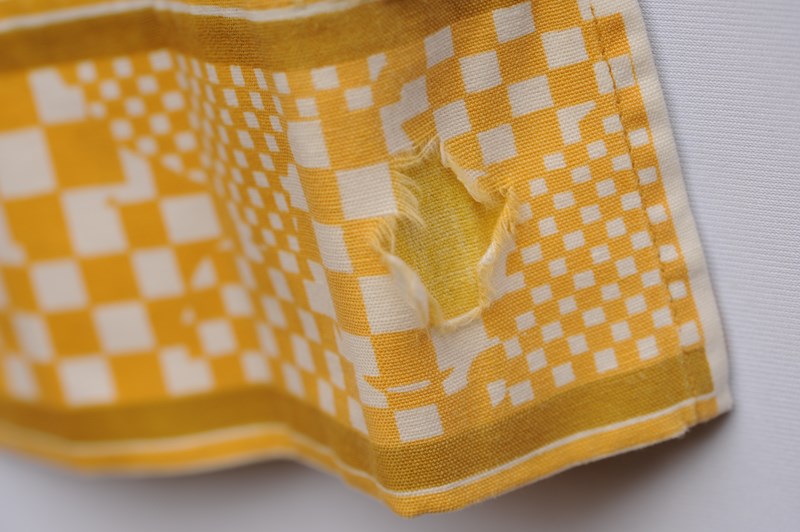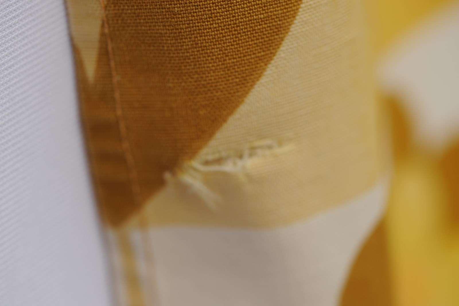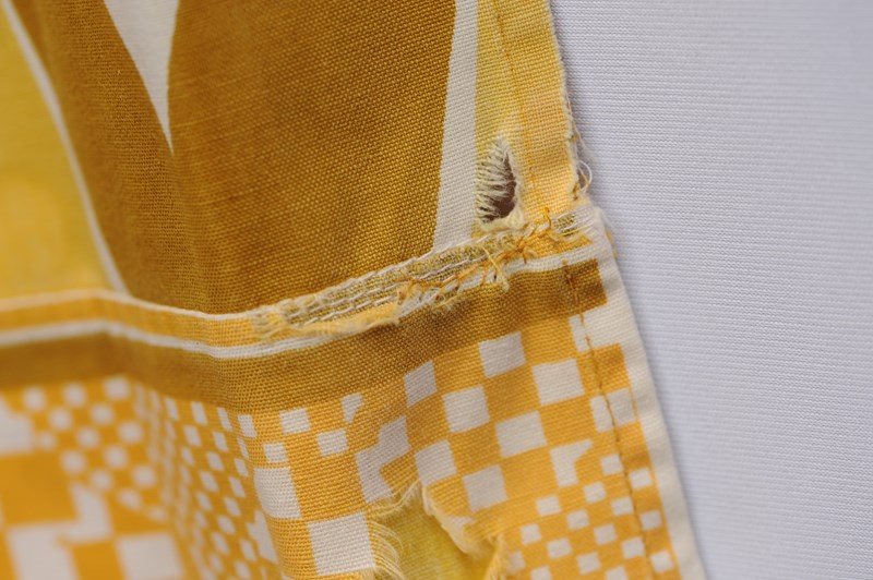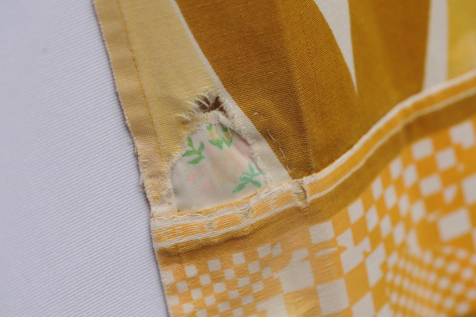 A wonderful pair of original vintage late 1960s early 1970s cotton Orange & Yellow Sunflower curtains. Approximate dimensions of each curtain, 46 inches drop, top as gathered 32 inches across, bottom as pulled straight 46 inches across. Good overall clean condition, couple of little holes, repair as pictured. Iconic period design. Of course the fabric could also be used on its own if you didn't want to use these as curtains. Priced at just £105.00 for the pair & includes free UK inland tracked delivery.