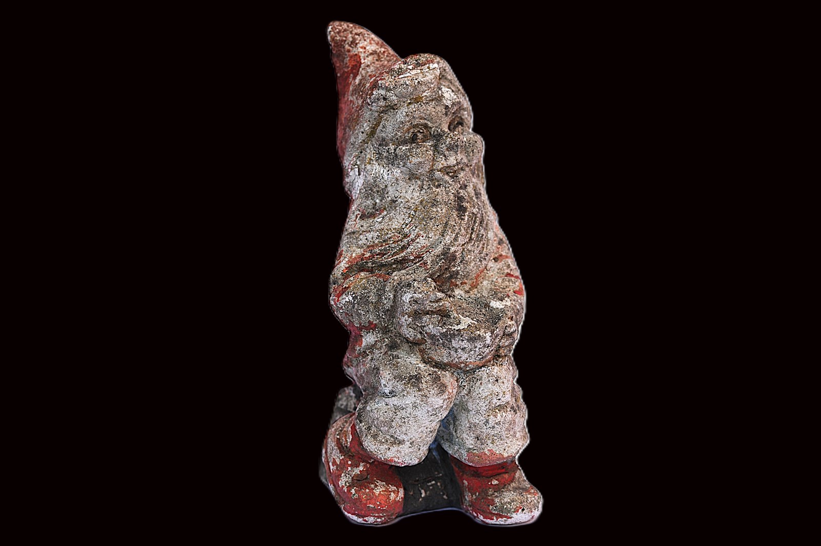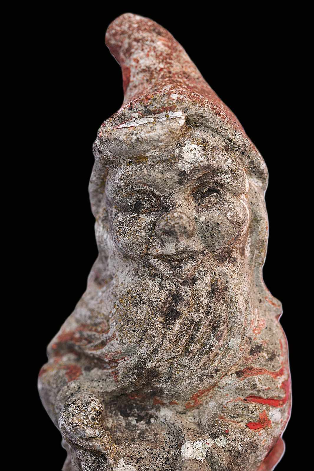 A miniature cast stone garden gnome. So cute! He's just 7 inches in height & just under a kilo in weight. Original weather beaten condition, mid century.