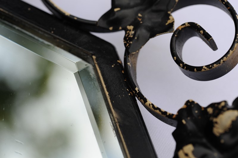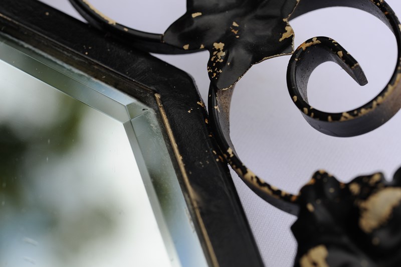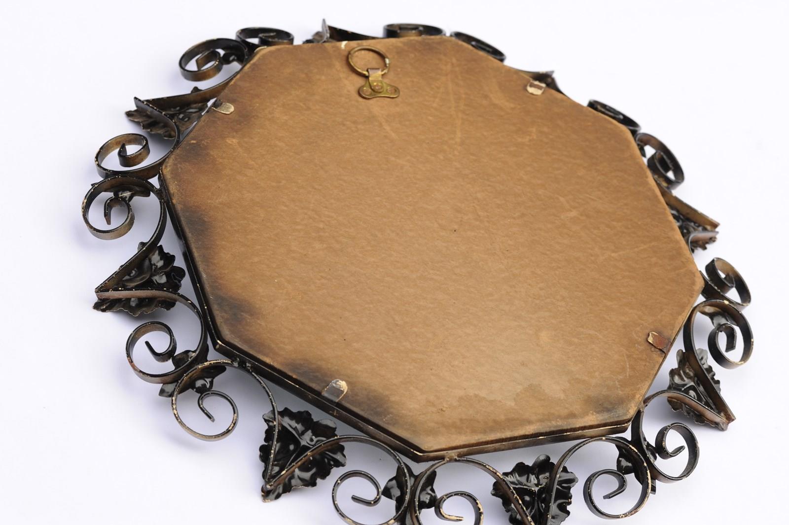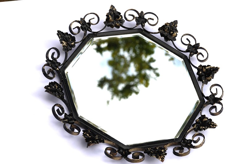 A vintage mid century metal ivy frame octagonal bevelled edge wall mirror. Vintage painted & nicely time worn. Diameter 19 inches. Original & good overall condition. Free UK inland tracked delivery.
