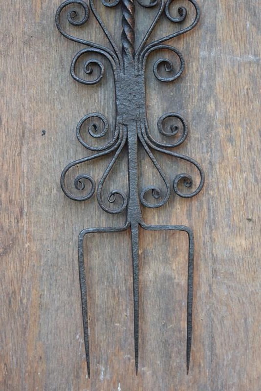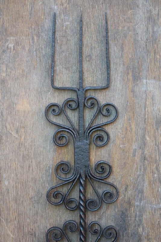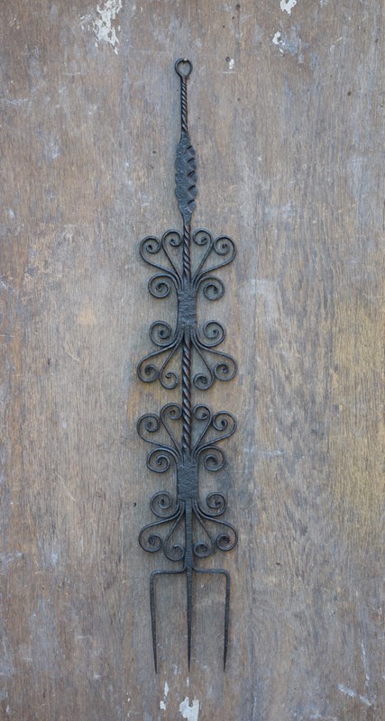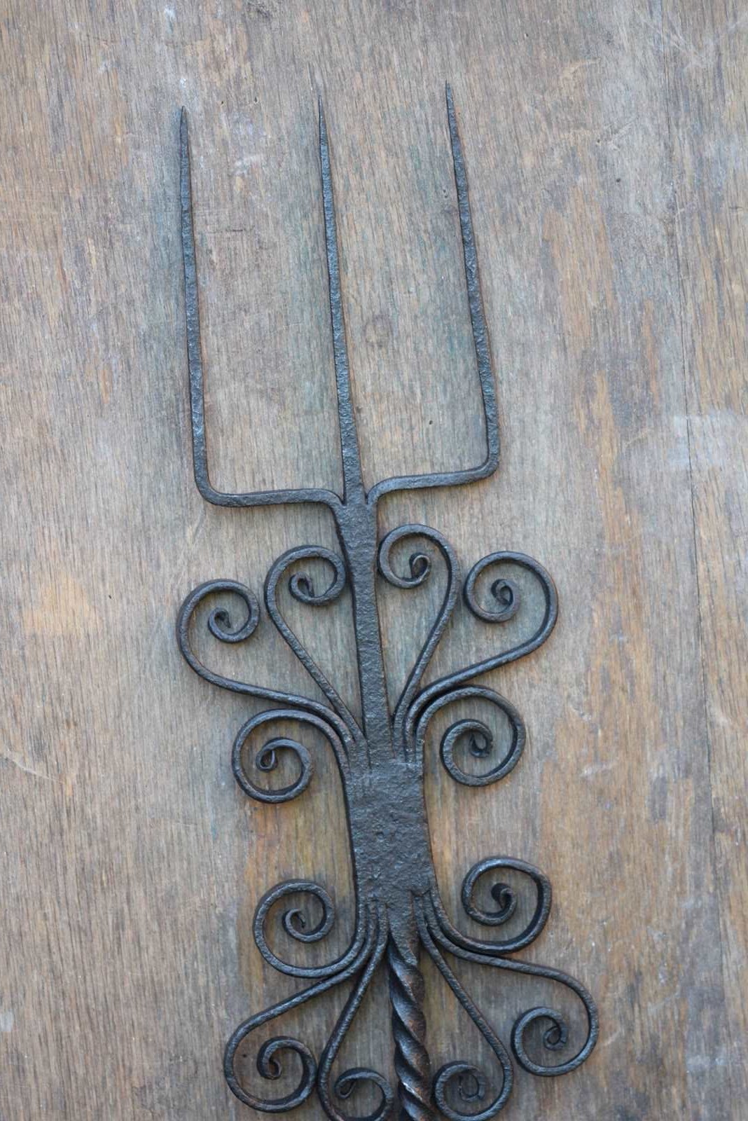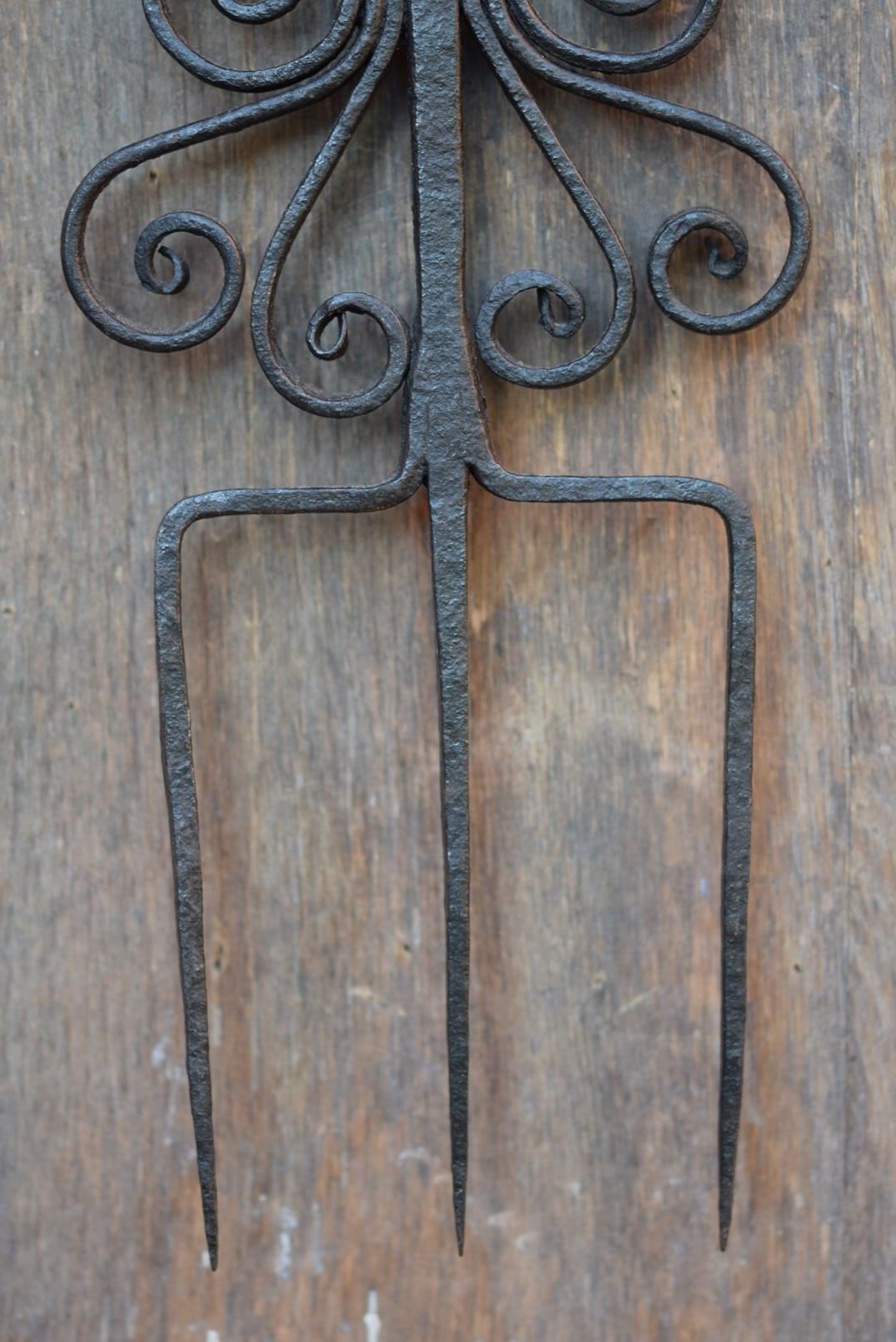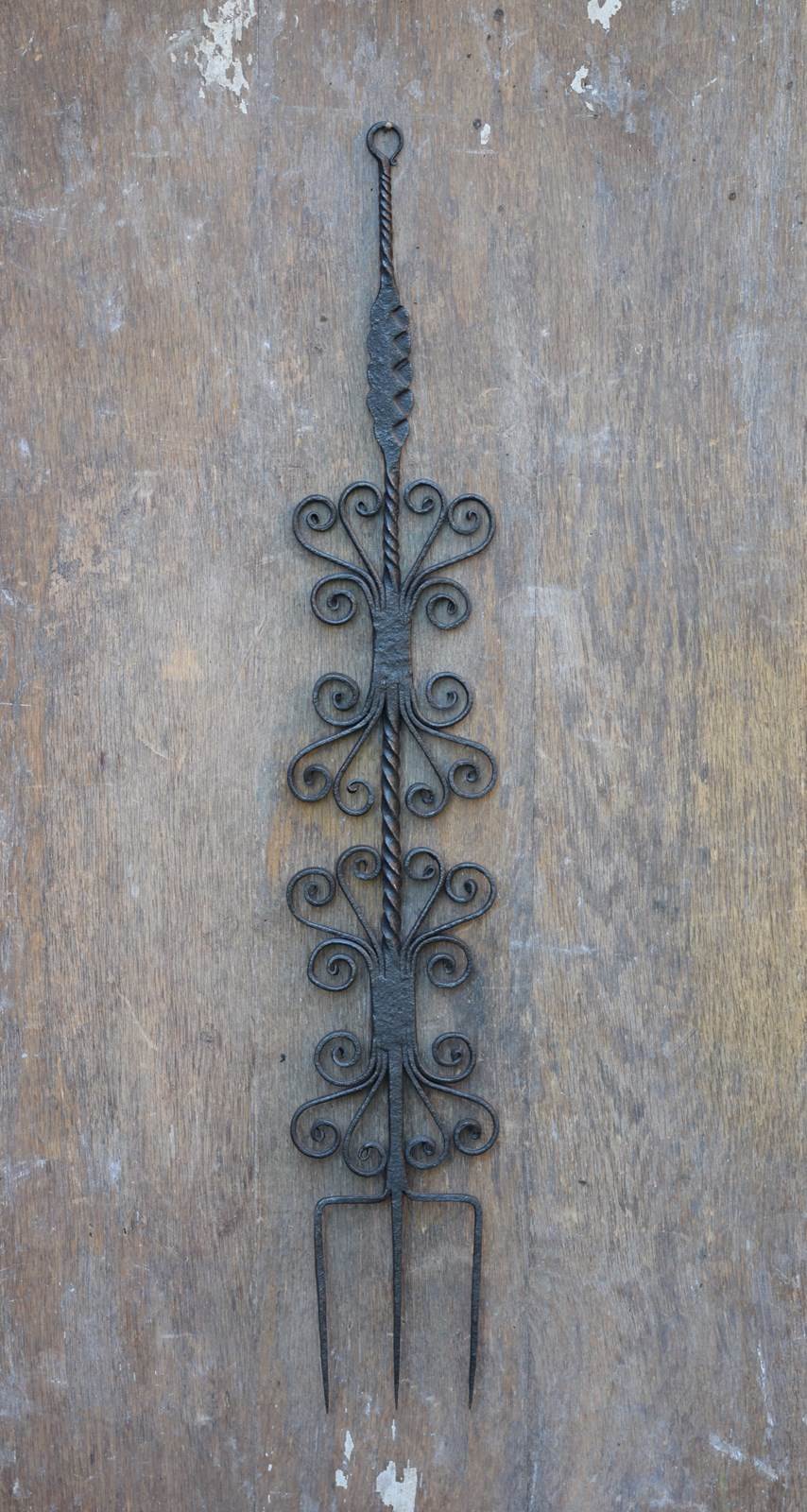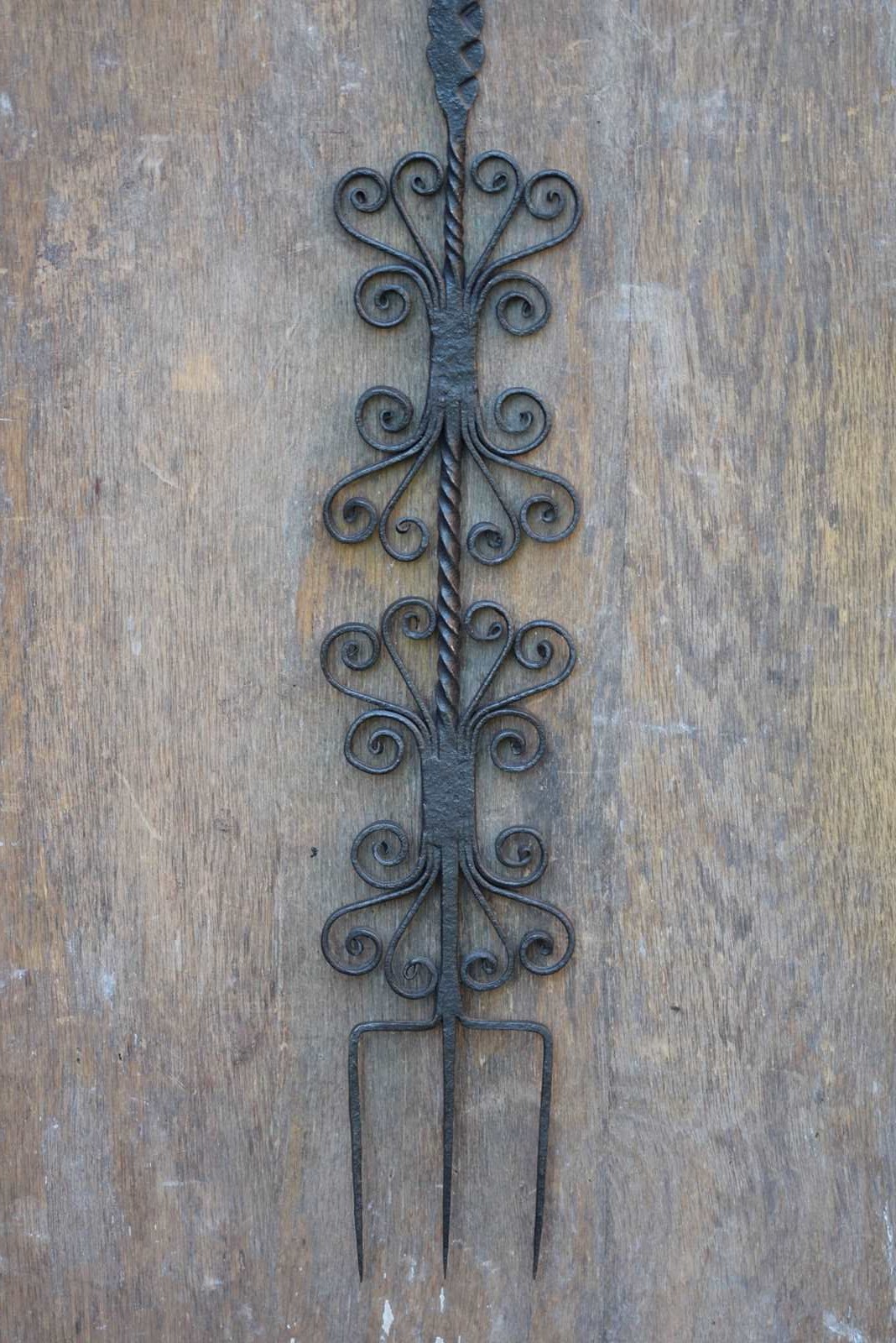 Skilfully hand forged early 19th century highly ornate wrought iron toasting fork or flesh fork. Spanish or Basque region in origin. Length 26.5 inches & just under a one kilo in weight. Twisted handle tip with a top hoop hanging eye leading to a widened petal detailed hand grip above two beautiful tiers of highly decorative scroll work ending in a three prong fork being 3.5 inches in width with the tines 4.5 inches in length. In very good condition with its original surface.