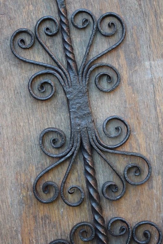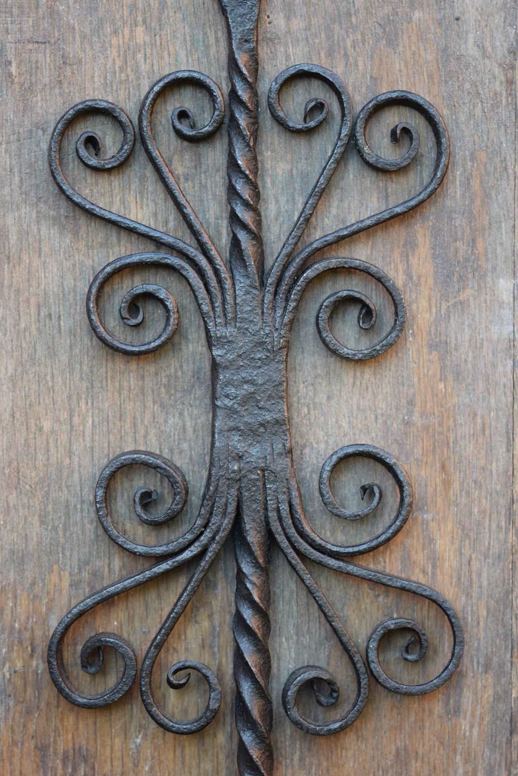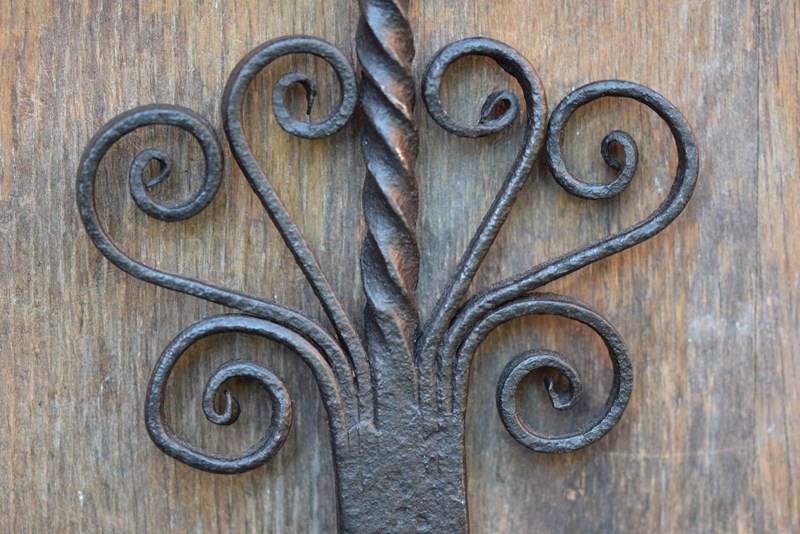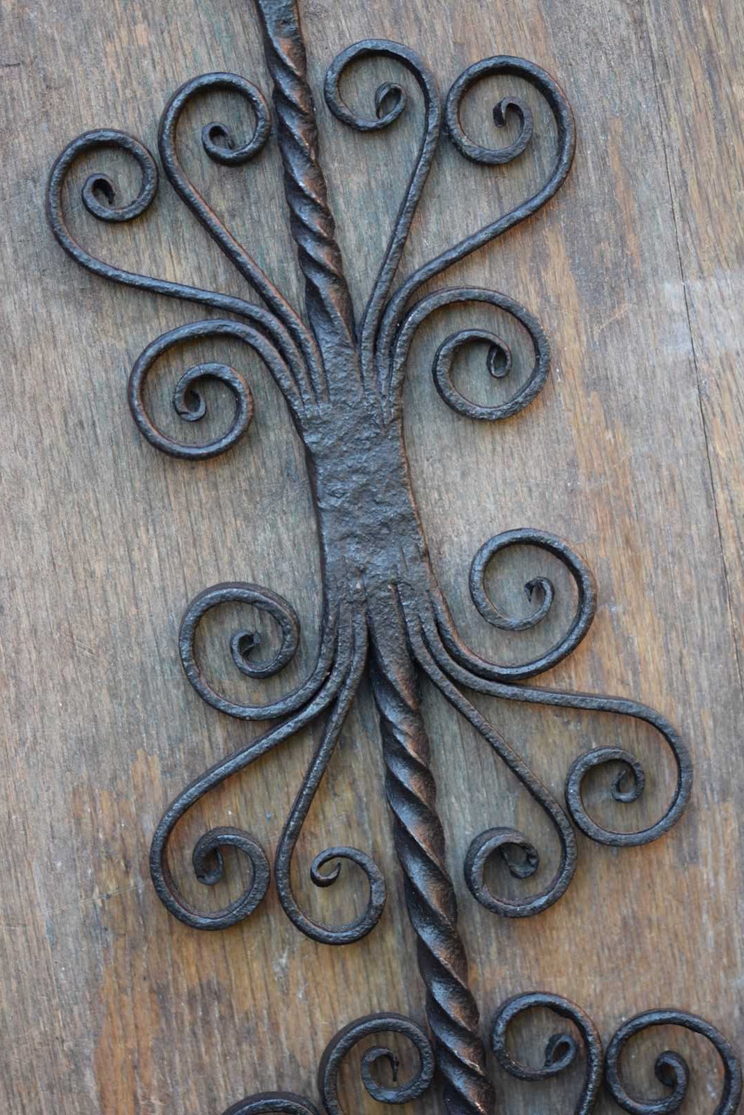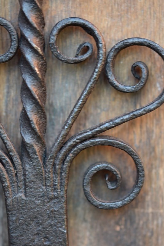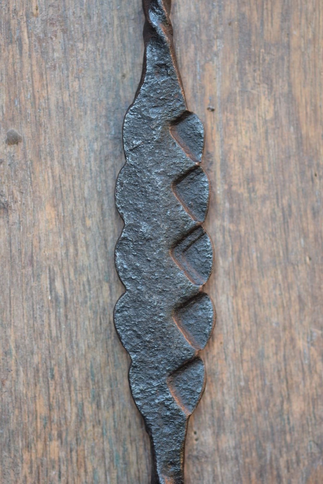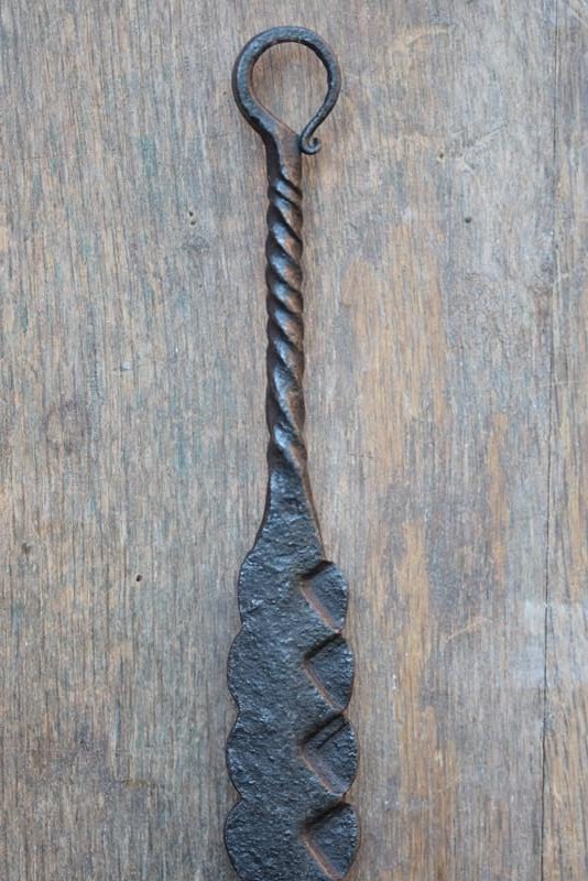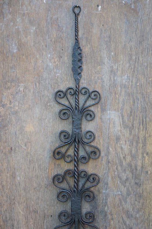 Skilfully hand forged early 19th century highly ornate wrought iron toasting fork or flesh fork. Spanish or Basque region in origin. Length 26.5 inches & just under a one kilo in weight. Twisted handle tip with a top hoop hanging eye leading to a widened petal detailed hand grip above two beautiful tiers of highly decorative scroll work ending in a three prong fork being 3.5 inches in width with the tines 4.5 inches in length. In very good condition with its original surface.