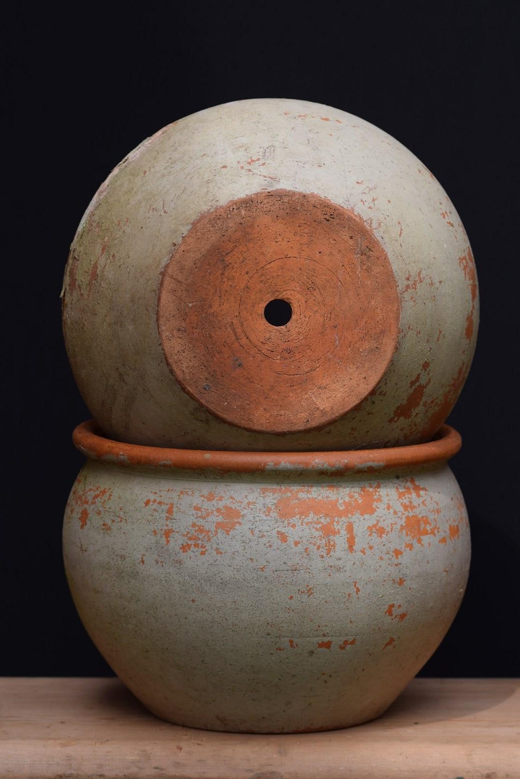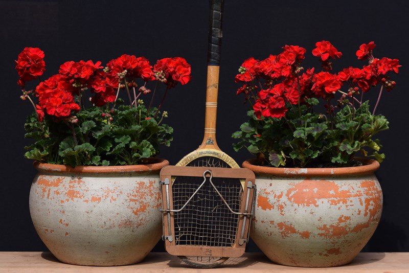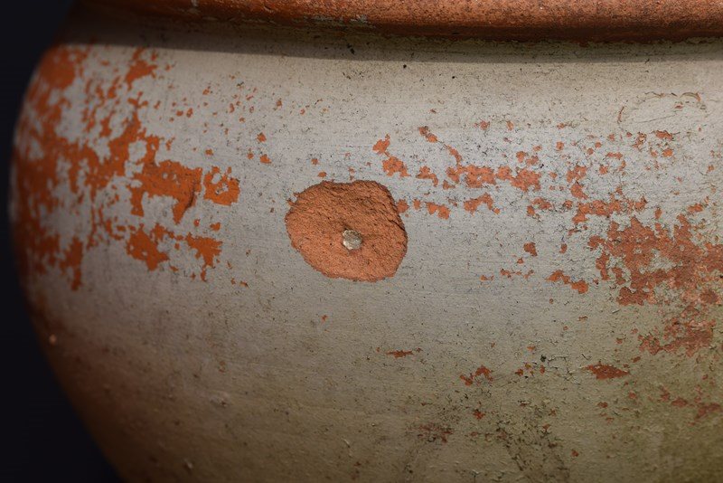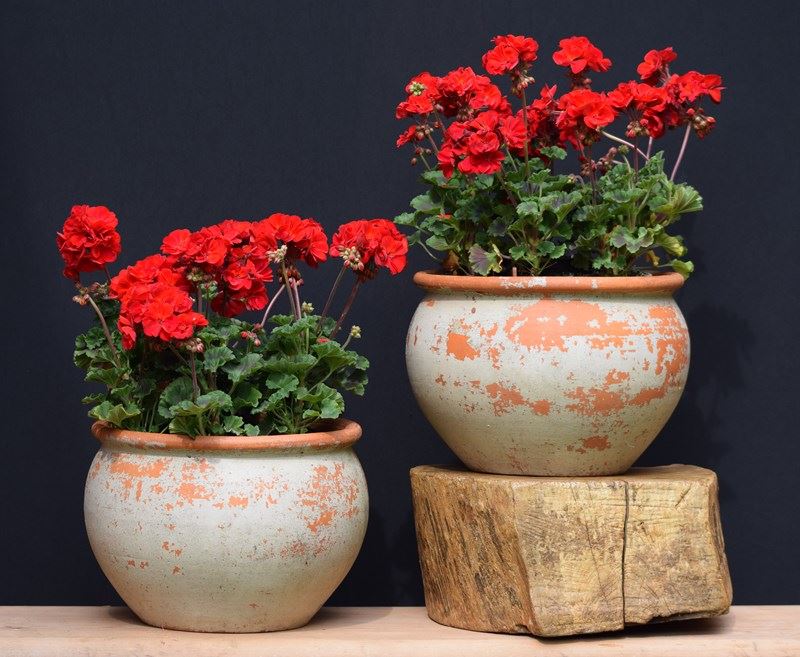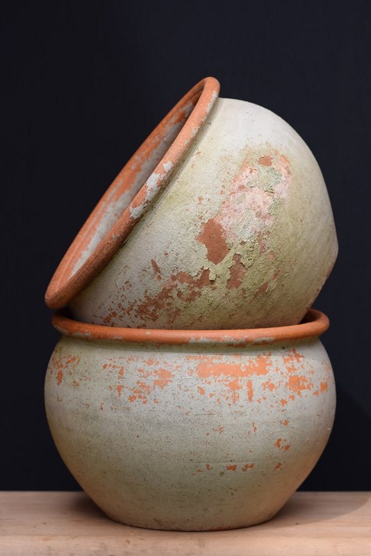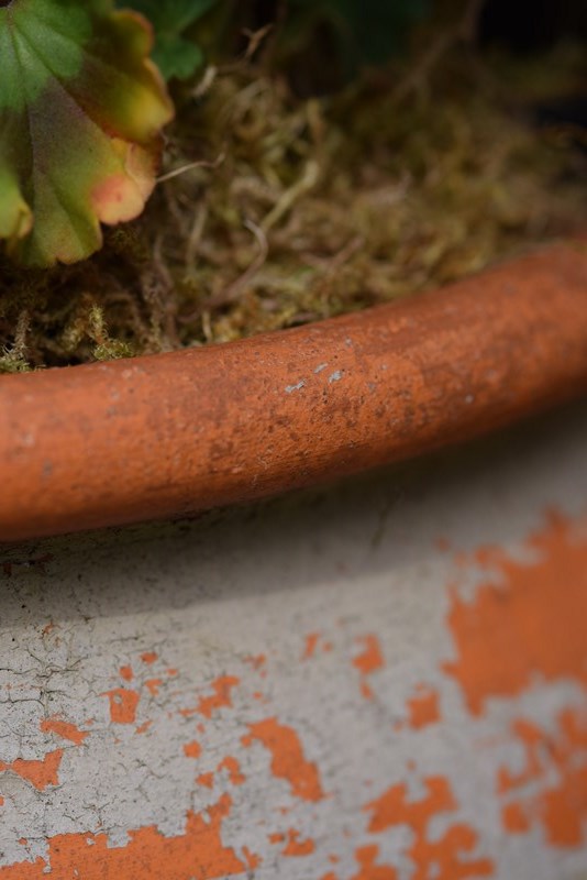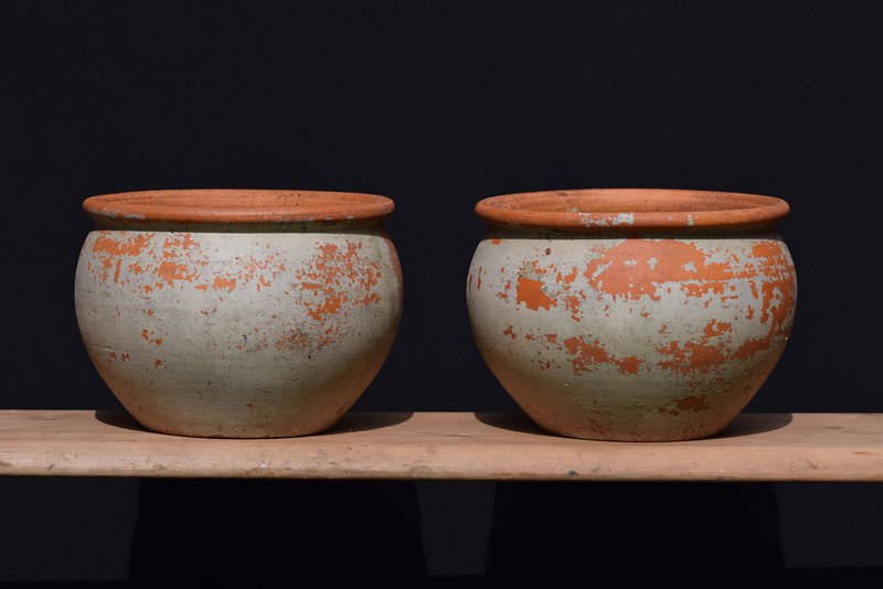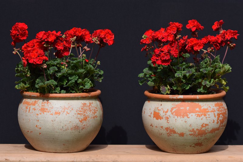 A pair of beautiful old hand thrown terracotta planters which have in their past been hand painted and are now stunningly garden time worn & weathered. We think they look lovely when planted up. Ideal for Scented Pelargoniums etc. Any questions please do not hesitate to ask.