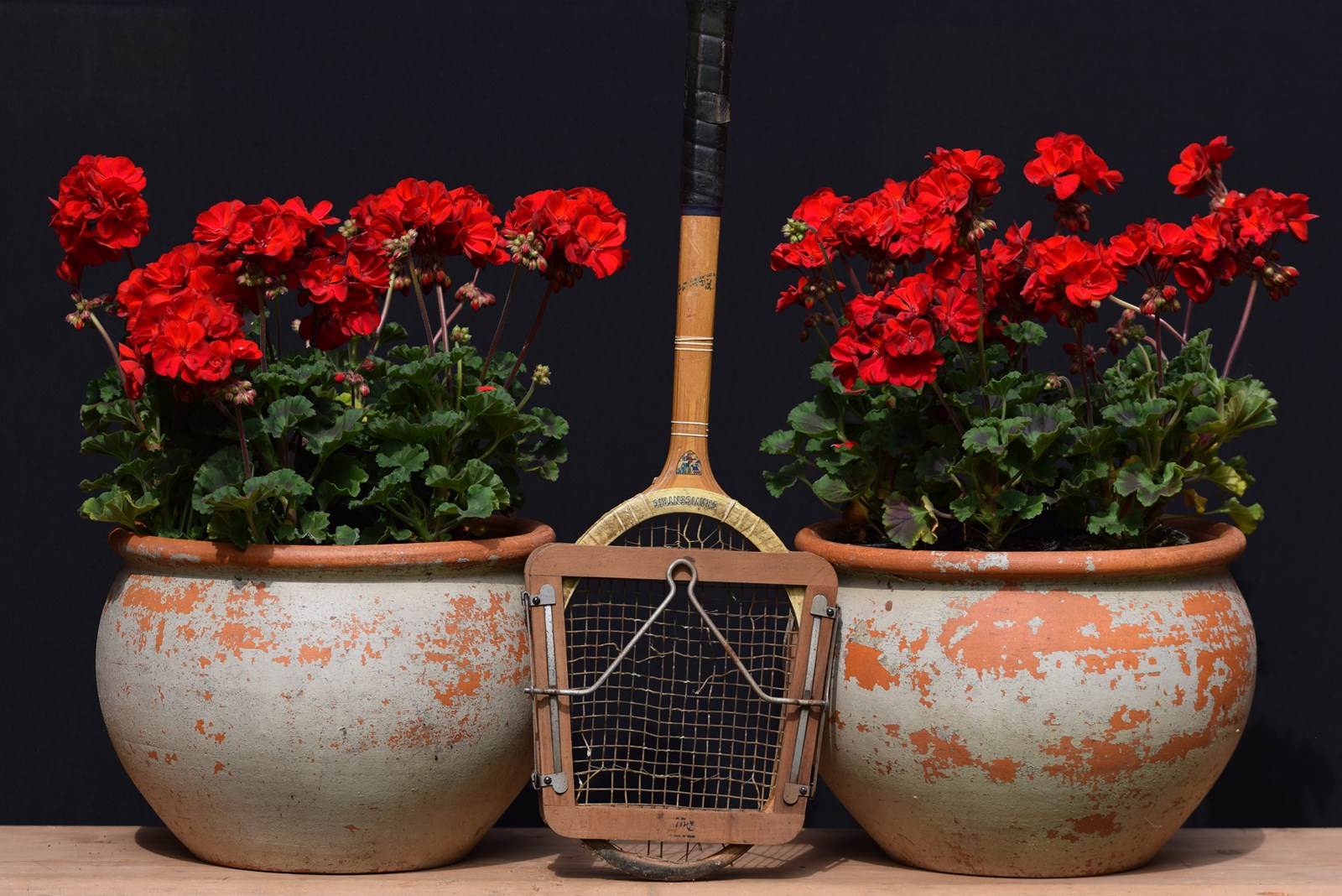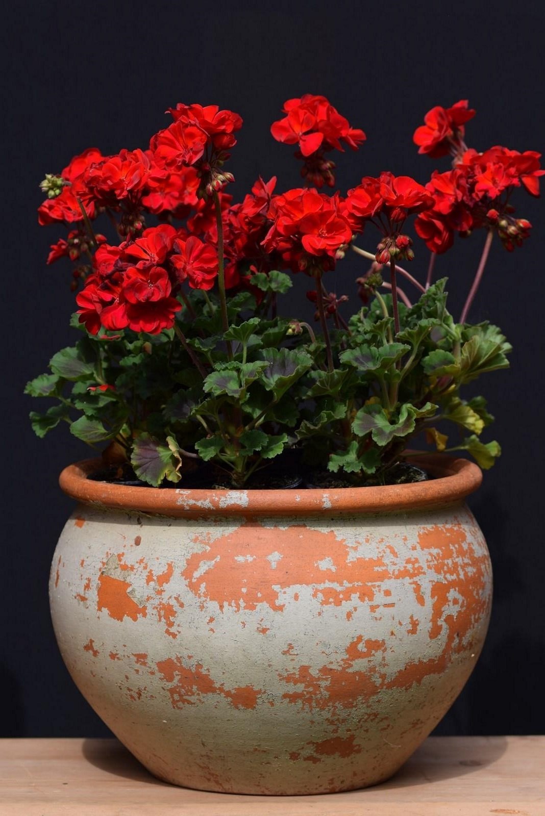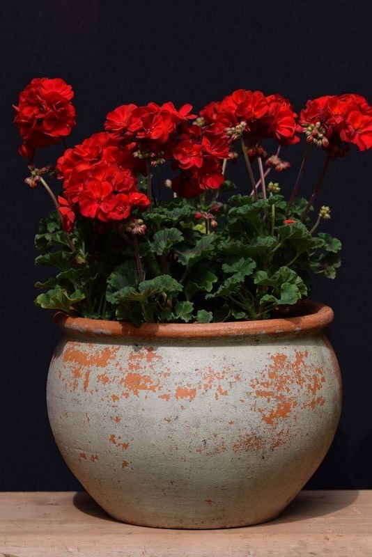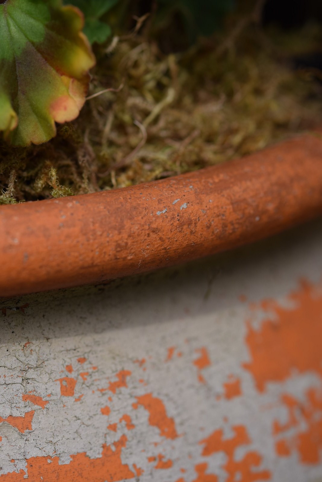 A pair of beautiful old hand thrown terracotta planters which have in their past been hand painted and are now stunningly garden time worn & weathered. We think they look lovely when planted up. Ideal for Scented Pelargoniums etc. Any questions please do not hesitate to ask.