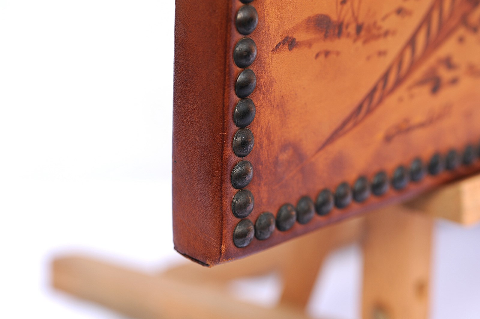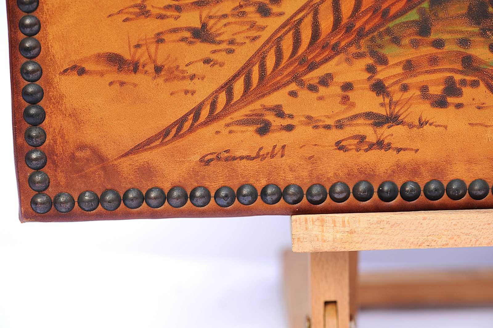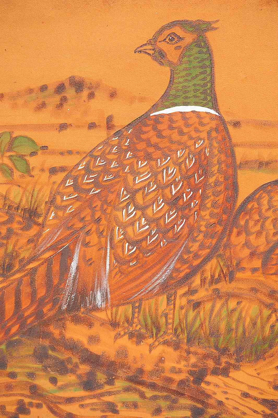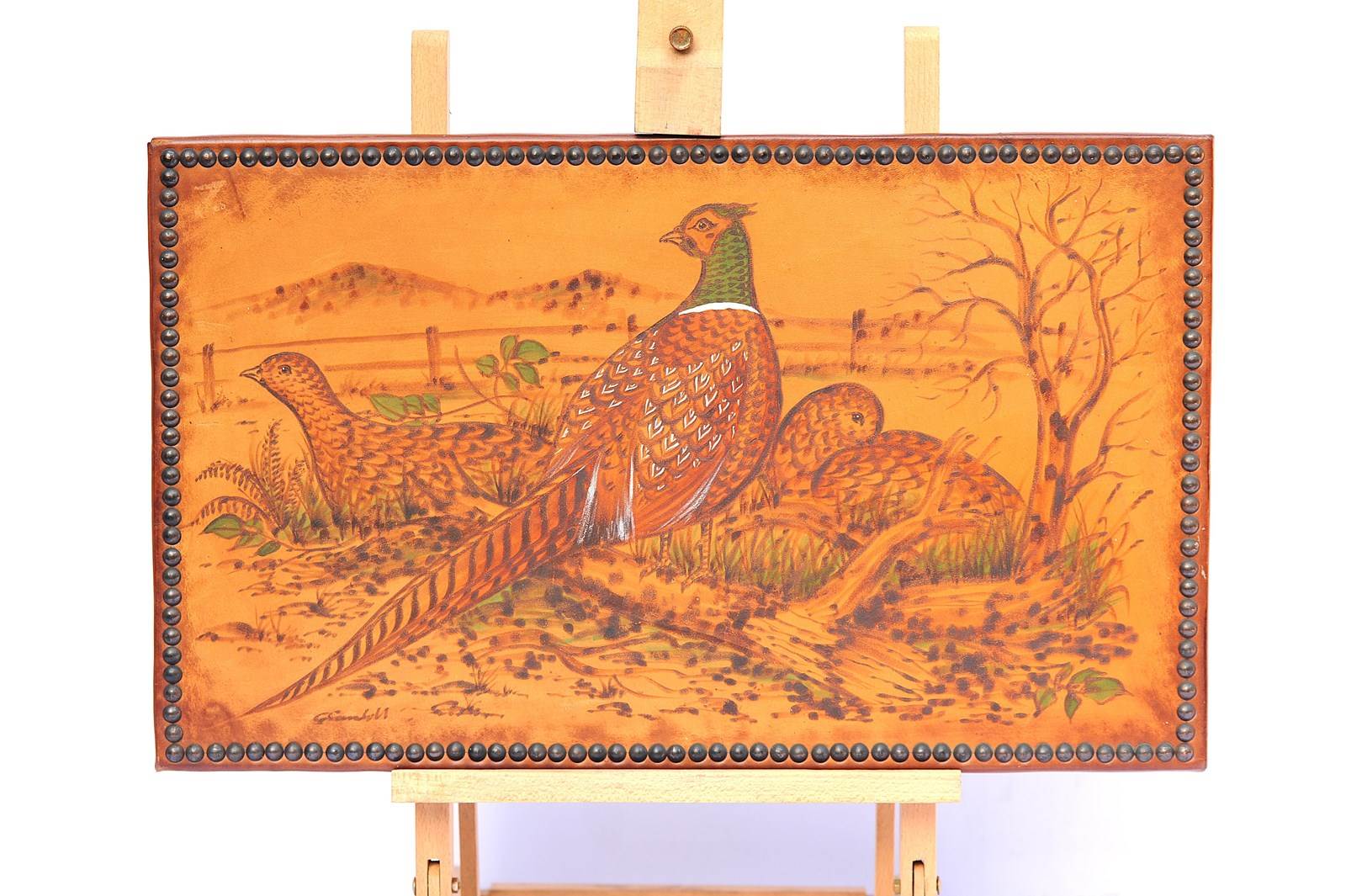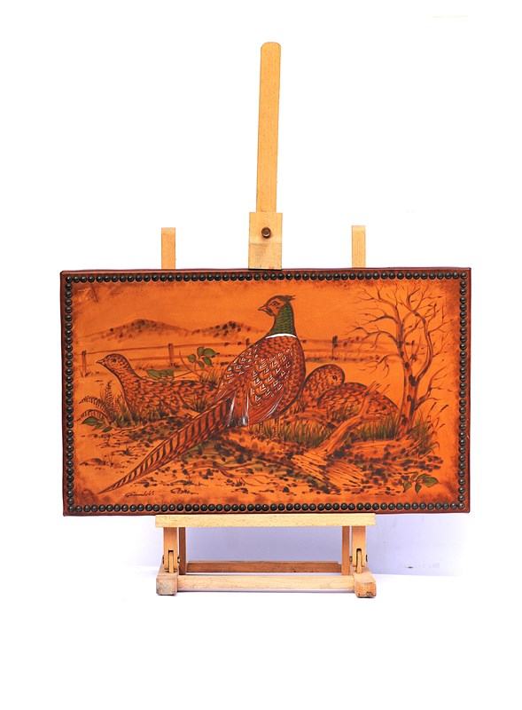 Circa 1980-90 Signed Leather Pokerwork (Pyrography) Pheasant Scene. Edges finished with brass stud work. Size: 23 inches x 14 inches. Good overall condition. Sale includes delivery within the United Kingdom. This could make the ideal to someone.