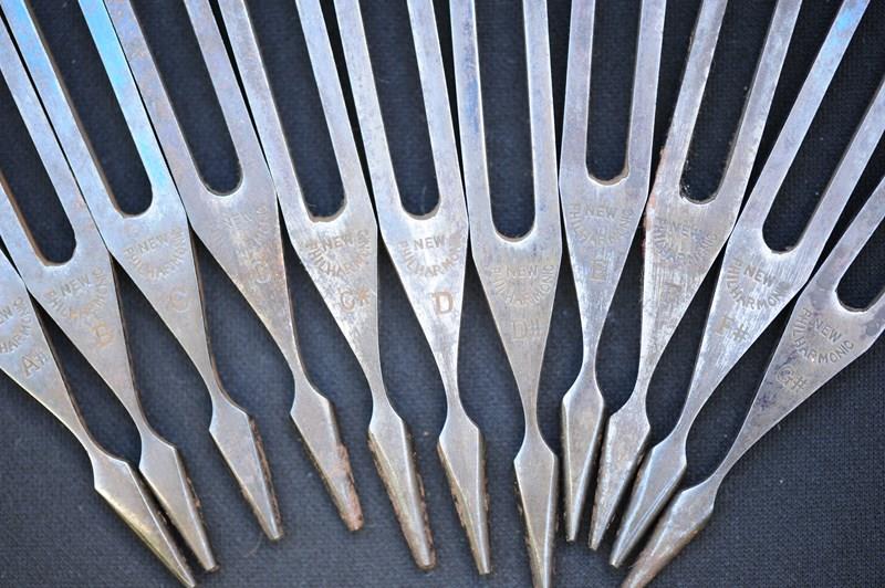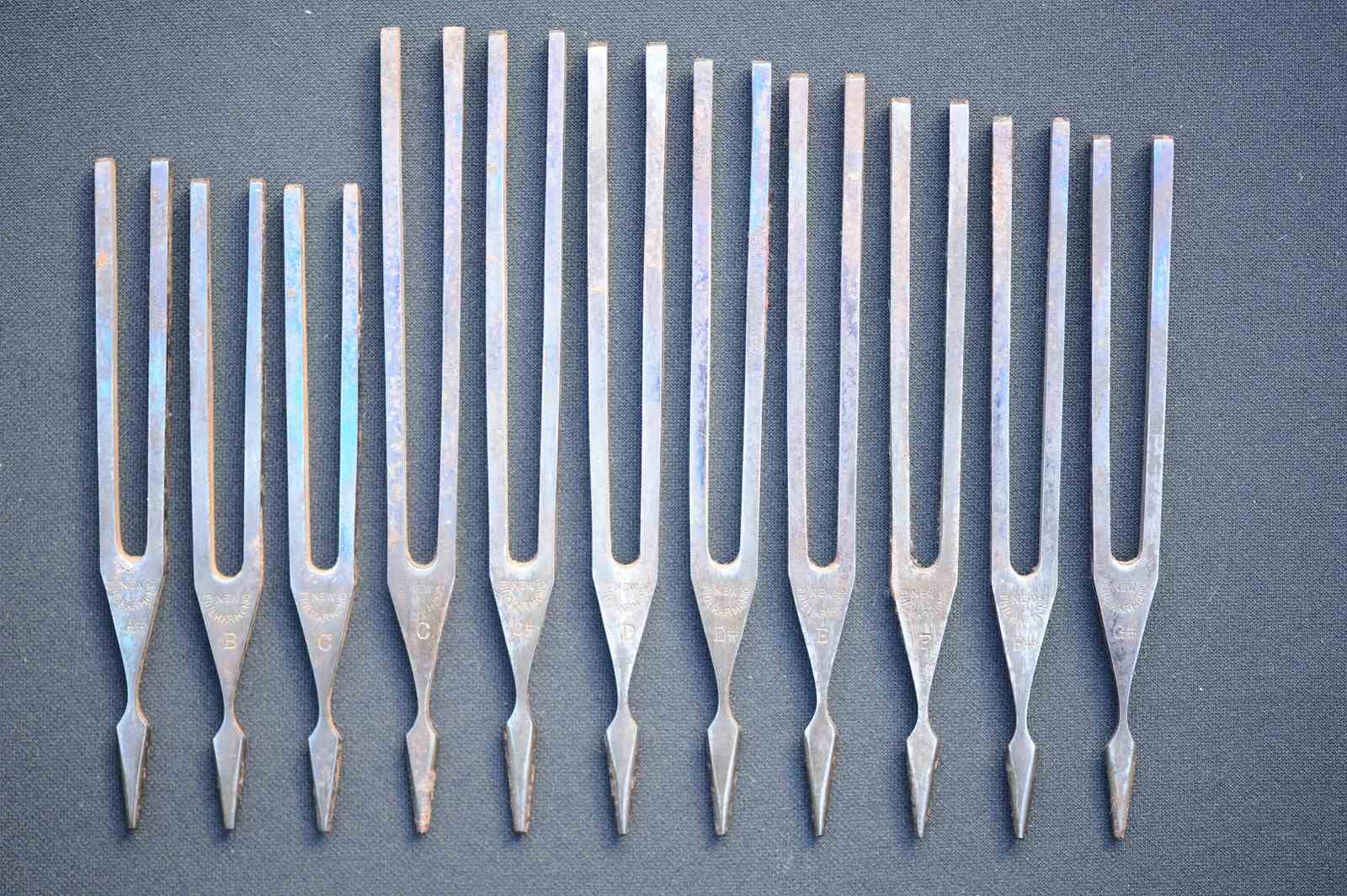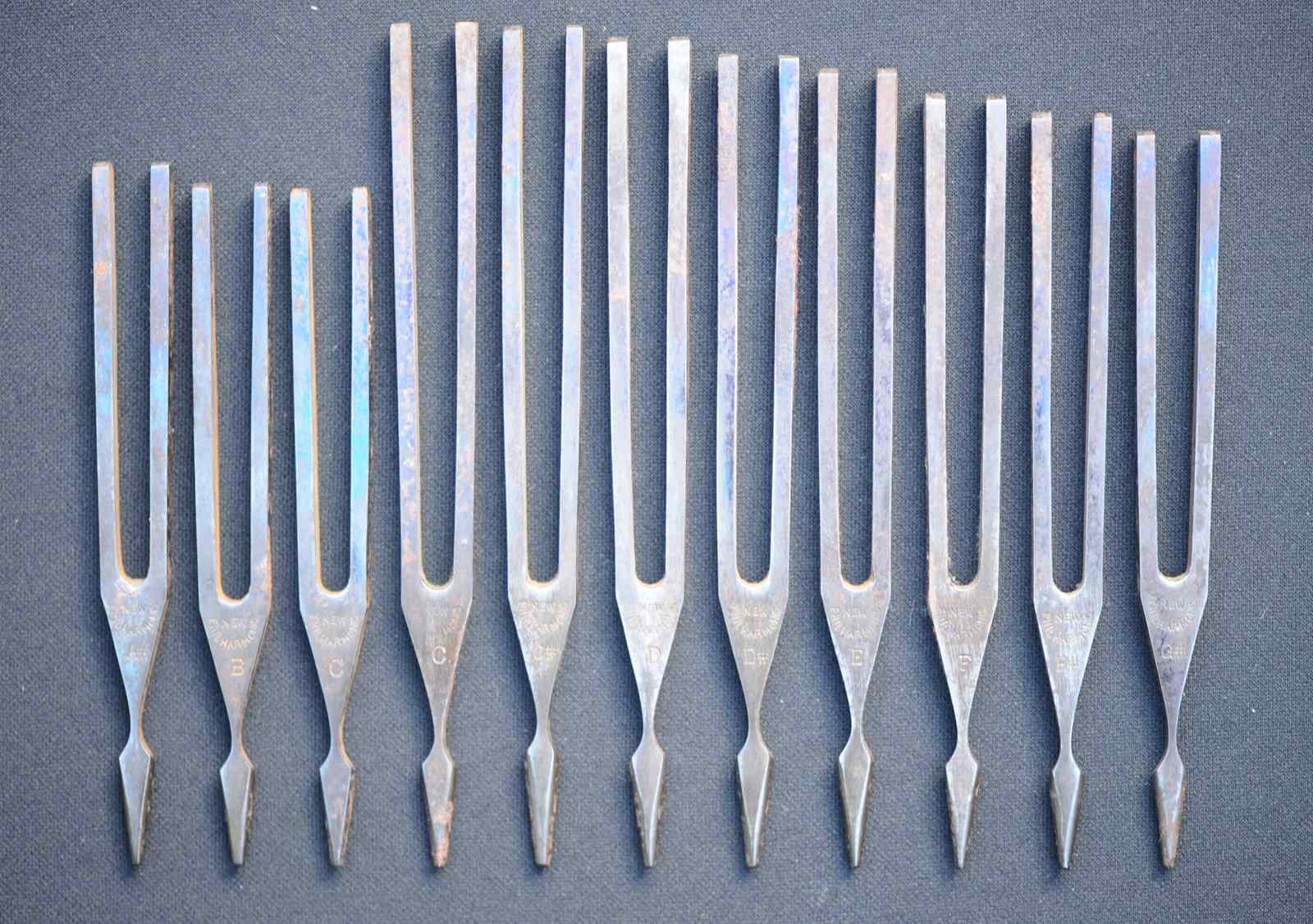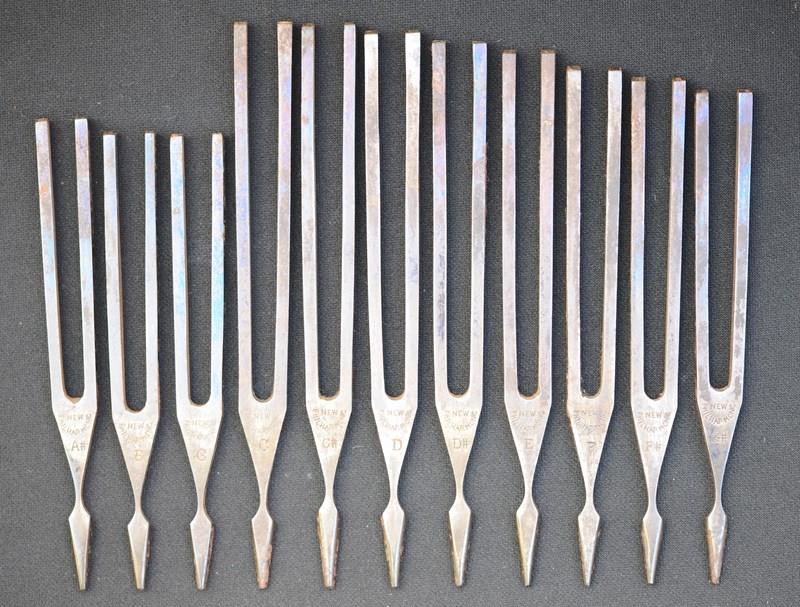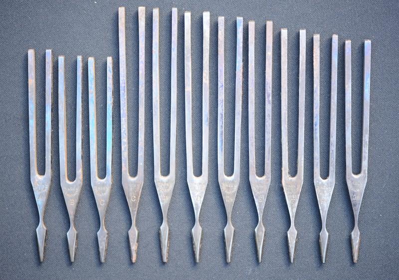 Unusual & rare collection of Eleven late 19th century J & J.Goddard piano calibrating tuning forks. Each approximately 5 to 6 inches in height. Vibration notes as follows A#, B, C, C, C#, D, D#, E, F, F#, G#. All stamped J & J.Goddard, London. New Philharmonic. In good overall condition. Sale is for the collection. Includes UK inland tracked delivery is included.