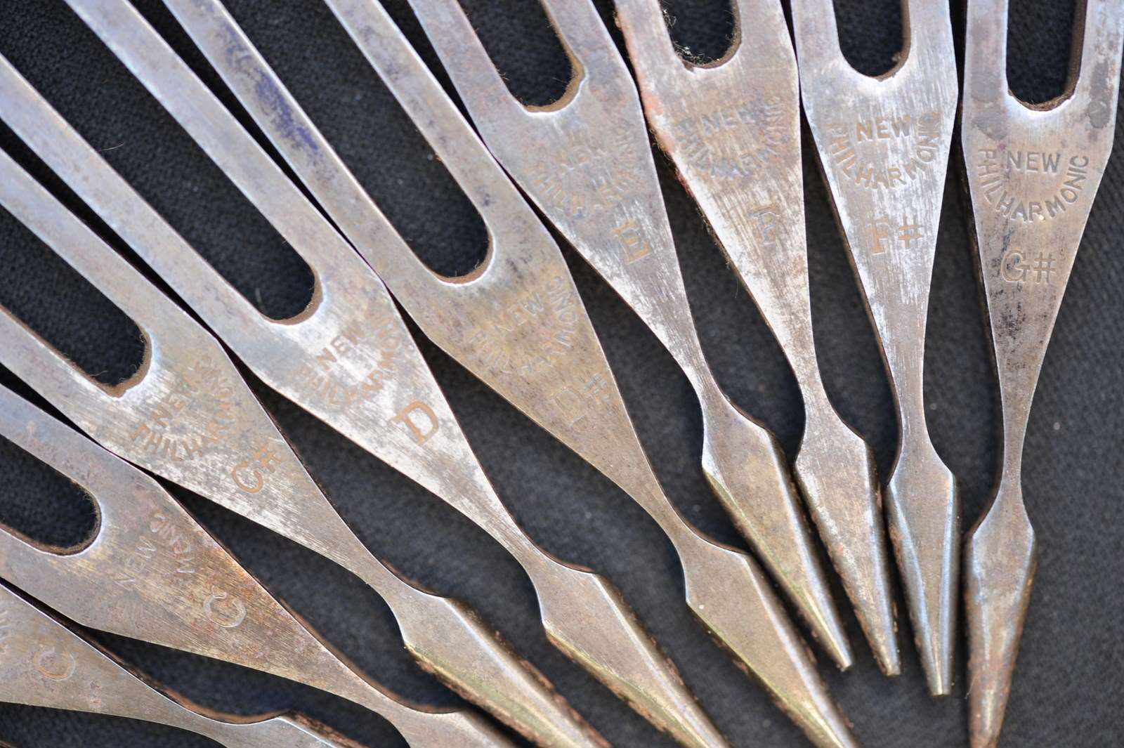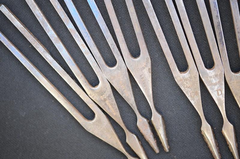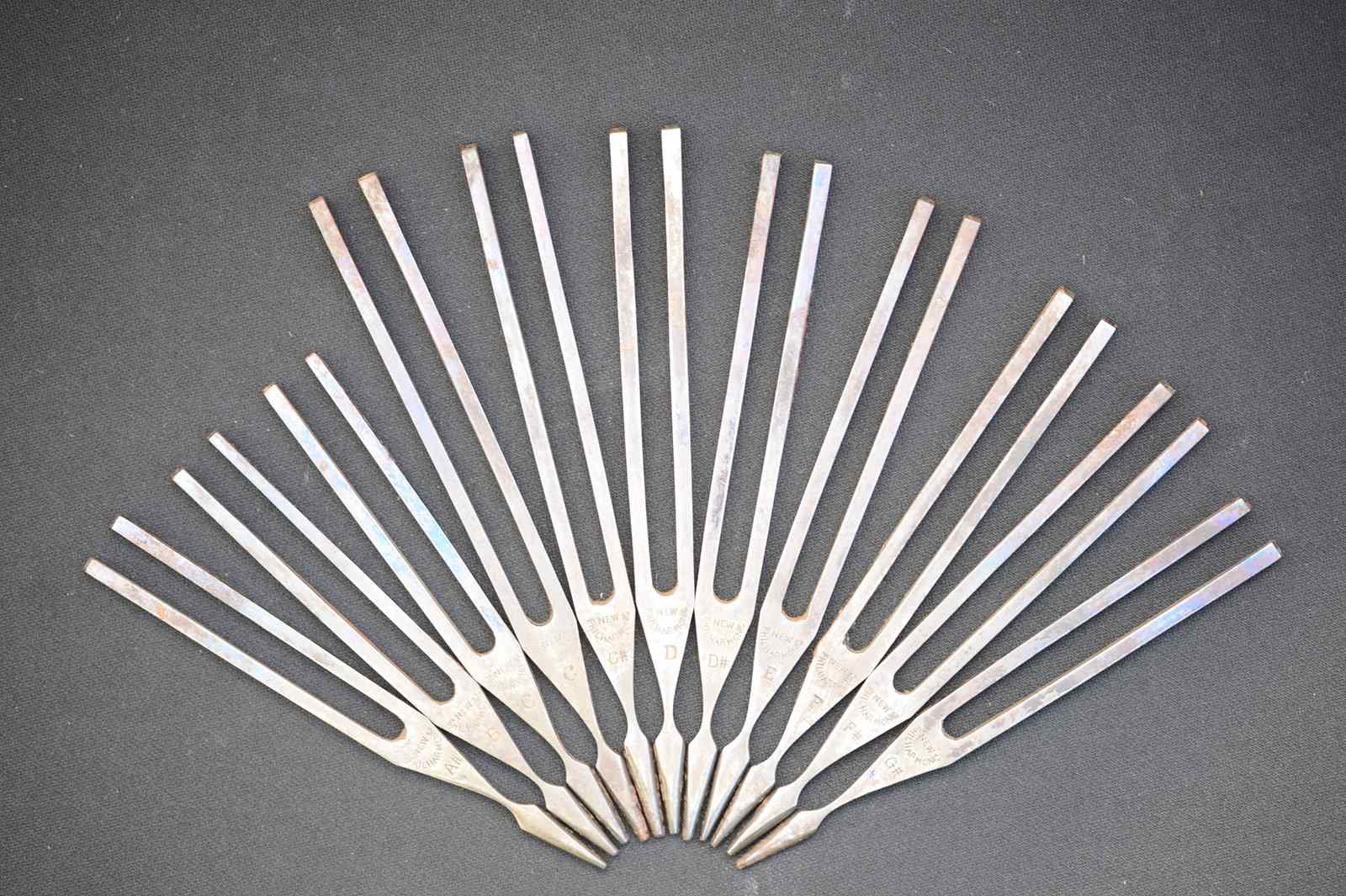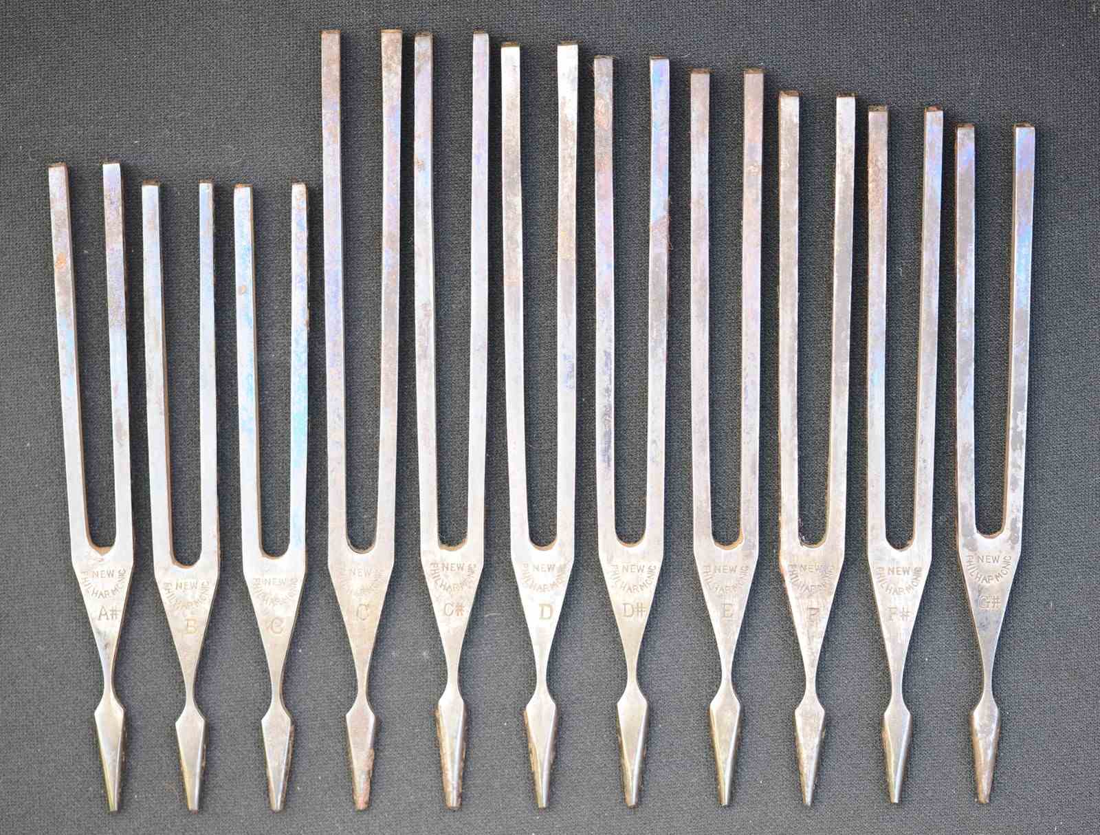 Unusual & rare collection of Eleven late 19th century J & J.Goddard piano calibrating tuning forks. Each approximately 5 to 6 inches in height. Vibration notes as follows A#, B, C, C, C#, D, D#, E, F, F#, G#. All stamped J & J.Goddard, London. New Philharmonic. In good overall condition. Sale is for the collection. Includes UK inland tracked delivery is included.