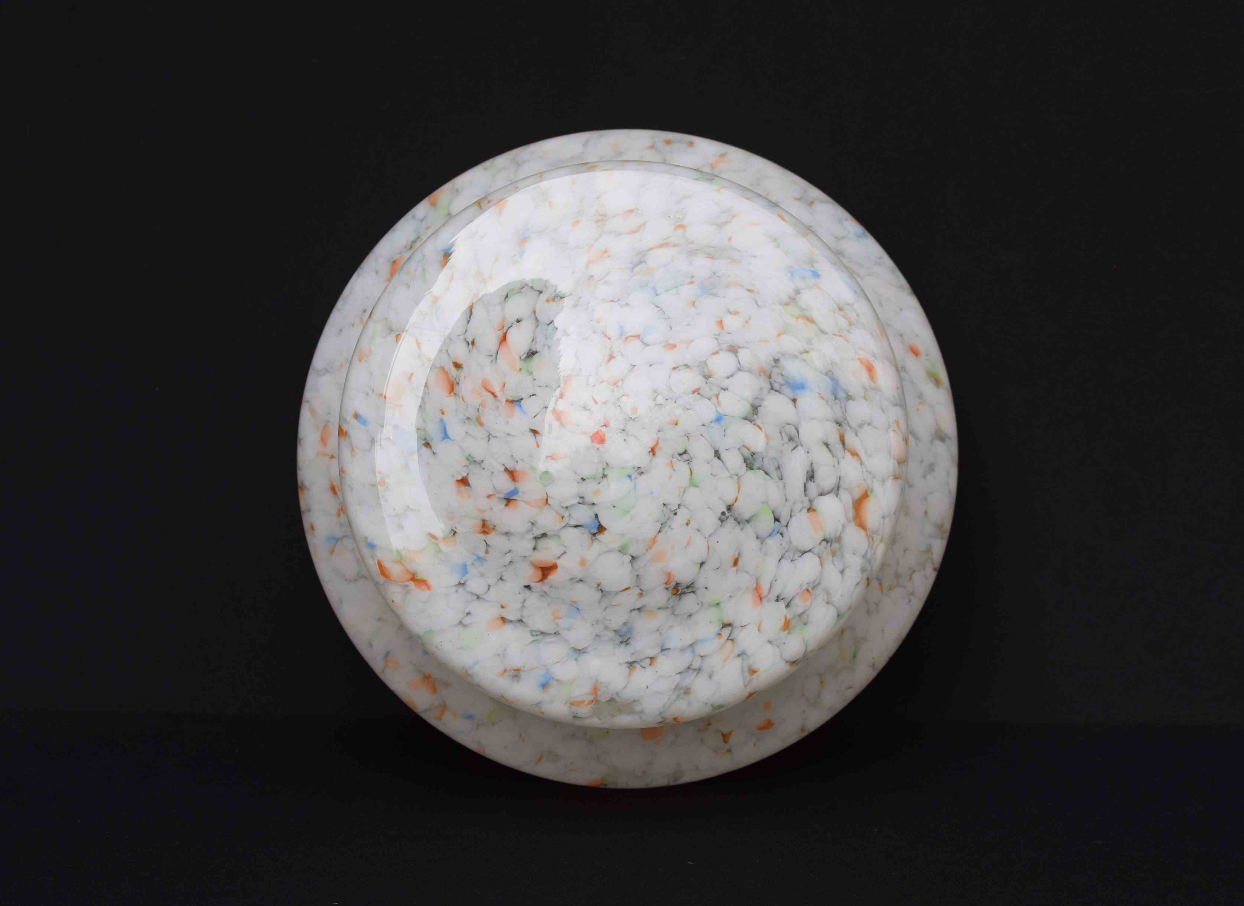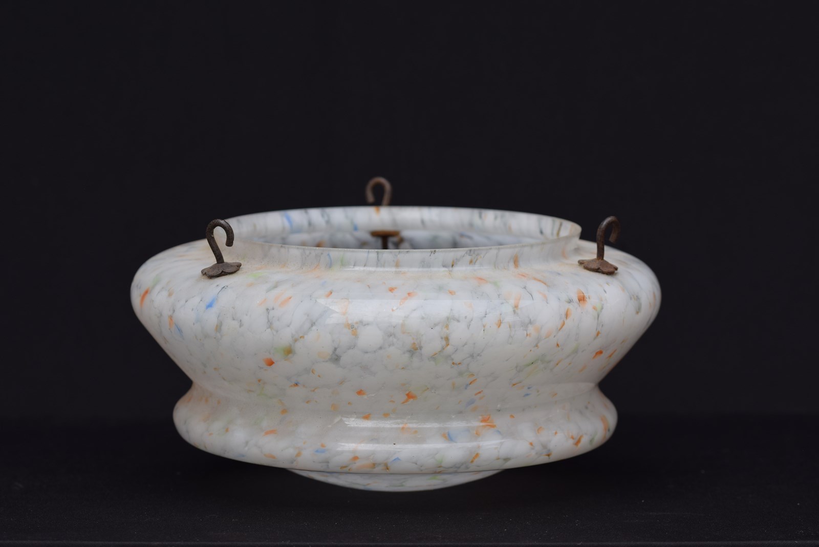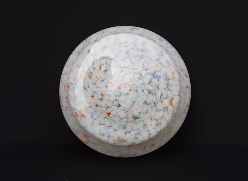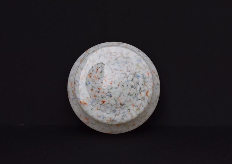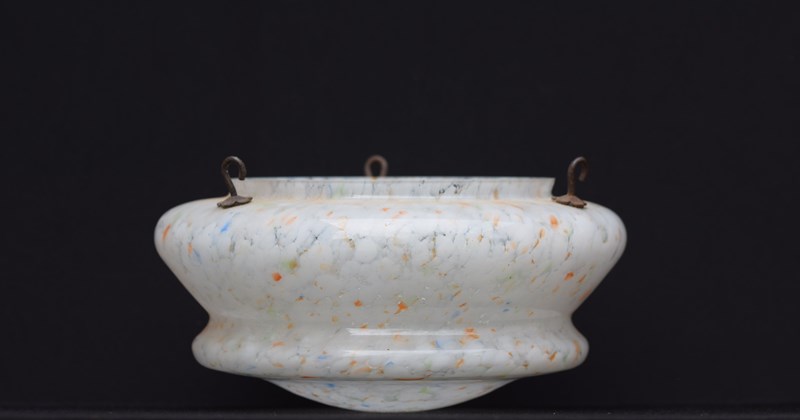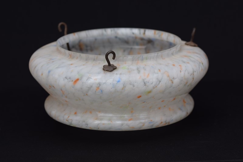 A very good condition English Art Deco period plafonnier or flycatcher glass shade. Mottled & marbled glass with whites, oranges, blues, greens etc. Supplied with the original hanging chains , no ceiling hook. Approximately 11.5 inches in diameter & 5.5 inches in depth. Sale includes delivery within the United Kingdom, it will be packed well.